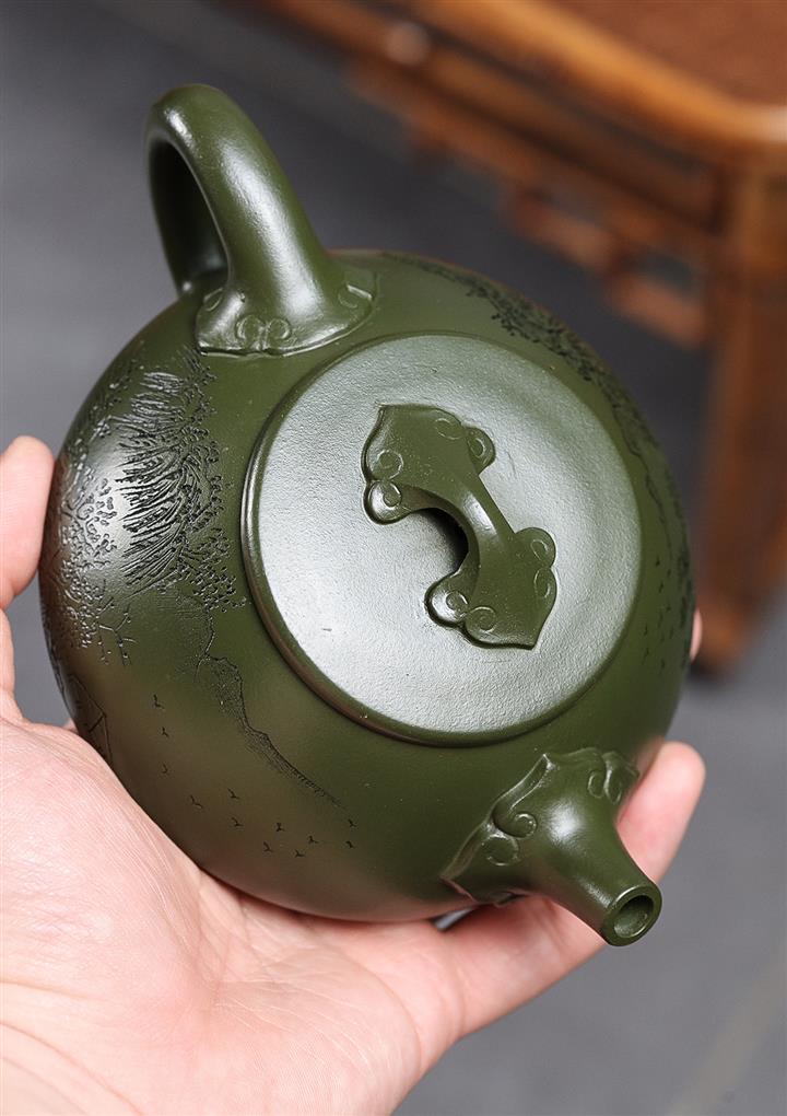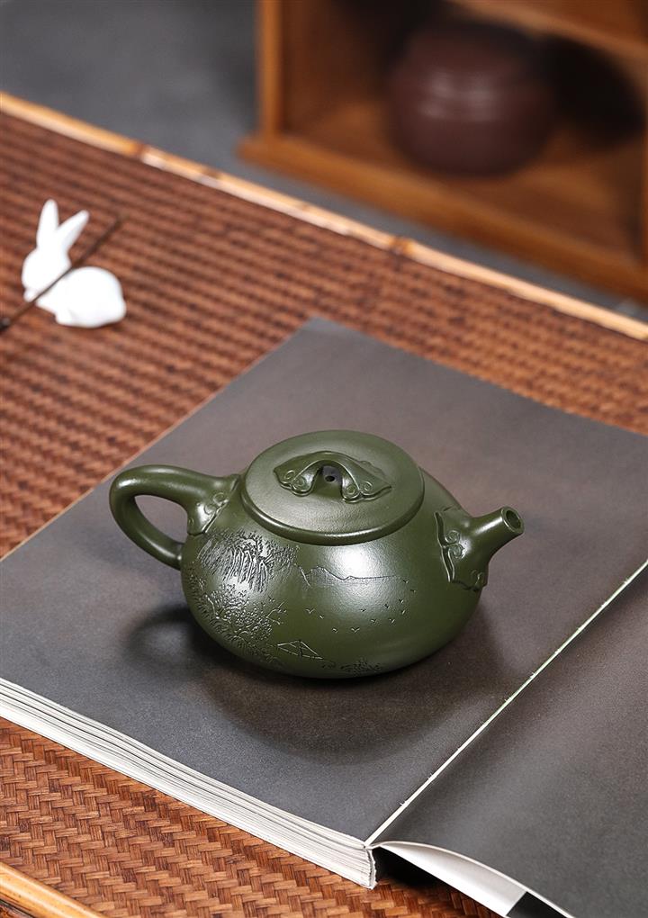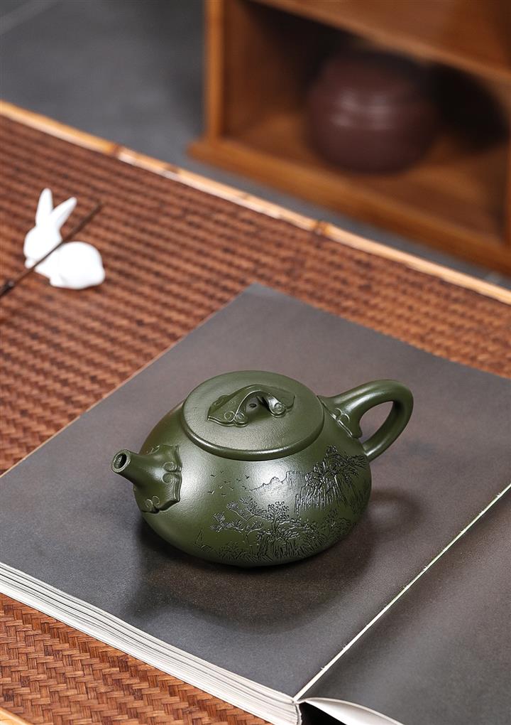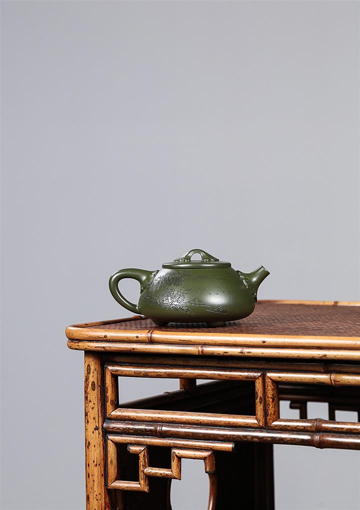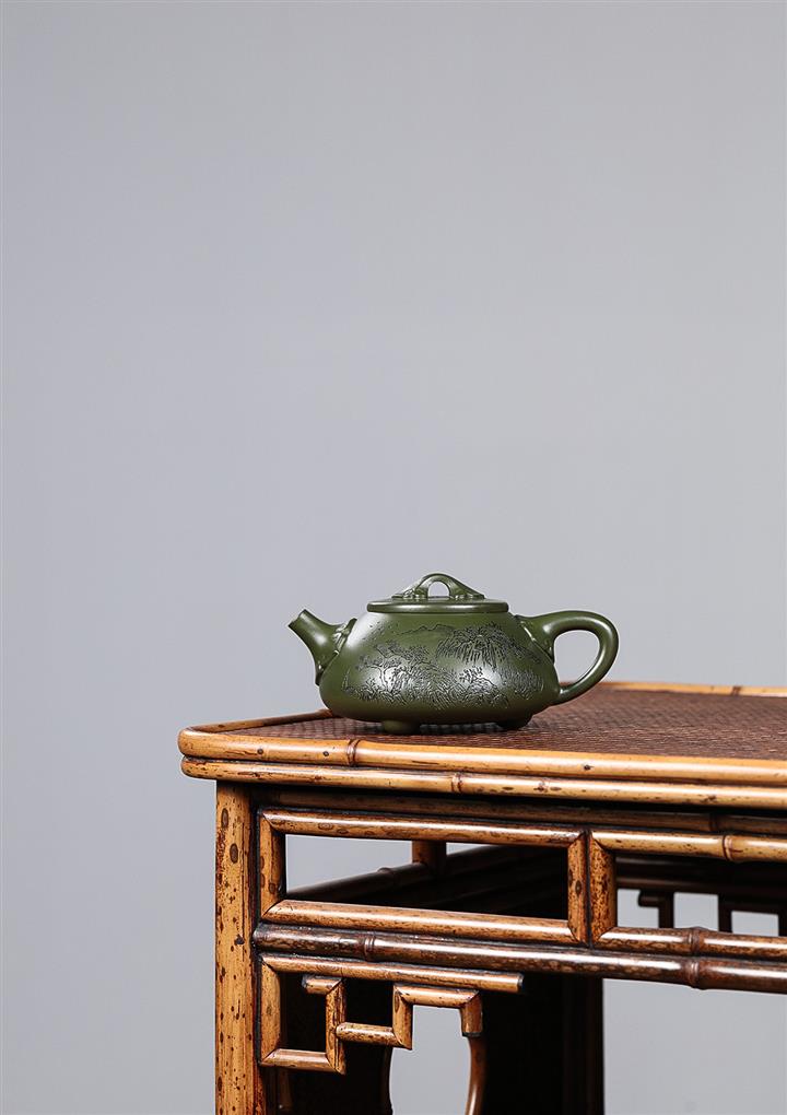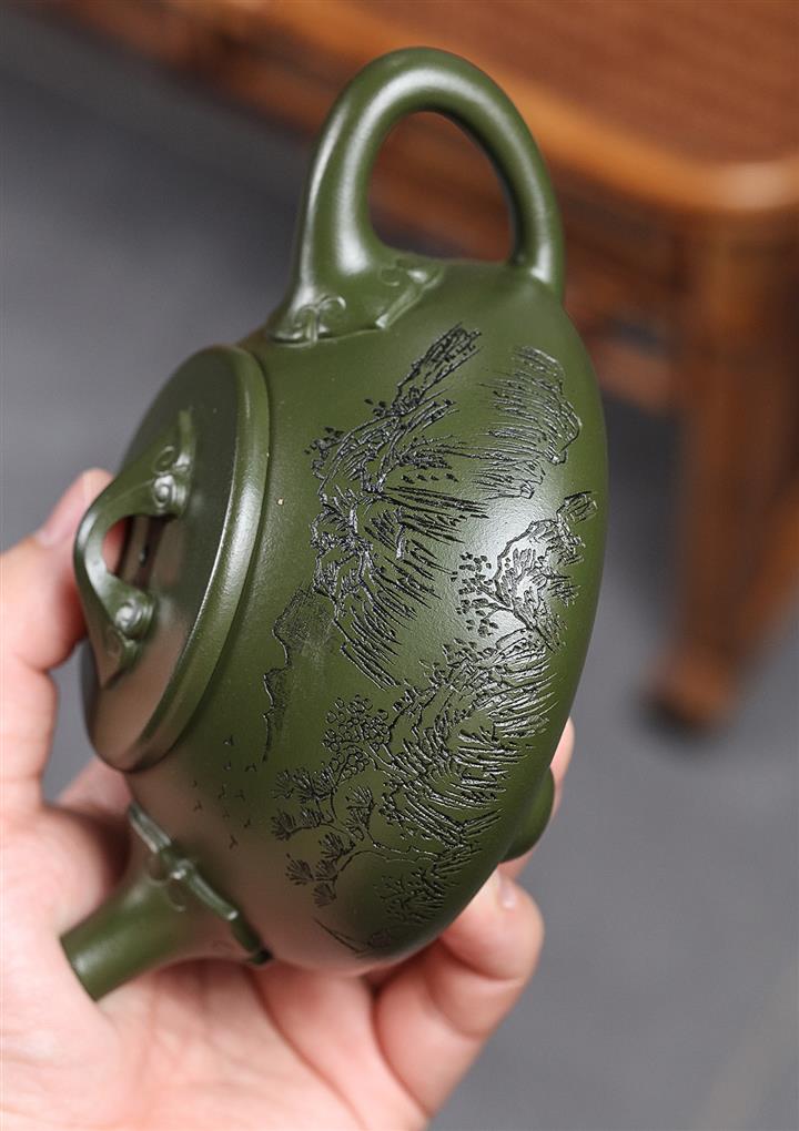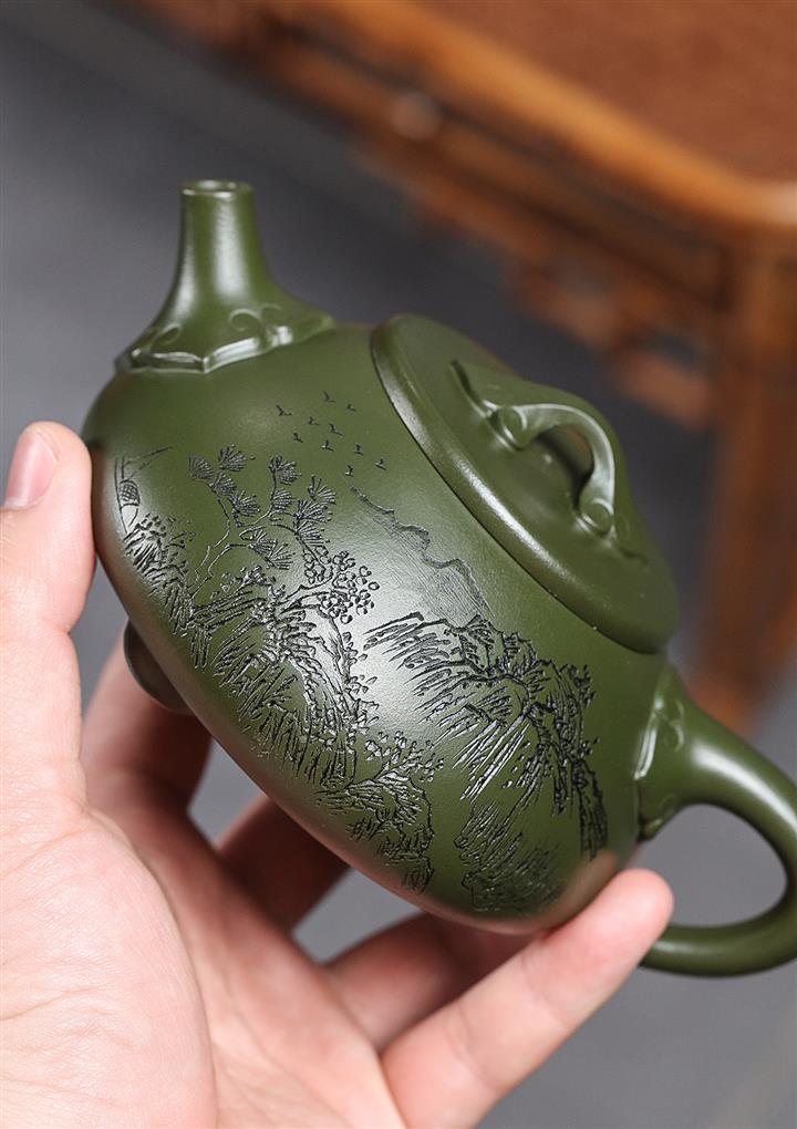 原礦綠泥山水如意石瓢手工刻繪POT3985