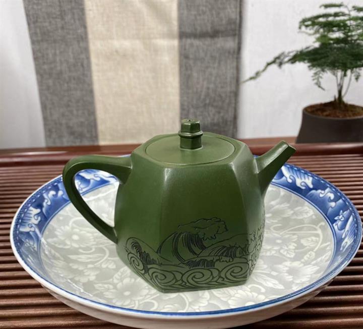 紫砂壺稀有翡翠綠泥六方漢鐸純手工刻繪POT3998