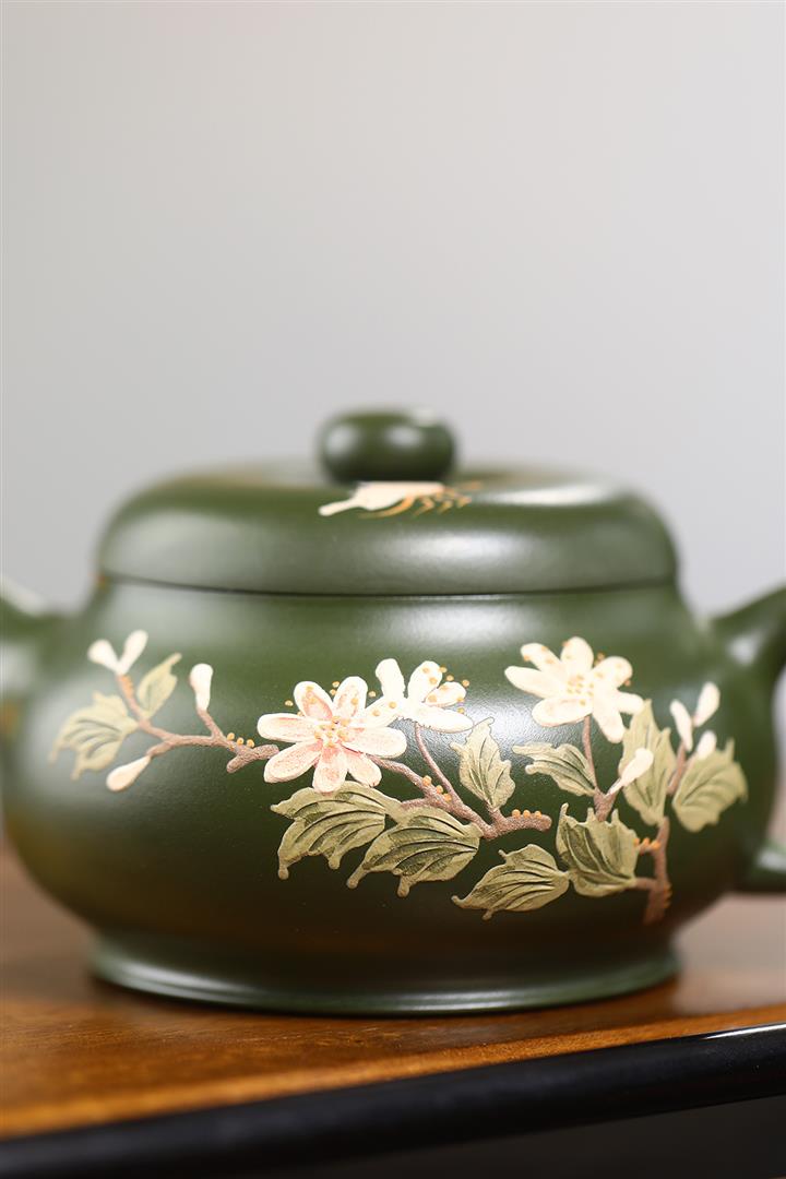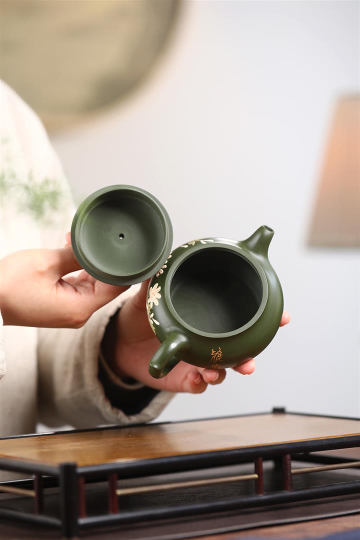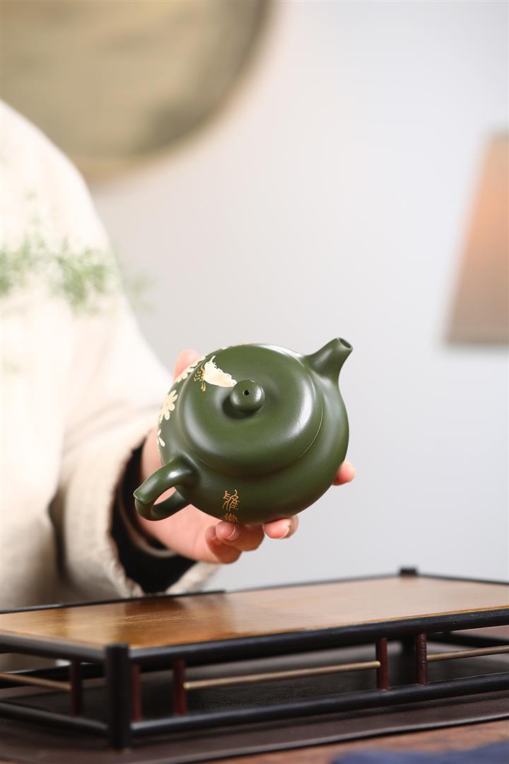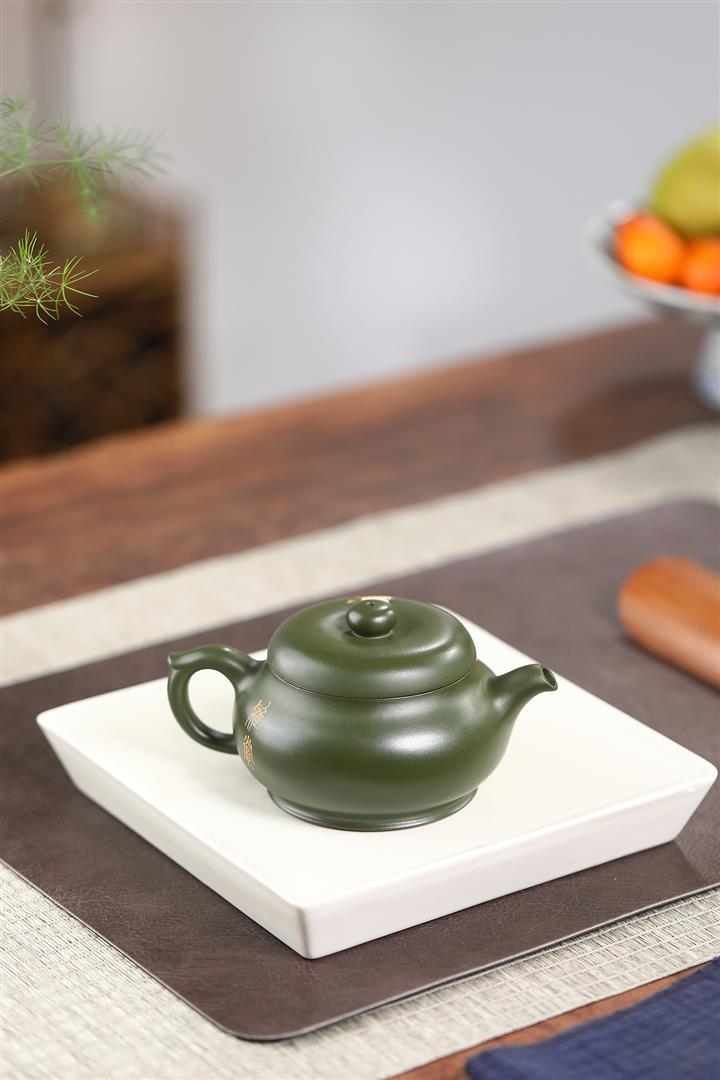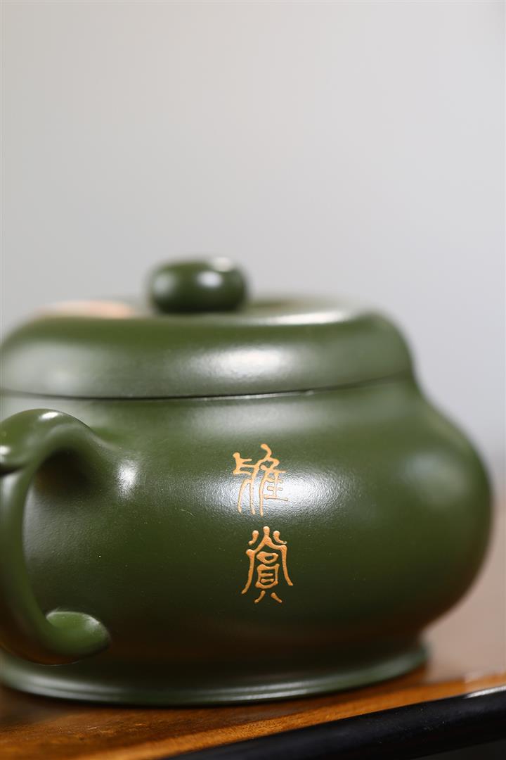 紫砂壺稀有翡翠綠泥六方漢鐸純手工刻繪POT3998