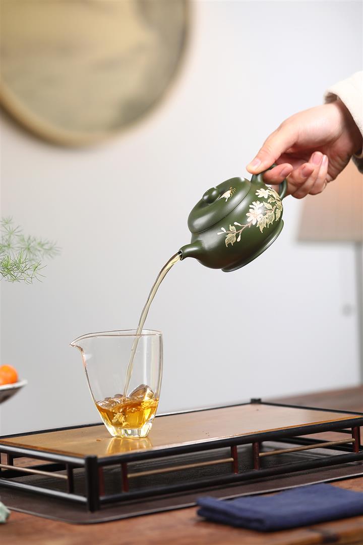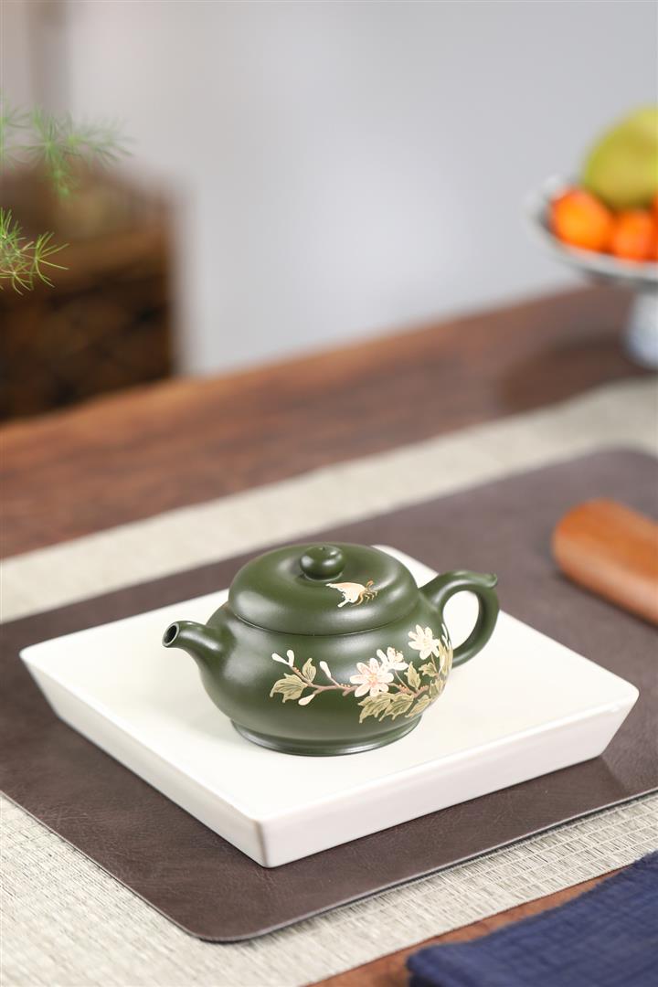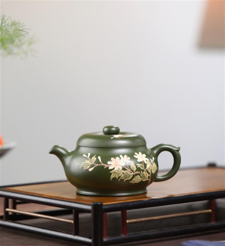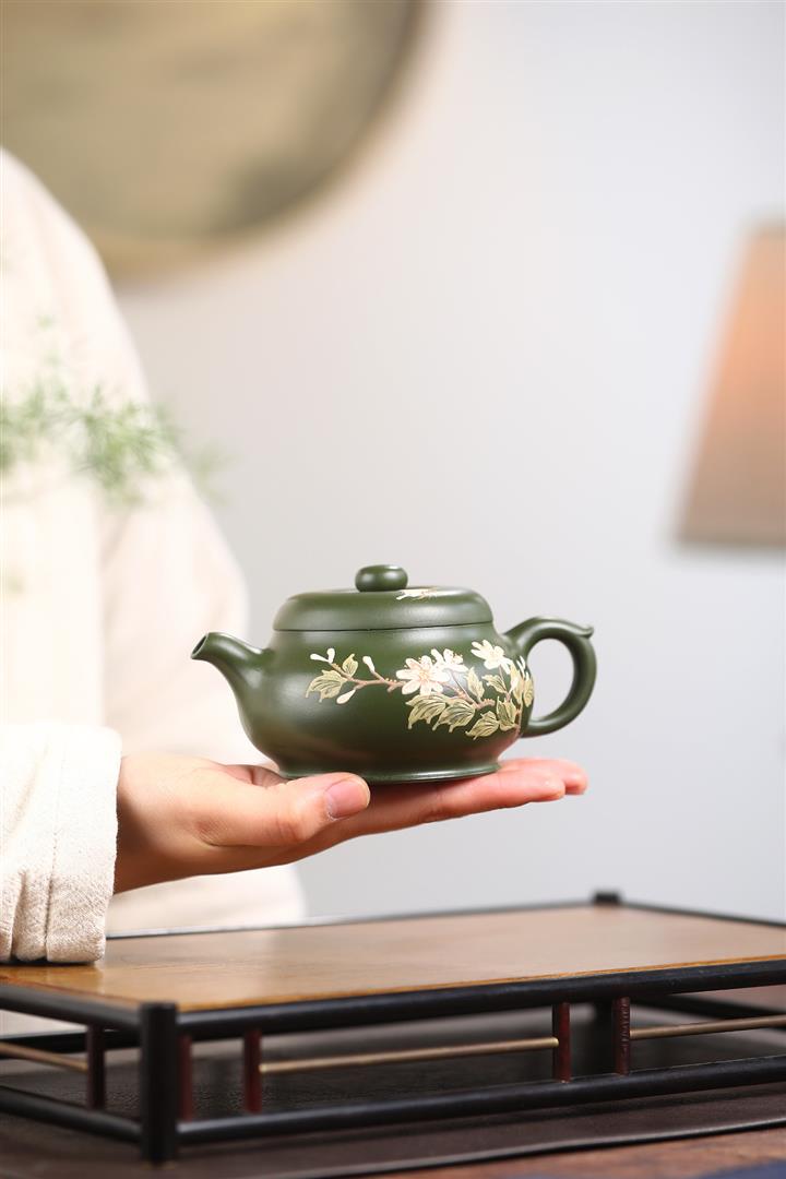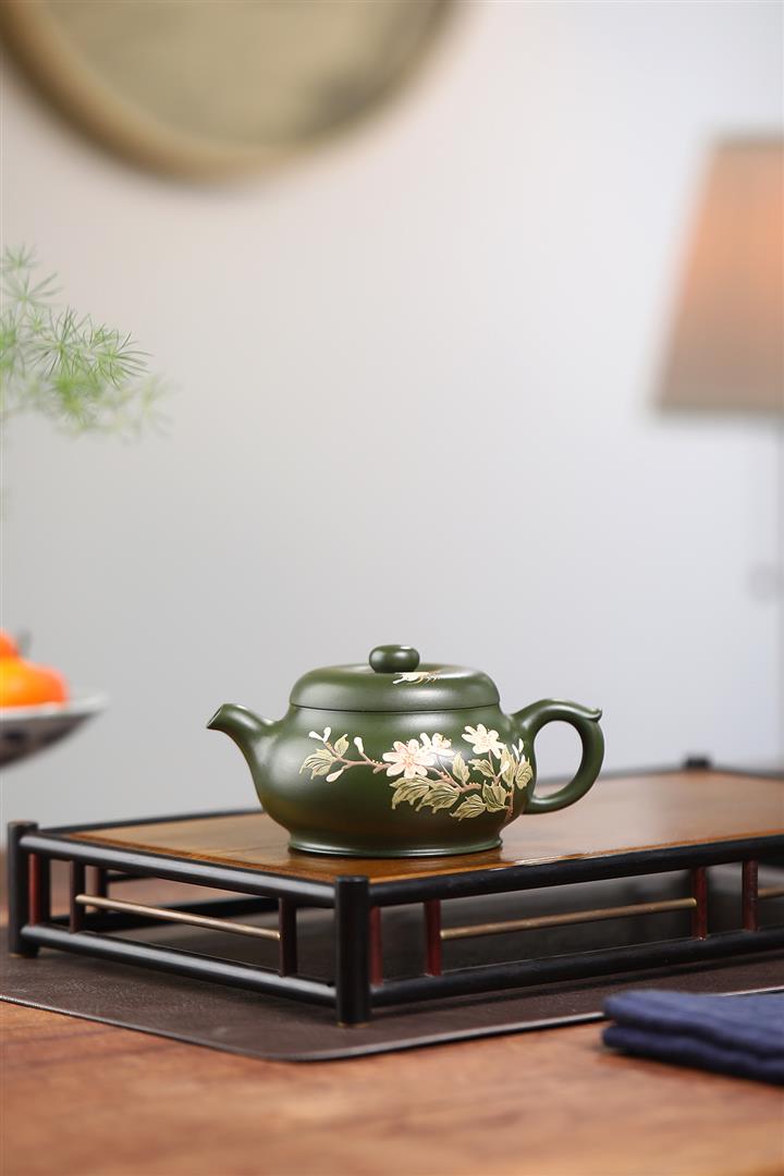 紫砂壺稀有翡翠綠泥六方漢鐸純手工刻繪POT3998