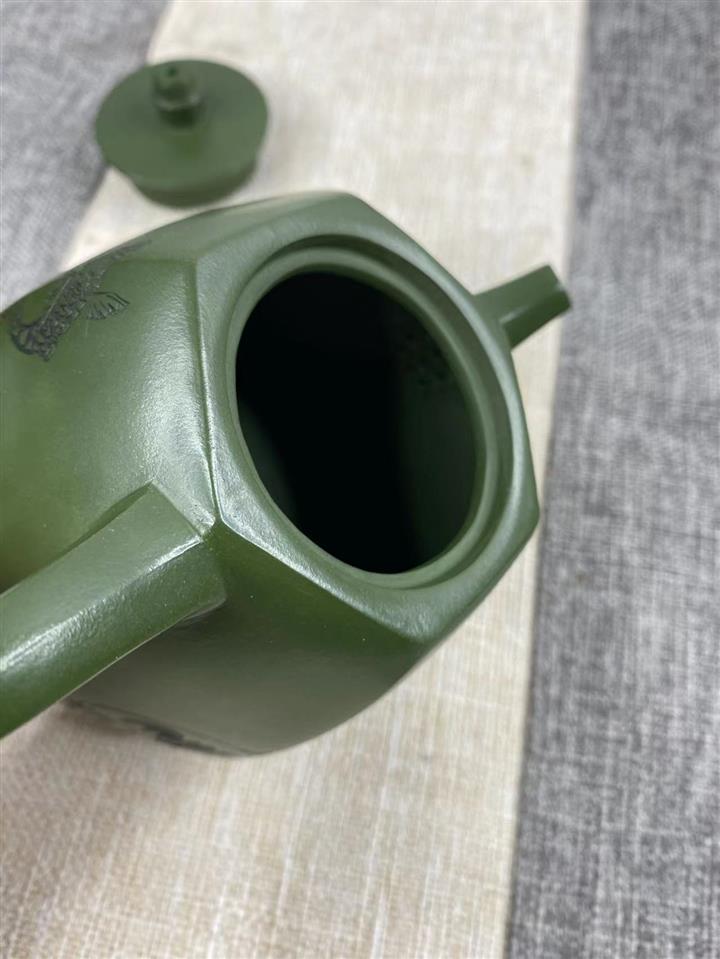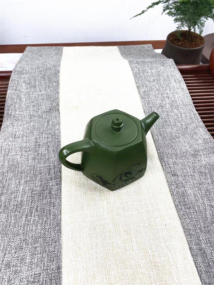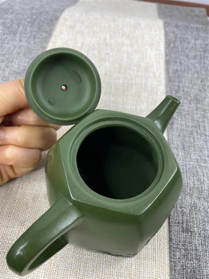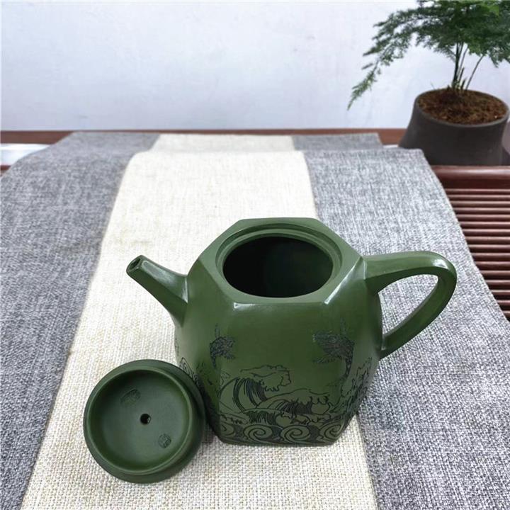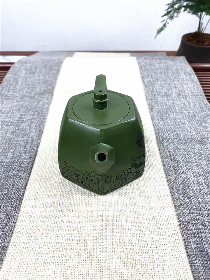紫砂壺稀有翡翠綠泥六方漢鐸純手工刻繪POT3998