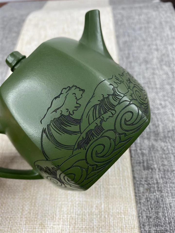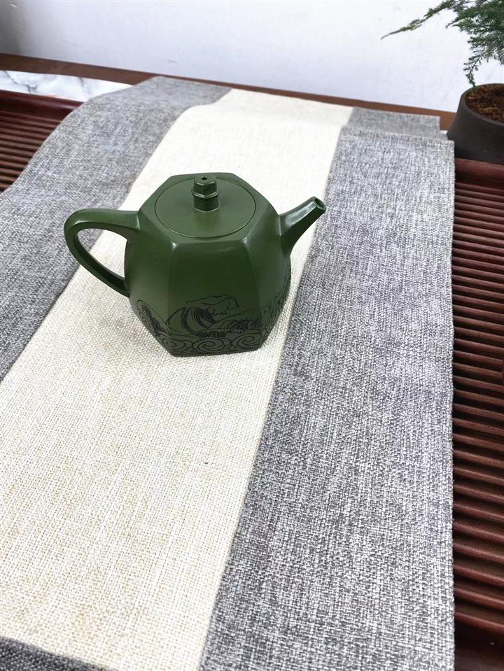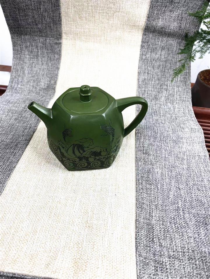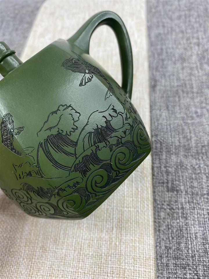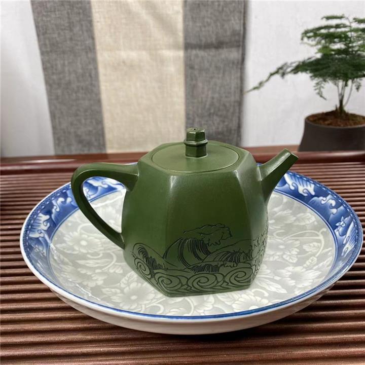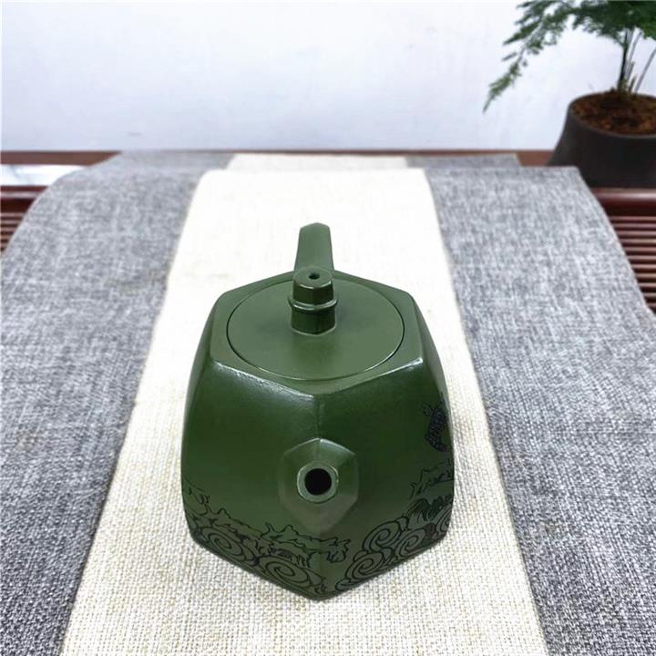 紫砂壺稀有翡翠綠泥六方漢鐸純手工刻繪POT3998