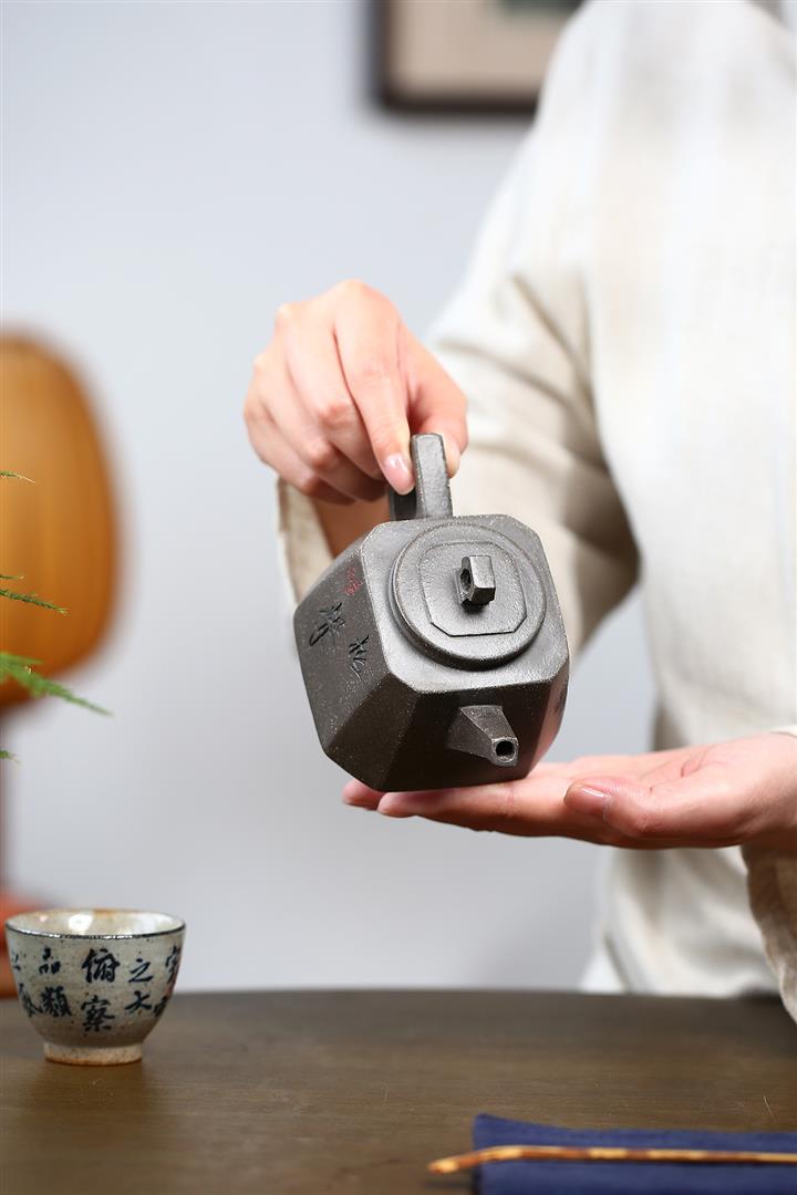 【簡介】壺鈕狀似倒掛的方鐘,大方的耳把,線條明朗流暢的三彎流舌口嘴,壺嘴外方內圓,壺身每一個平面都挺括有力,壺蓋微隆,的子與壺蓋之間有鈕座相連。器型整體器宇軒昂,大氣凜然。