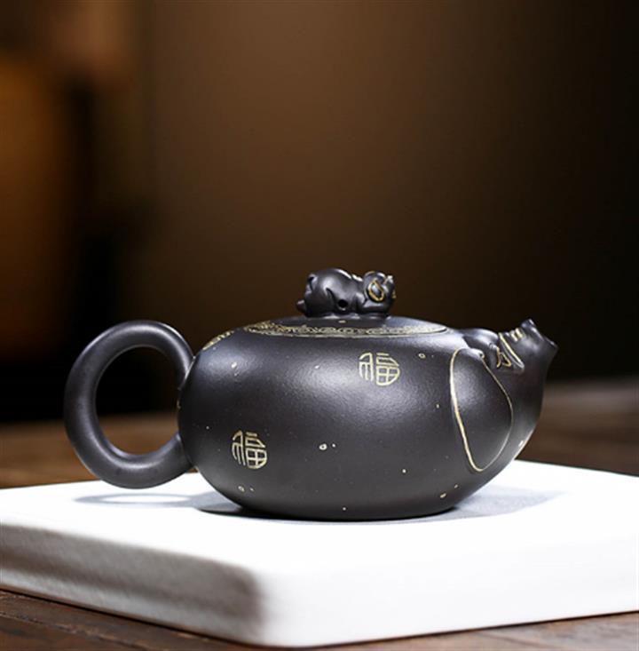 原礦高黑泥描金豬壺招財納福泡茶器POT3943
