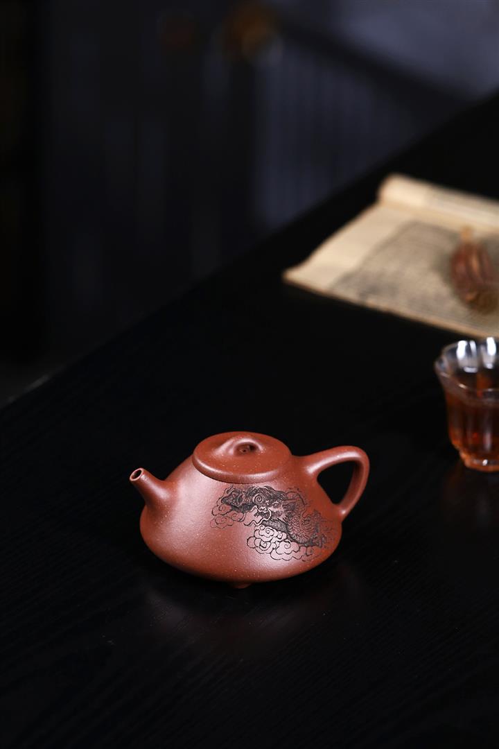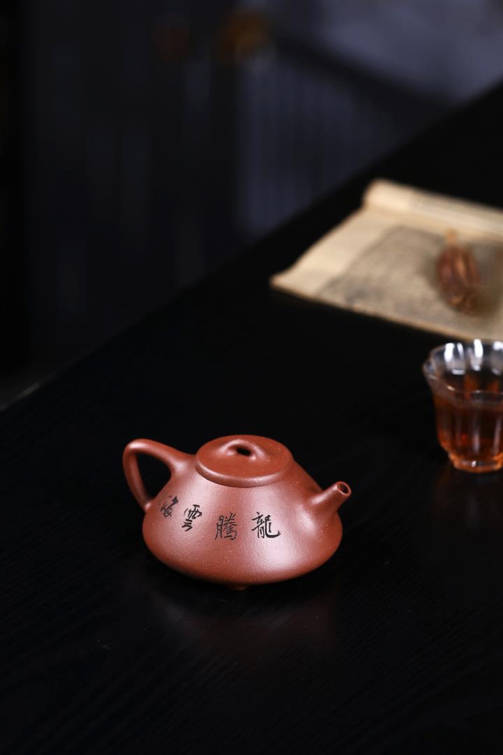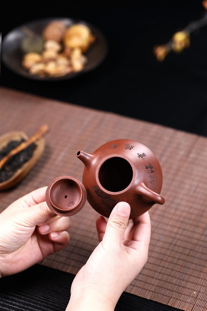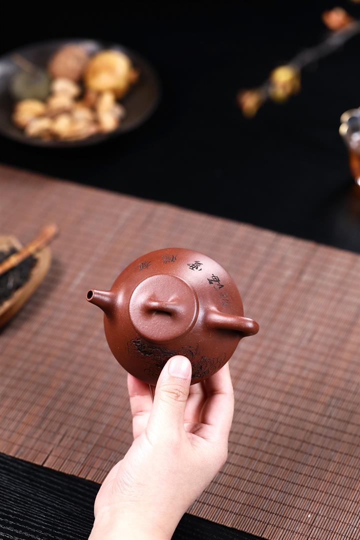 原礦朱泥紫砂壺手工刻繪扁瓢壺POT4043