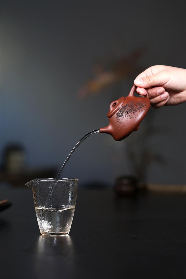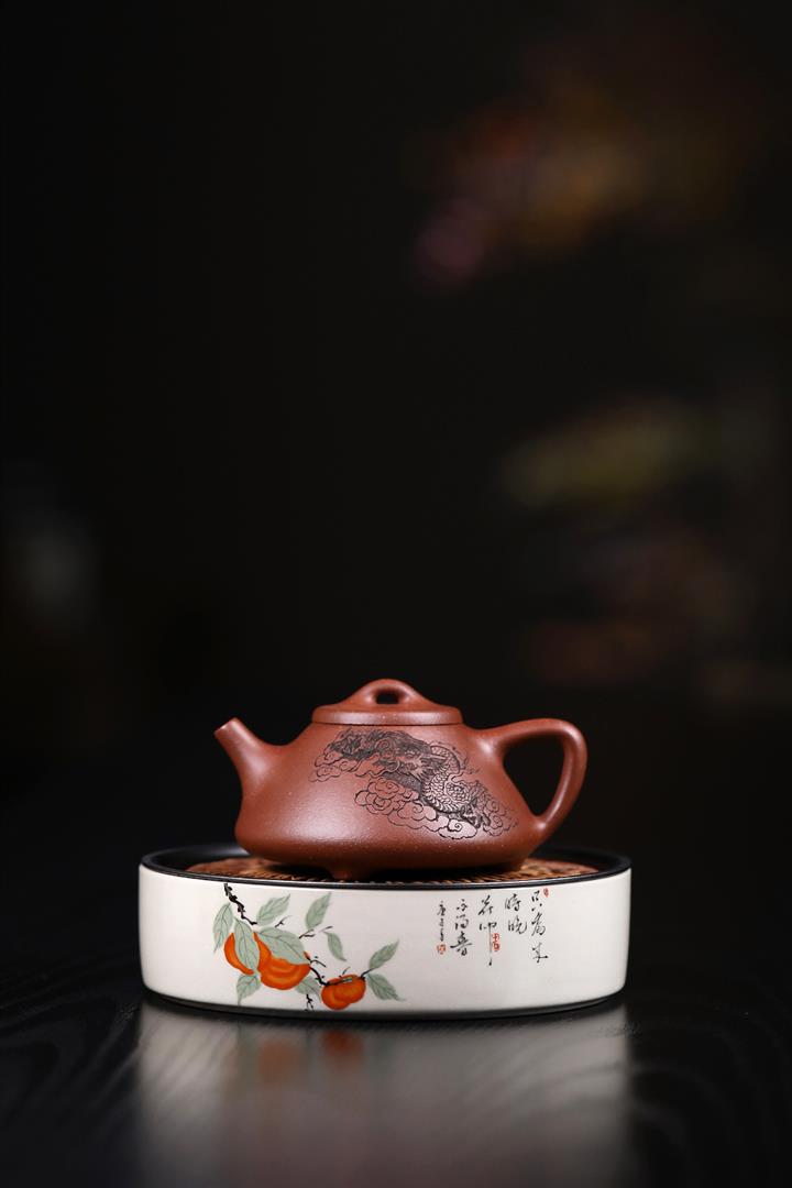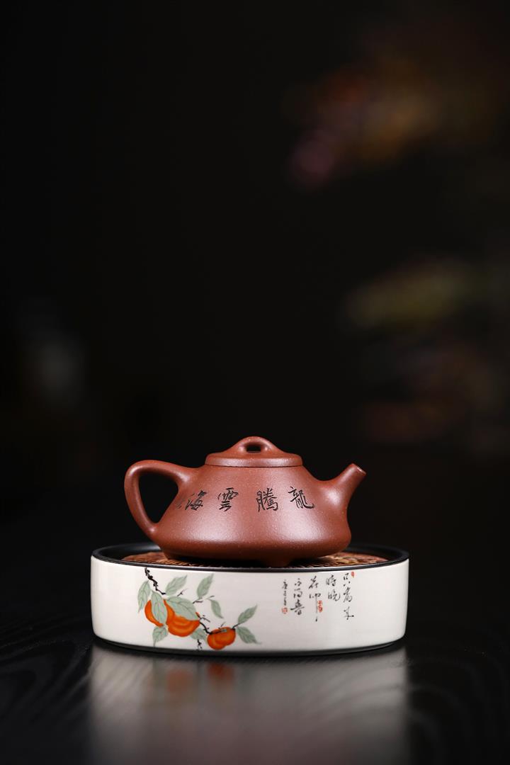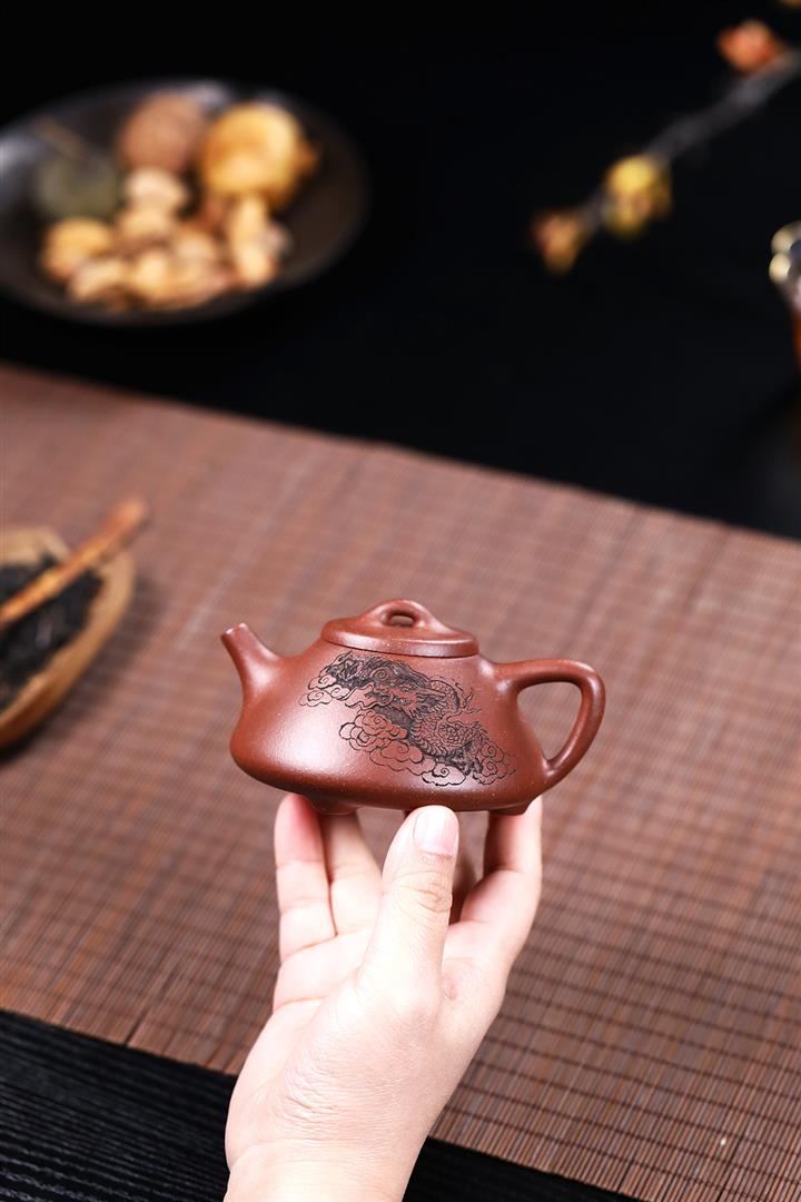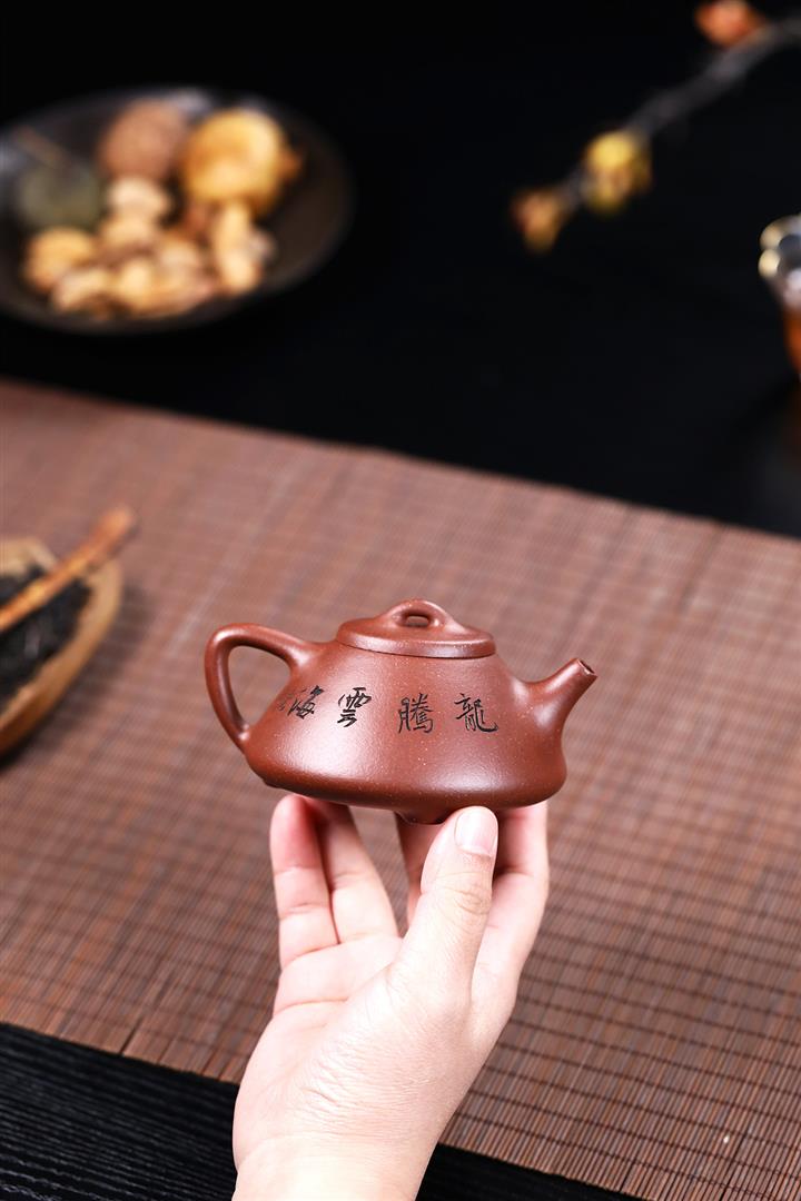 原礦朱泥紫砂壺手工刻繪扁瓢壺POT4043