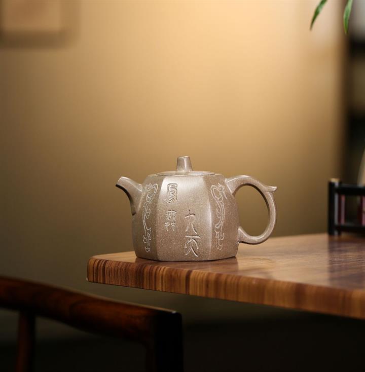 【簡介】此壺以方器為基調,壺體四面方正,壺腹以梯形狀示出,秀出壺身俊逸周正之姿,壺底烘托出壺體剛健婀娜之態。流把同樣以四方之形設計,彰顯肅穆之氣勢,壺蓋之上以瑞獸設計,精巧靈動,象征吉祥,有祥瑞之氣。整體造型與紋樣,和諧統一,樸雅敦厚。
