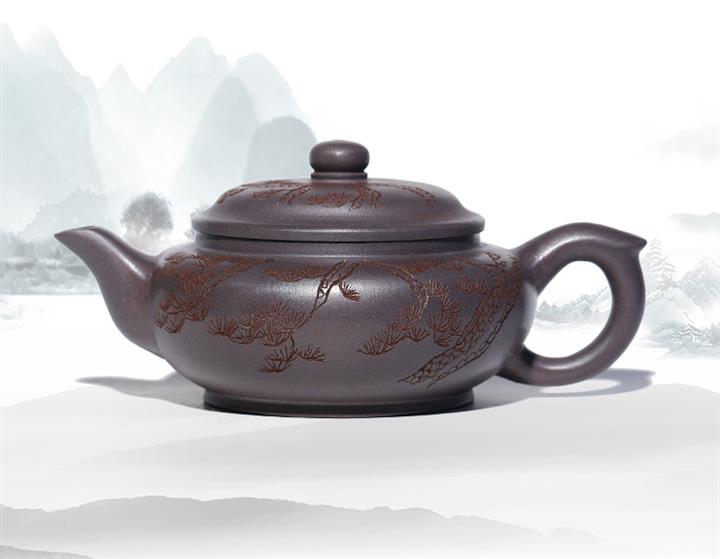 原礦天青泥紫砂壺全手工刻畫松風扁韻茶壺POT4057