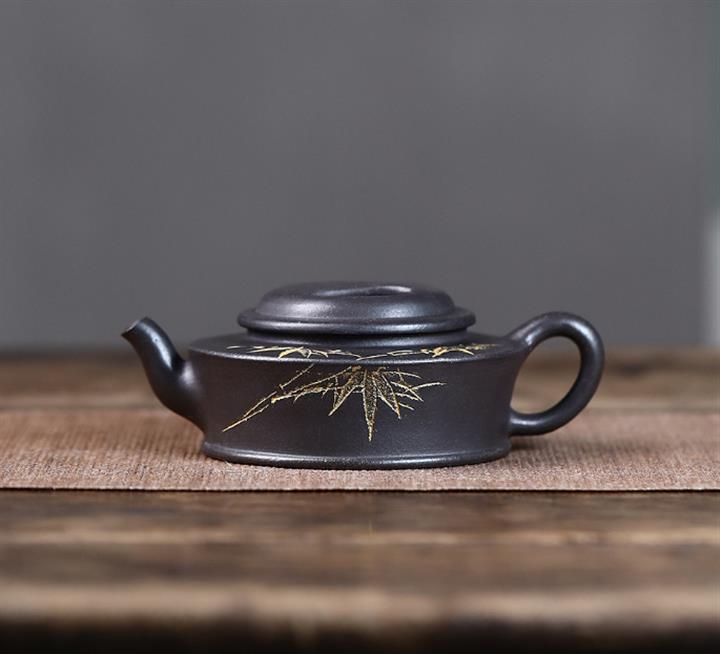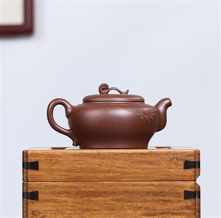 原礦朱泥紫砂壺手工刻繪扁瓢壺POT4043