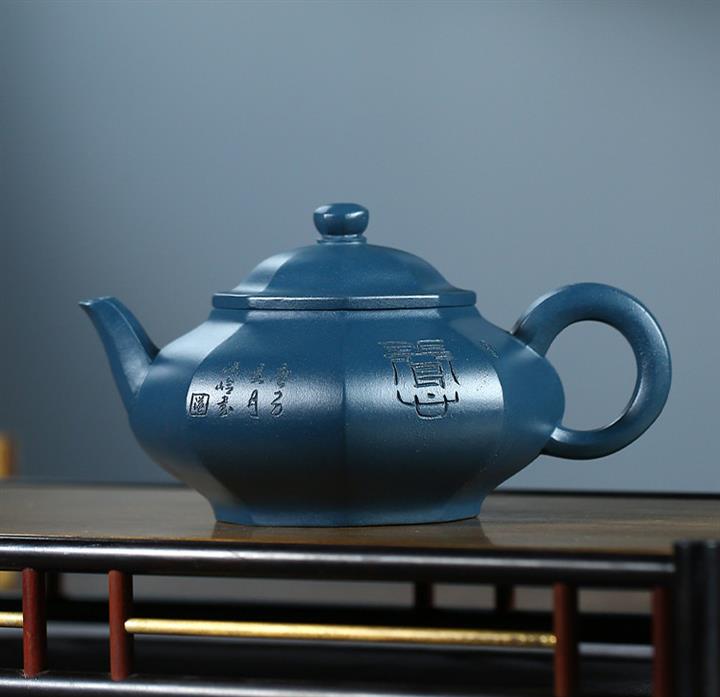 原礦天青泥紫砂壺全手工刻畫松風扁韻茶壺POT4057