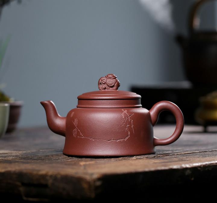 原礦朱泥紫砂壺手工刻繪扁瓢壺POT4043