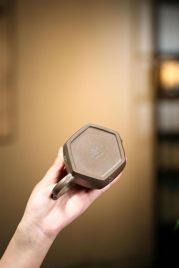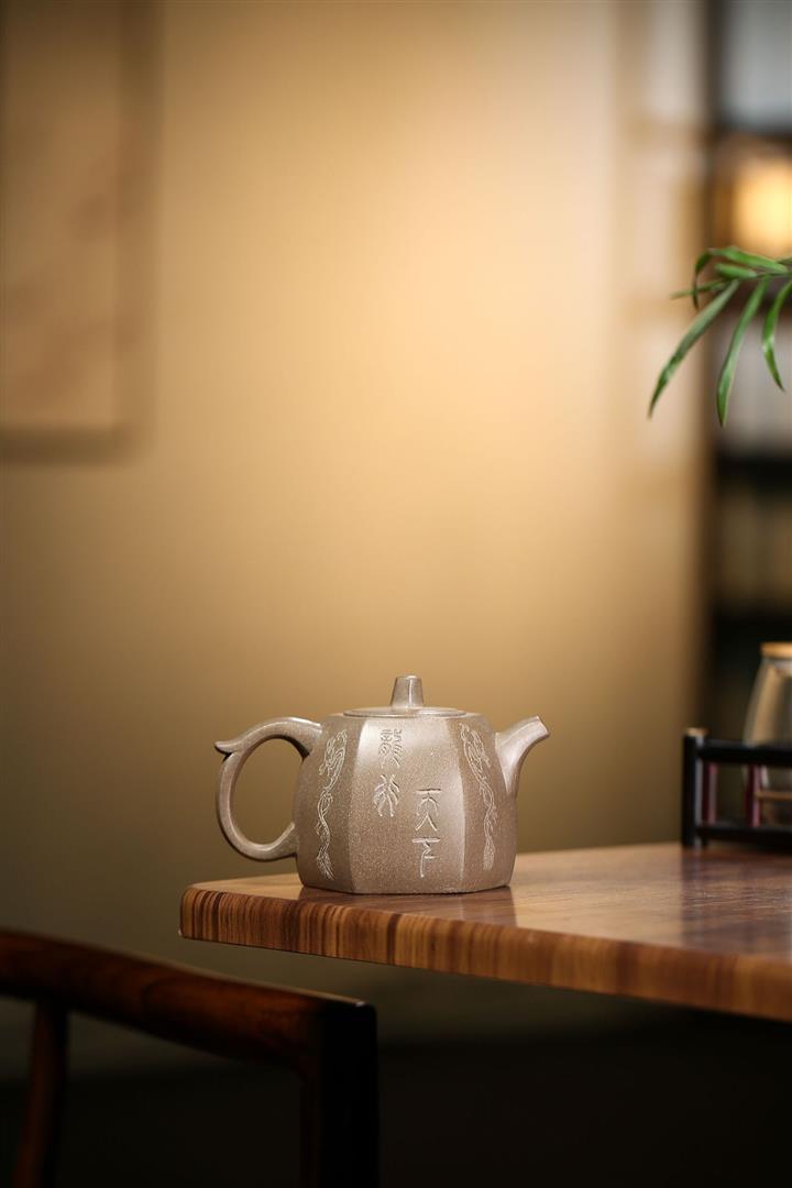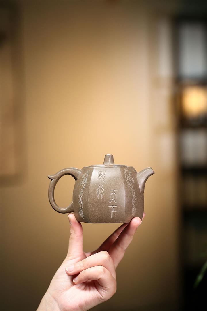 【泥料特點】砂土氣重,似淳實農民,日久使用,漸露鋒芒,養成變化甚大,溫潤莊重。線條優美自然,嘴把搭配協調,身桶配上細長把的搭配,更顯優雅。