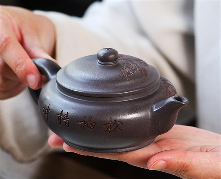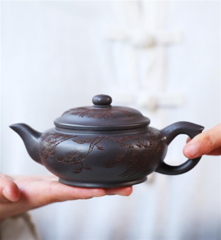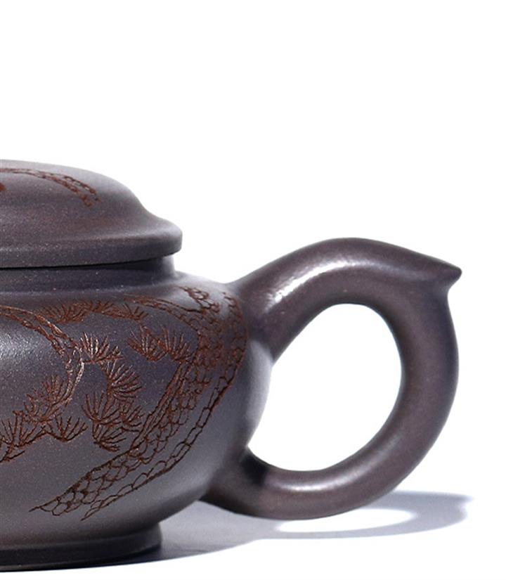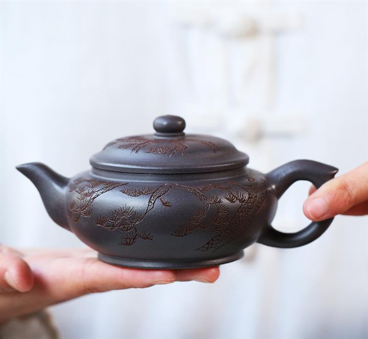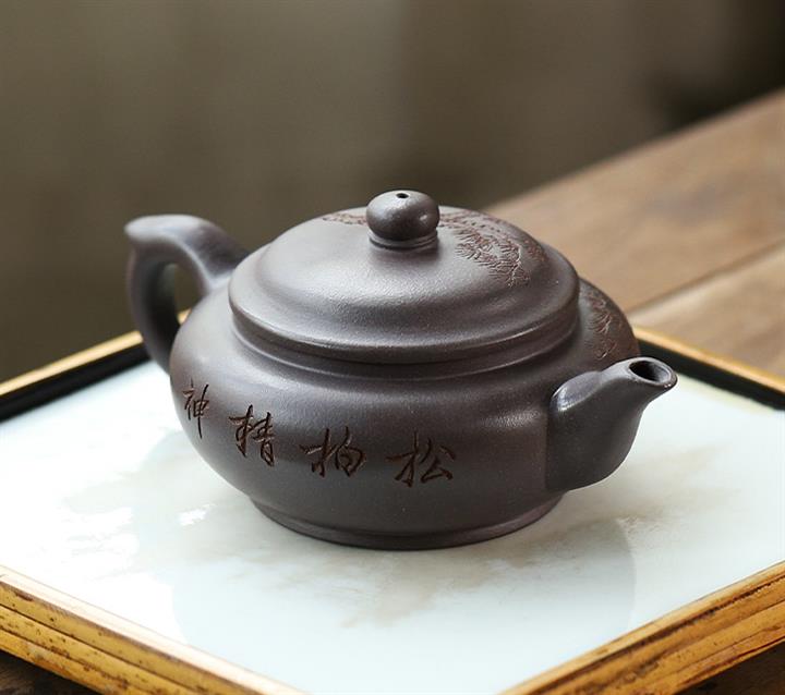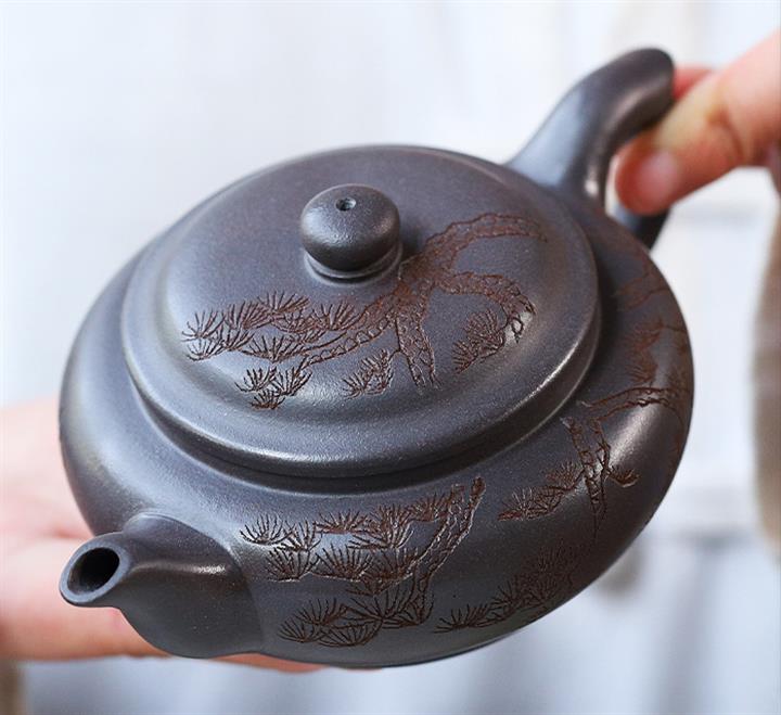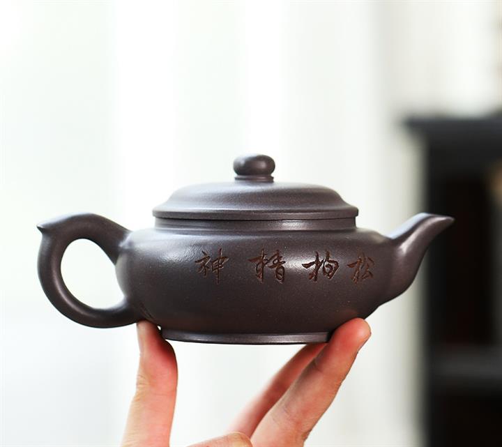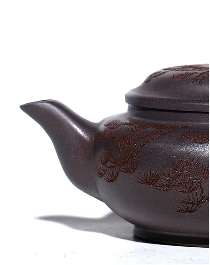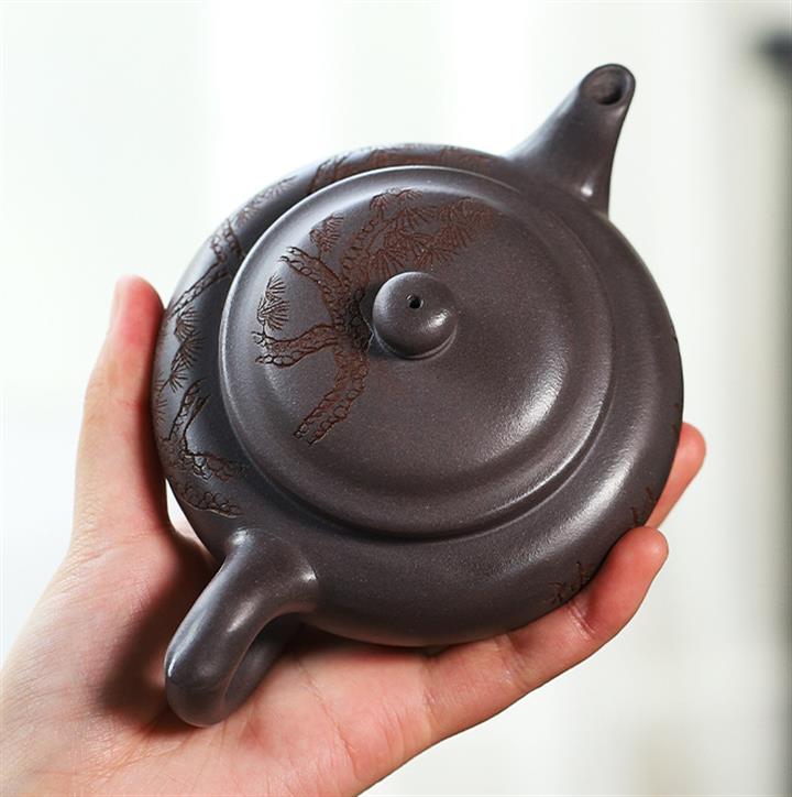 原礦天青泥紫砂壺全手工刻畫松風扁韻茶壺POT4057