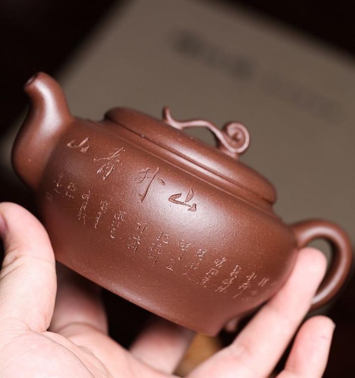 【介紹】此壺整體造型優美、線條流暢,細膩的材質,精美雙面刻繪,給人一種更佳的品茗體驗,承載大氣、     秀雅、端莊、精巧等多種氣質,壺把,壺嘴,壺身一氣呵成栩栩如生,泥料色澤古樸典雅,是收藏把玩的好壺