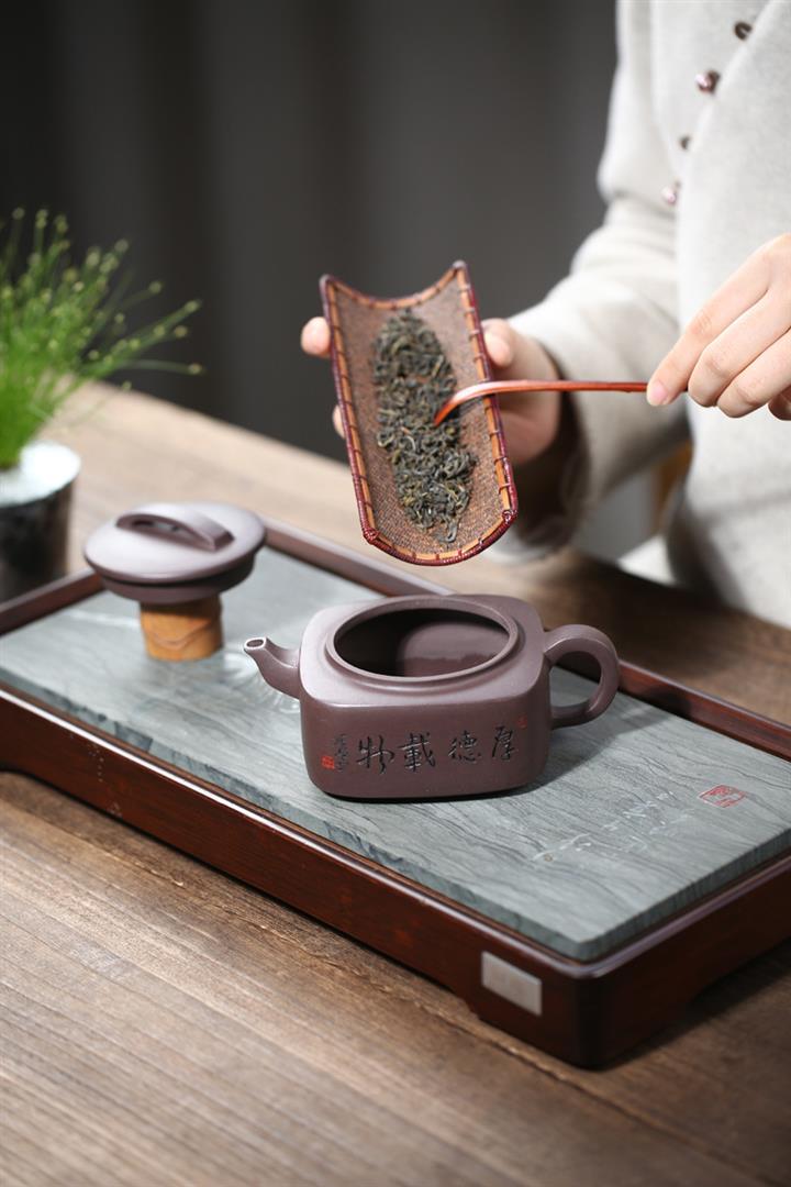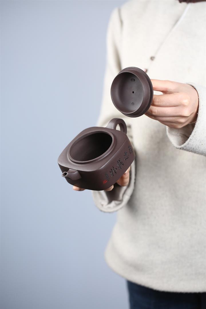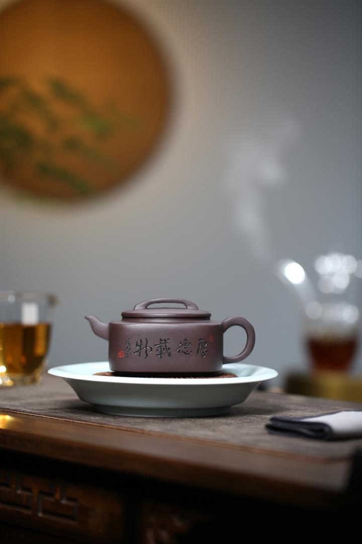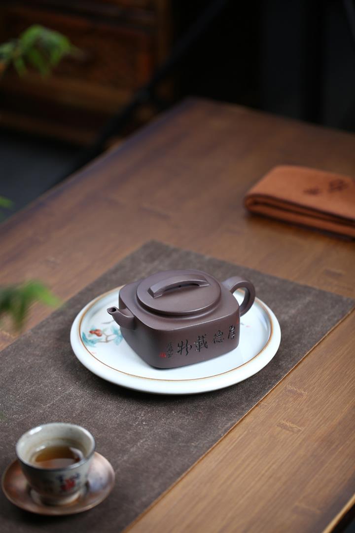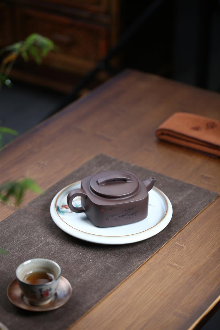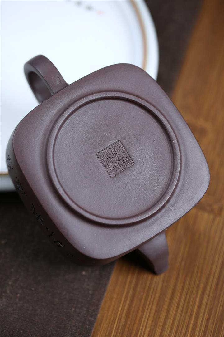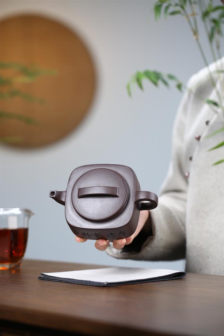 【簡介】作品全部用方形展示,去角,線條筆挺,壺蓋與此相同,肩部過渡有線條清晰展示,愈發明了大氣。壺鈕為四方橋梁型,工整自然。壺嘴雖然有粗細漸變,但同樣是四方外觀。與此對應,壺把的形態也是筆挺大氣,整壺透露剛毅之氣。