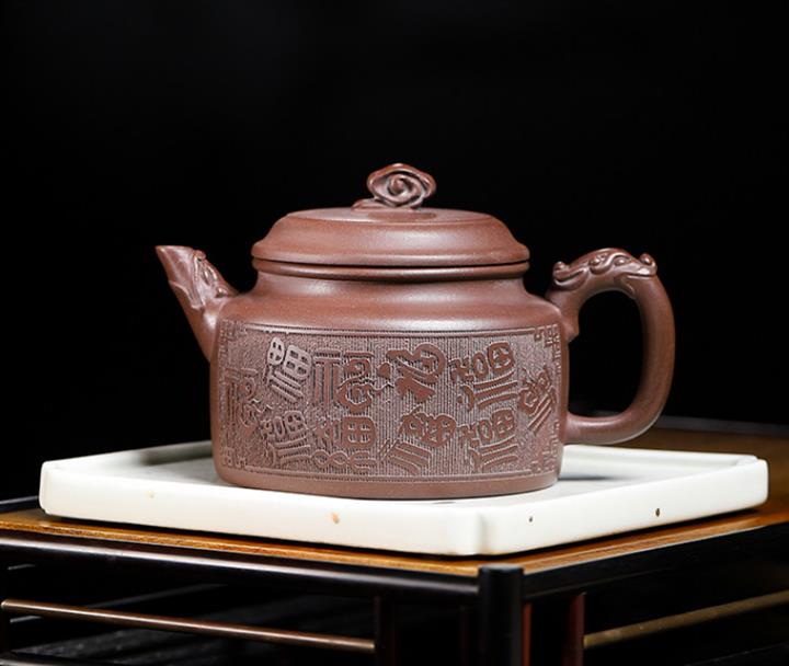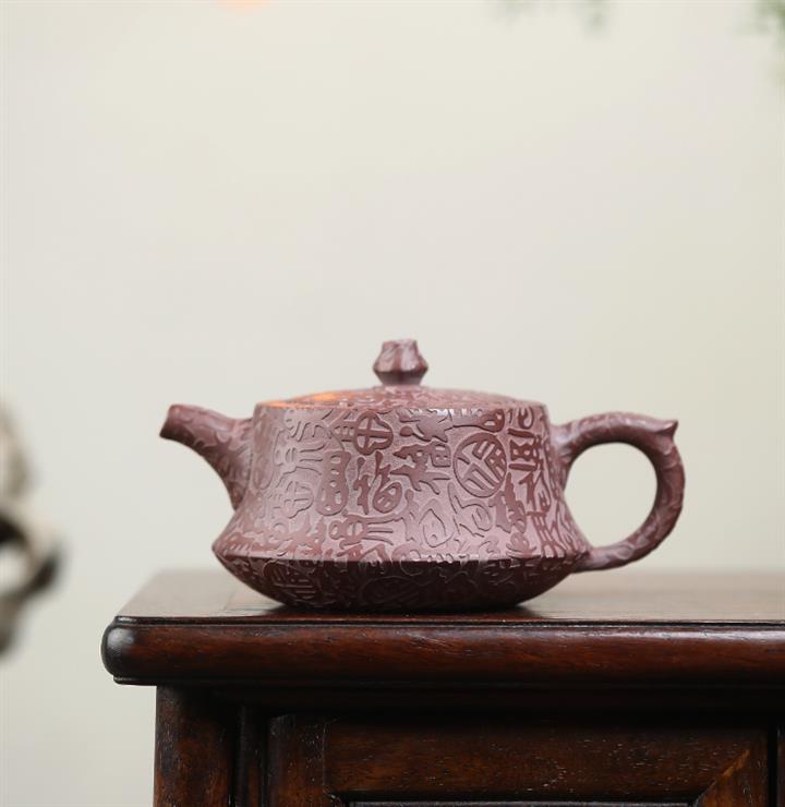 原礦紫砂壺紫泥手工刻繪百福柱礎POT4239