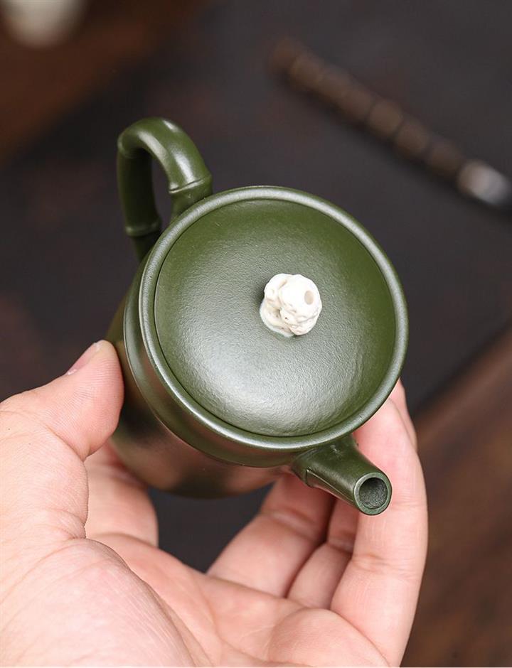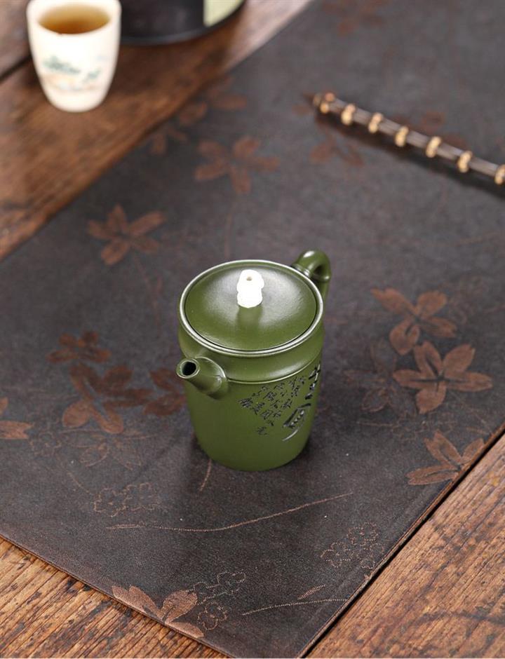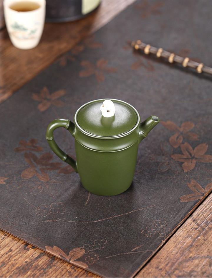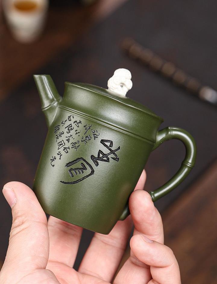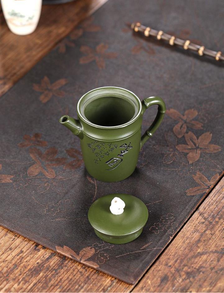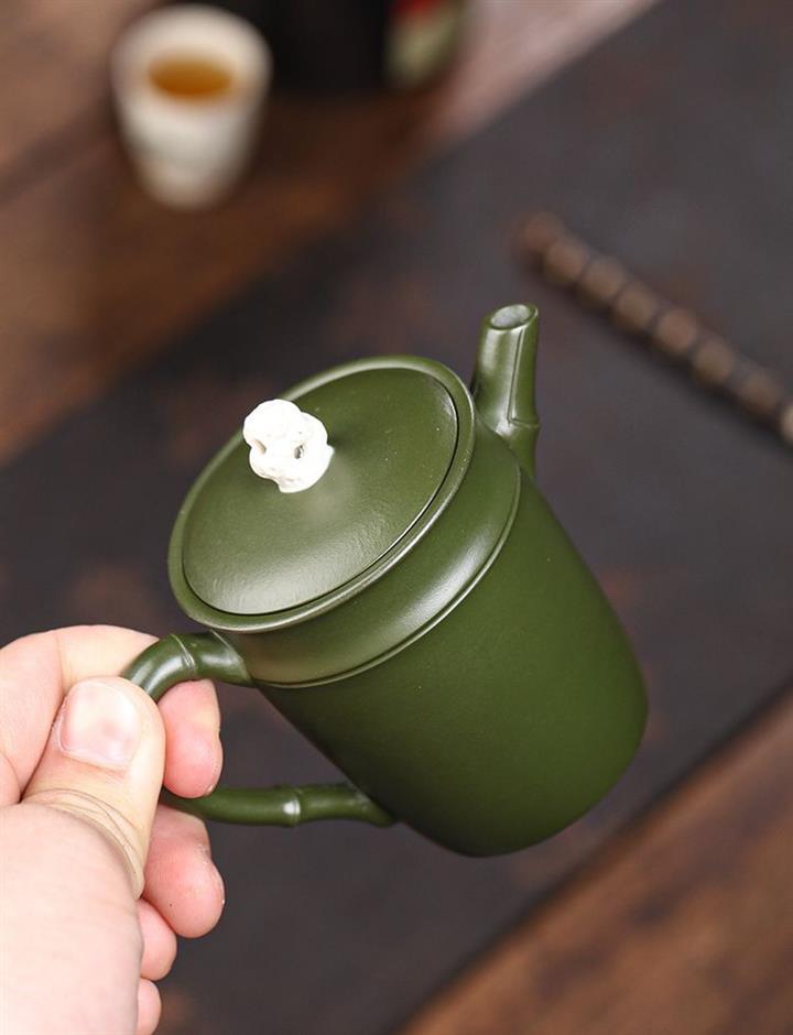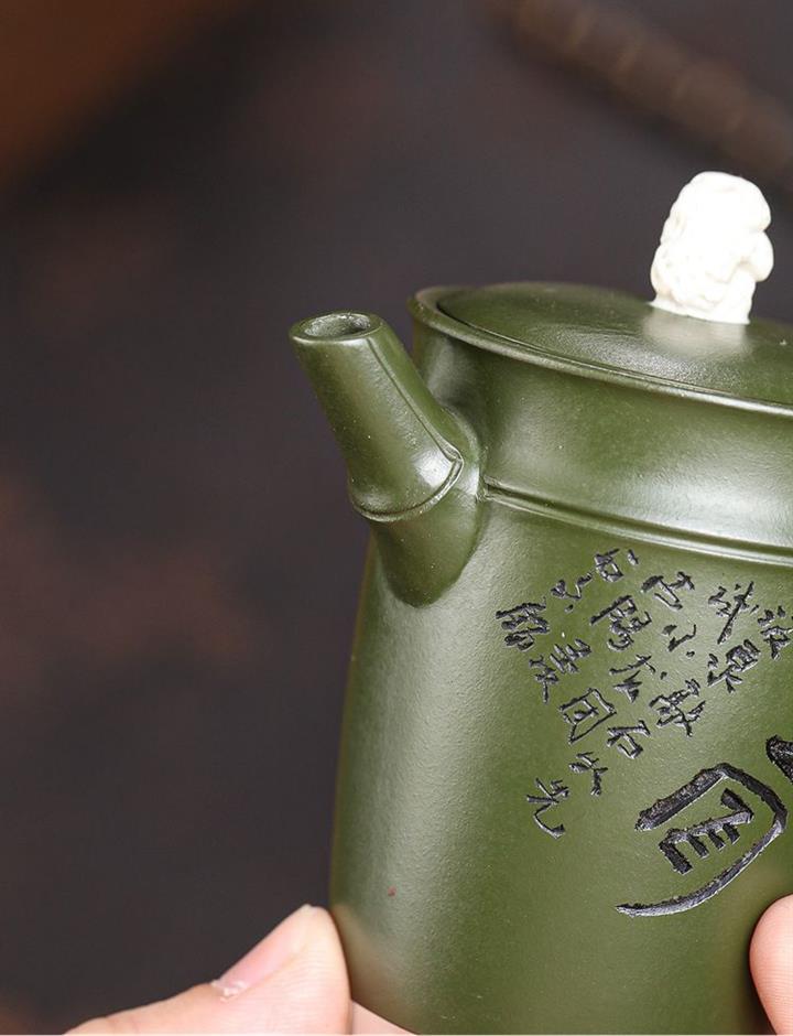 【介紹】製作工藝精湛。線條自然有力,其鈕更是點睛之作,以「太湖石」為形,嵌蓋上飾一小塊太湖石,猶如       微型盆景中的假山褶皺自然,神韻俱佳,壺身圓柱狀,線條流暢,壺身精美刻繪,以竹節為壺身,壺嘴,壺       把,直嘴圓口,出水順暢,耳把則更顯細膩自然,表現了紫砂茶器的簡潔素雅之美