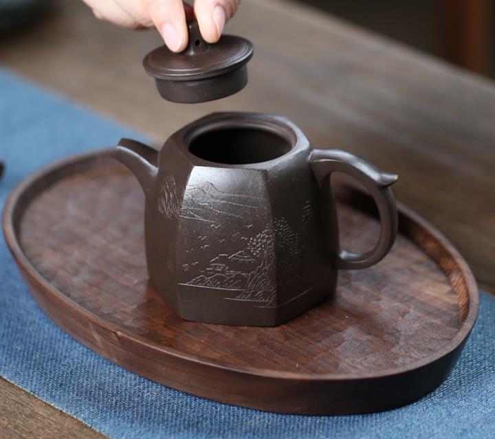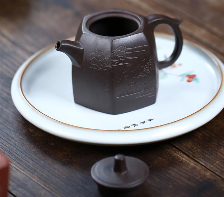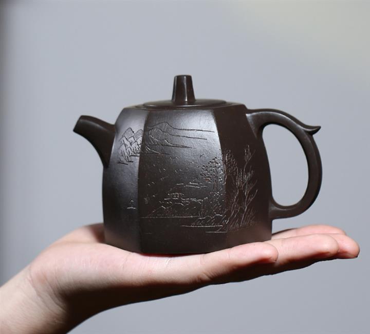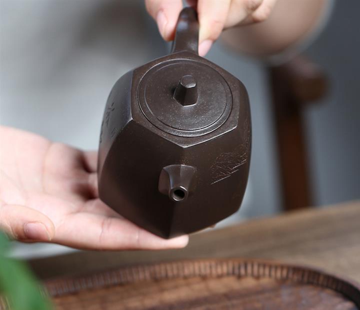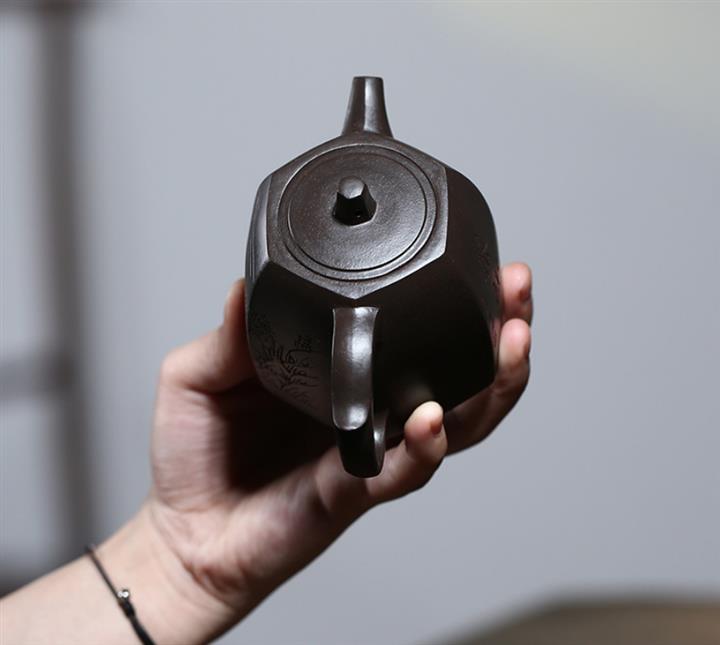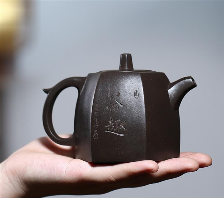 此壺在經典漢鐸的基礎上加入了六方的型製,造型規整,壺身如鐘,氣勢浩然。平嵌蓋,與壺融為一體,柱形鈕,短彎流,耳形方把,形筒古樸,整器亦樸亦雅,亦古亦今。
