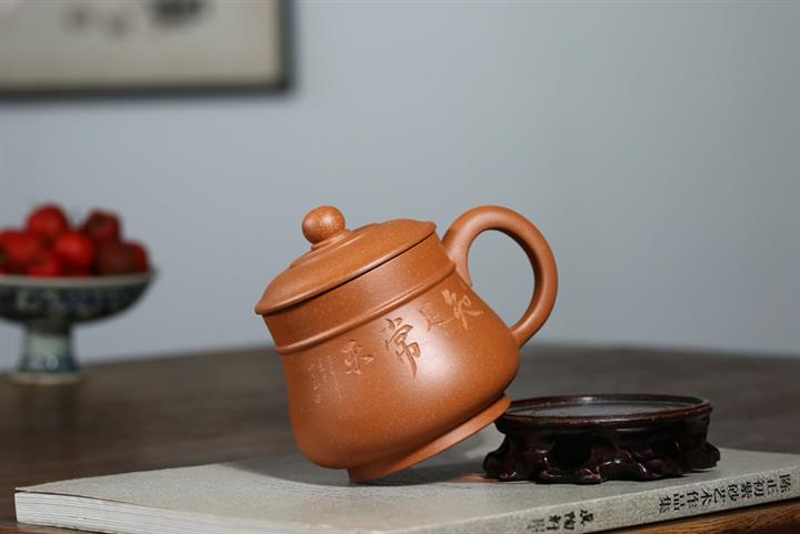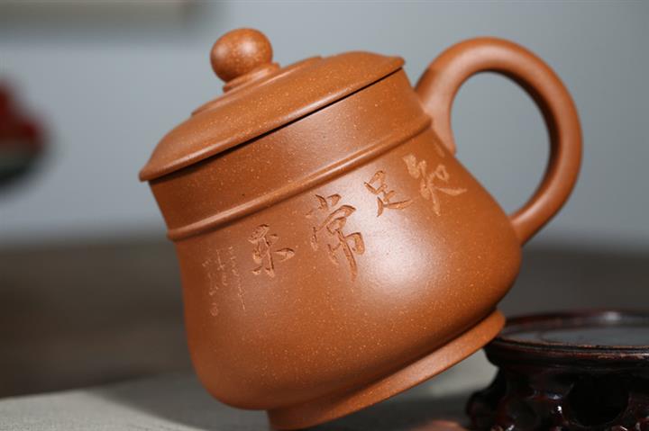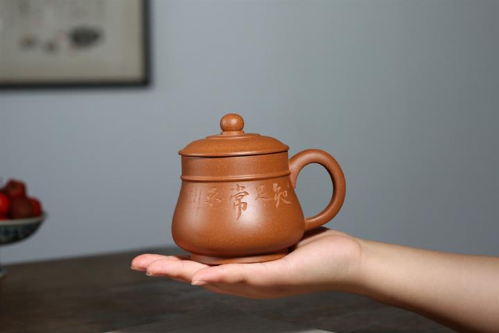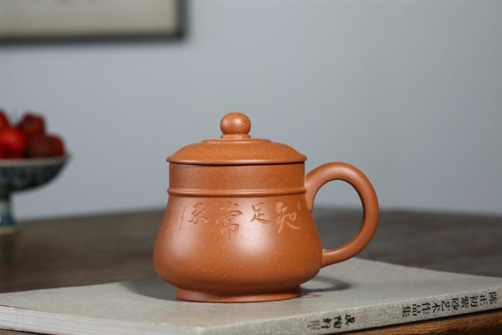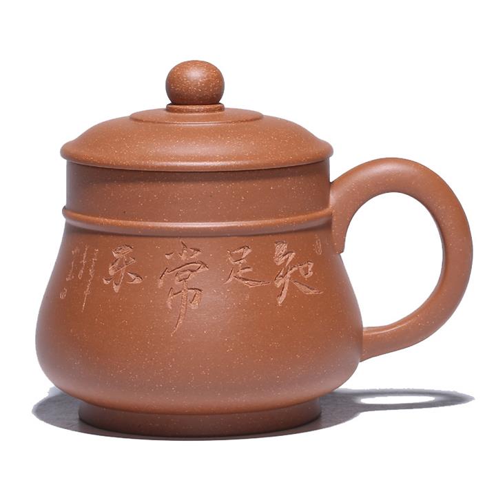 杯身刻繪設計,刀法嫻熟,剛勁有力,蓋鈕、杯把、杯身比例協調,相得益彰。