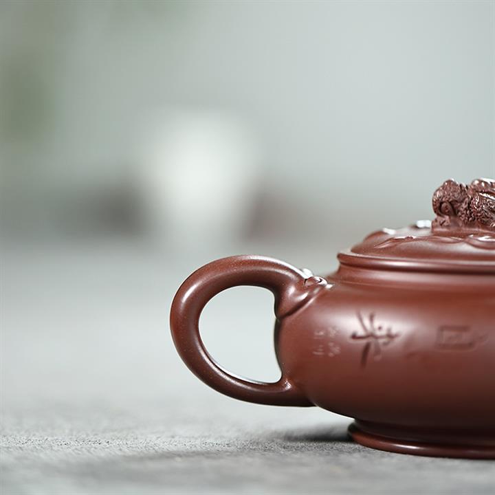 【介紹】此壺名為金蟾仿古壺,是紫砂壺中的經典創新款型。該壺比例協調,器型大氣,金蟾招財,壺身手工刻字,出水流暢,泥料透氣性好,容易泡養,配證書,送壺繩,禮品盒包裝。