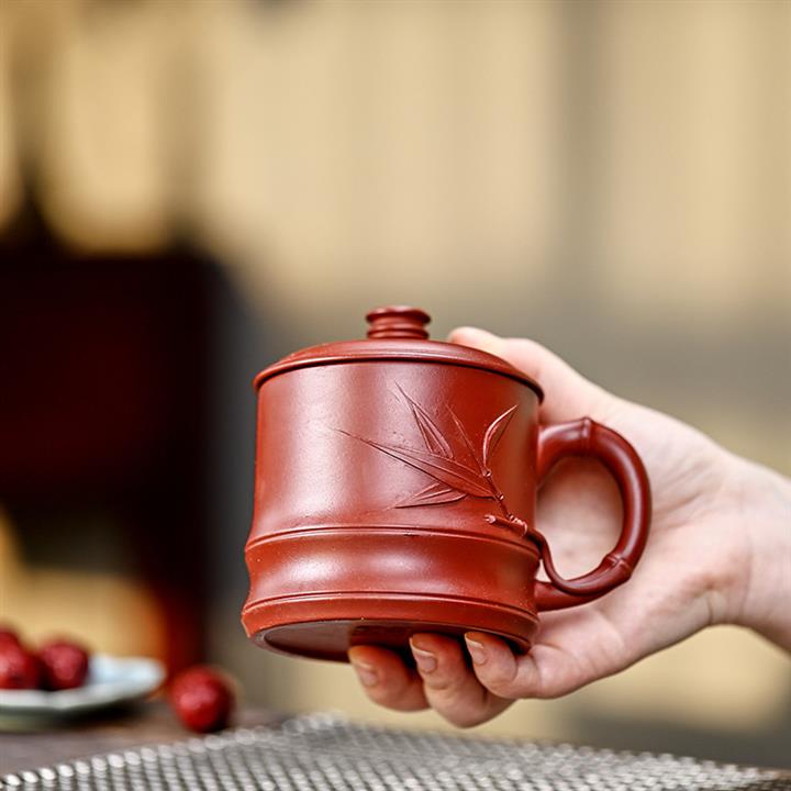 【介紹】此為大紅袍竹節蓋杯,是紫砂蓋杯中的經典款型。該杯比例協調,器型小巧,泥料細膩,容易泡養,配證書,送壺繩,禮品盒包裝。