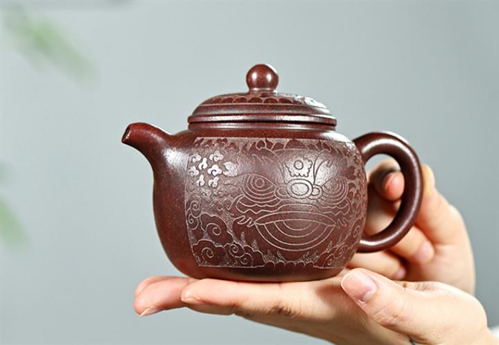 介紹該壺比例協調,器型圓潤大氣,出水流暢,壺身刻字畫,配證書,送壺繩,禮品盒包裝。