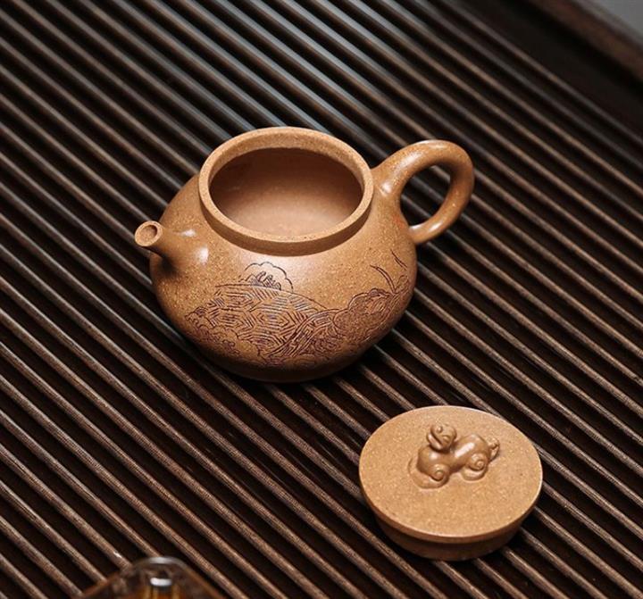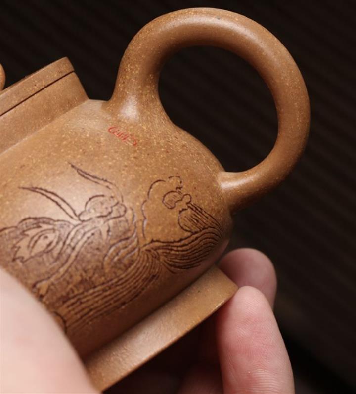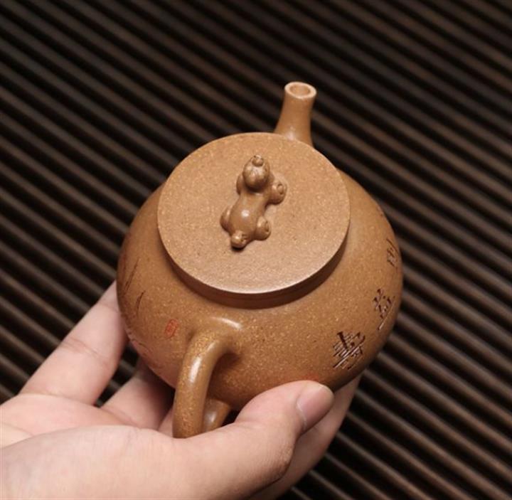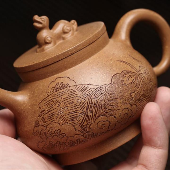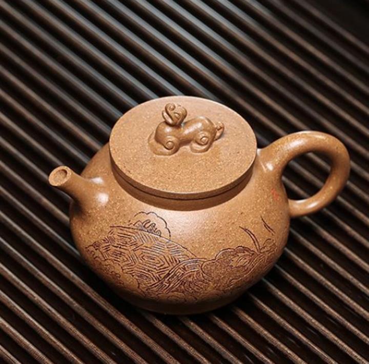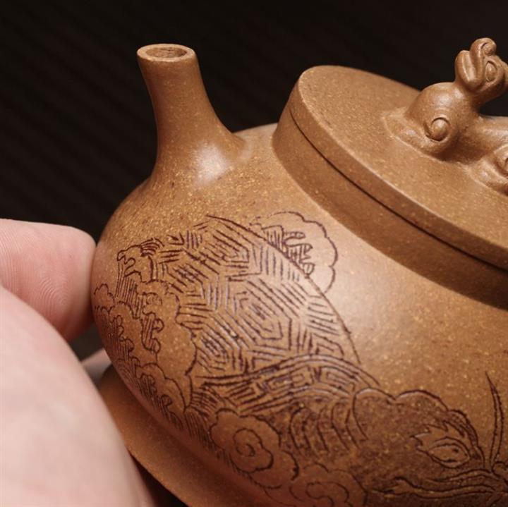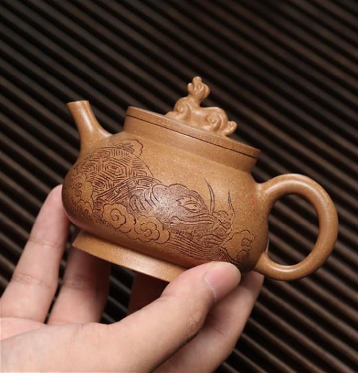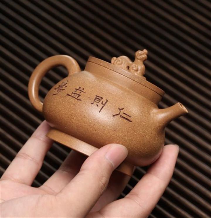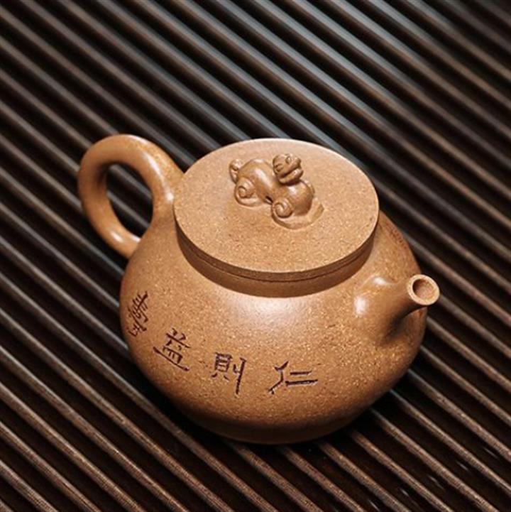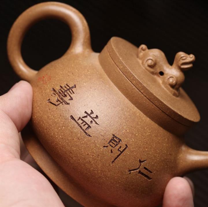 【簡介】古人把麒麟當作仁獸﹑瑞獸,常用來比喻傑出的人,因而後世以麒麟為材題的作品也不斷湧現,此款壺選用原礦老段泥手工製作的麒麟壺精工細作,大器方成,顏色古樸暗雅。直嘴與飛把對應成勢,與壺身明接相連,使得器型更立體,壺鈕精心製作一麒麟突出主題,器型雖為圓器,頗有剛勁十足的特點,又在賞玩養用性上增色不少。