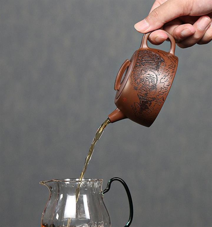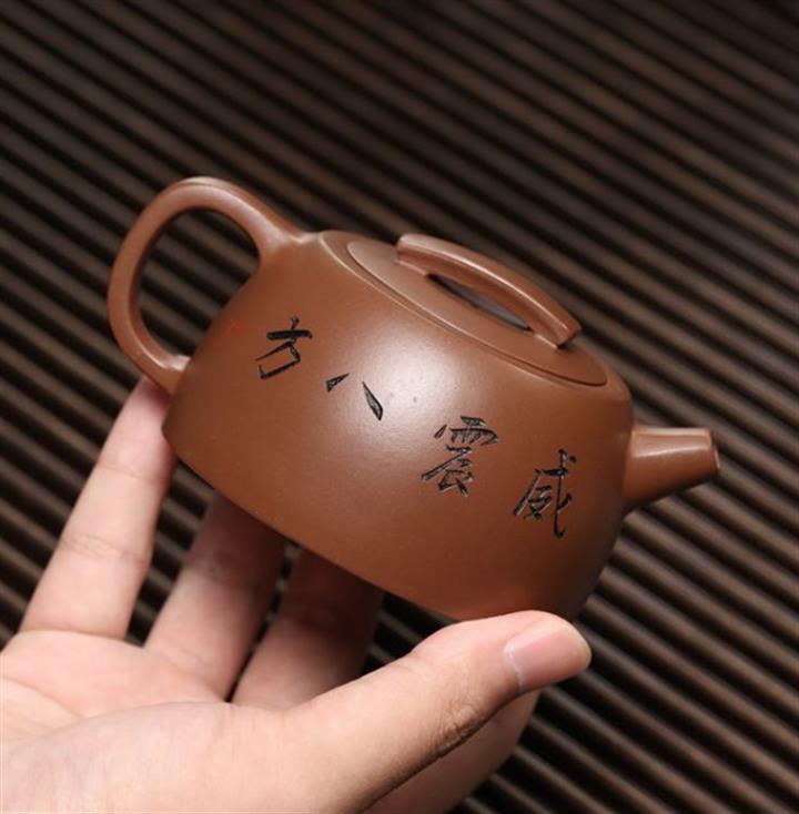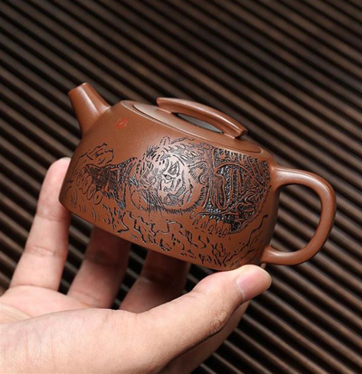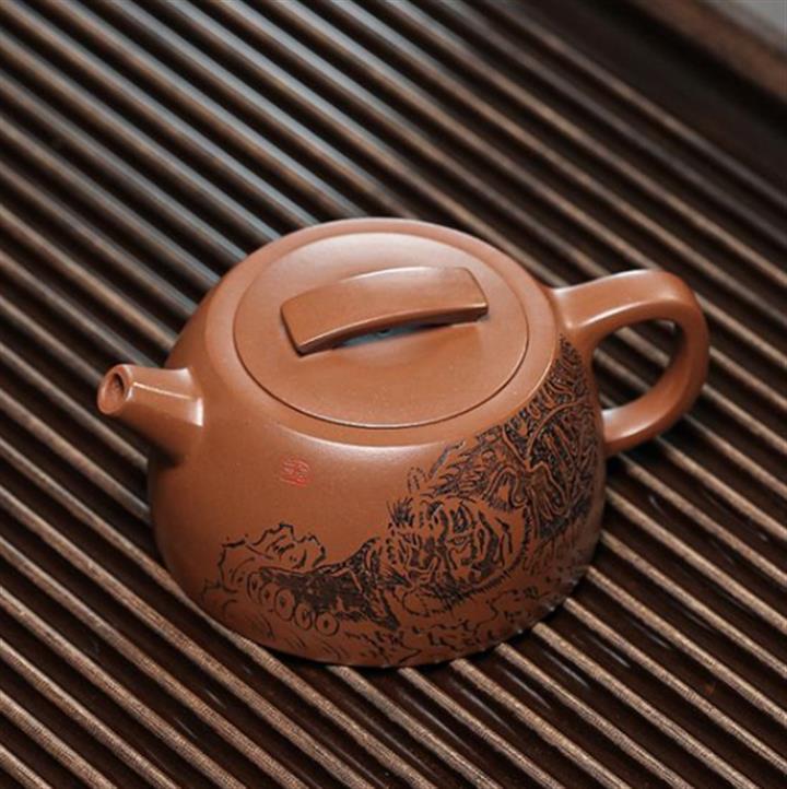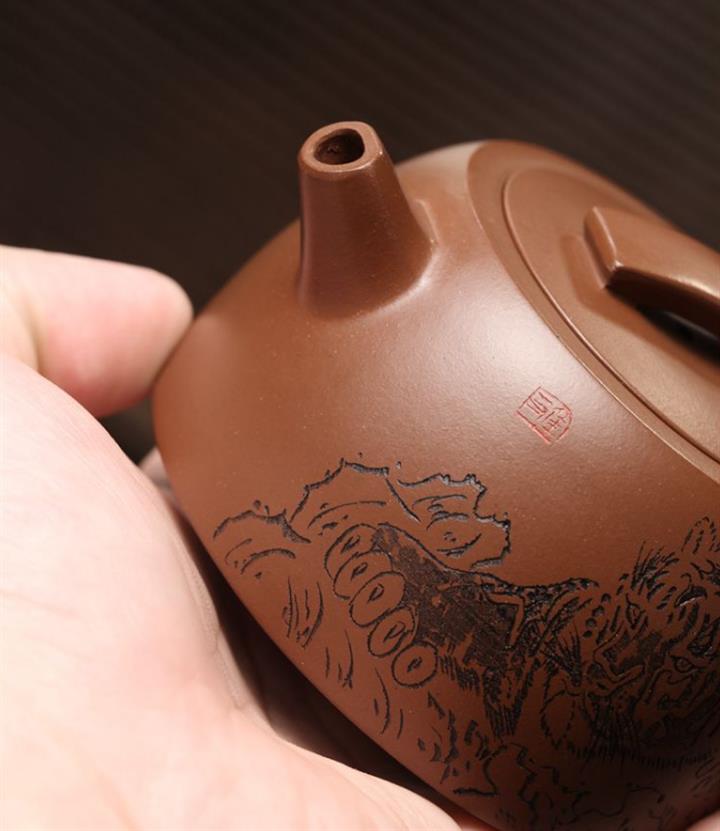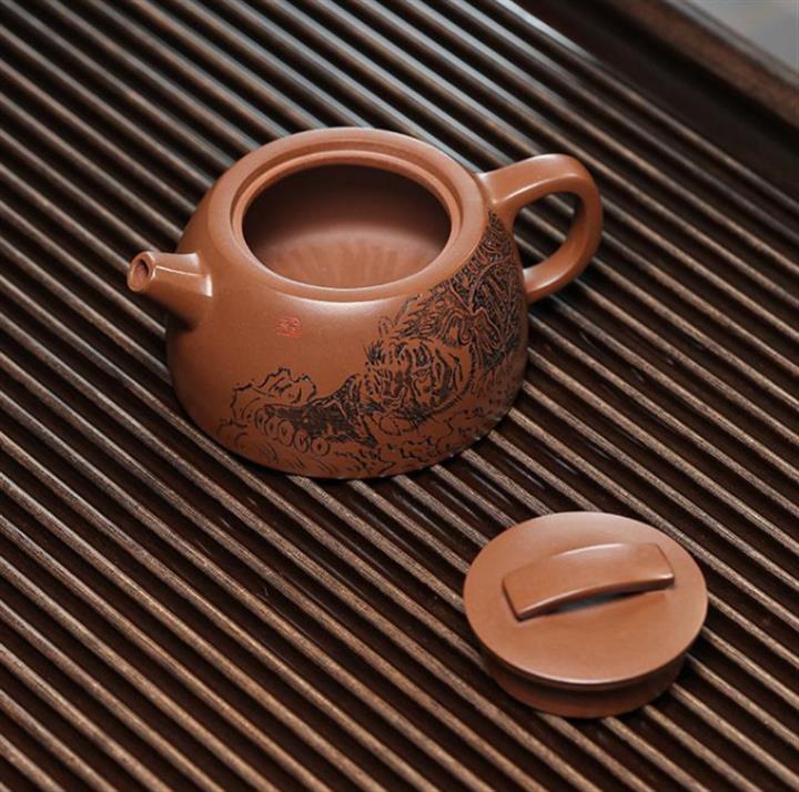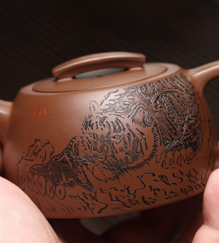 【簡介】此壺形製精巧,器型敦厚,製工細致連貫流暢。嵌蓋,橋形鈕,短流粗壯可愛,耳形把裝飾,趣味十足。壺底與壺蓋均作瓦當形製,製式精妙。壺身刻繪裝飾,將老虎的霸氣,威震八方,融於紫砂壺中,文人氣韻深厚,是為一把經典的文人壺作品,值得收藏