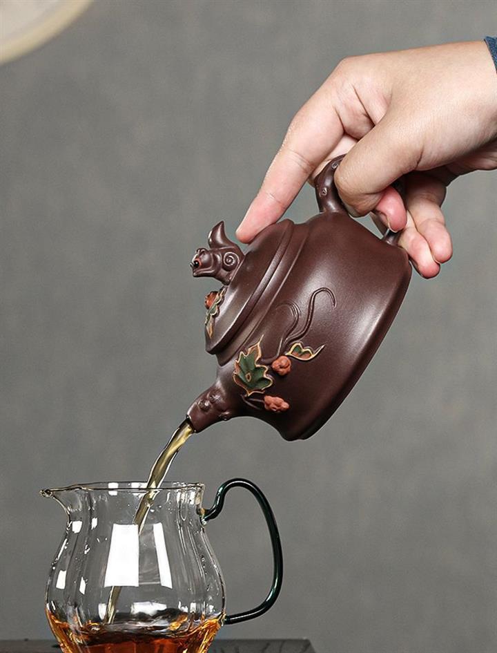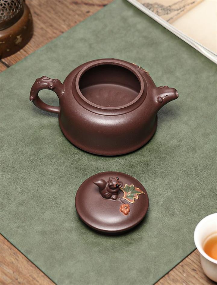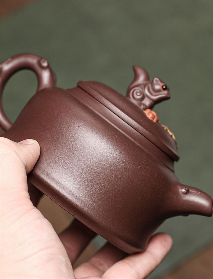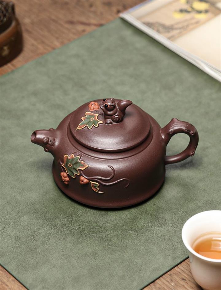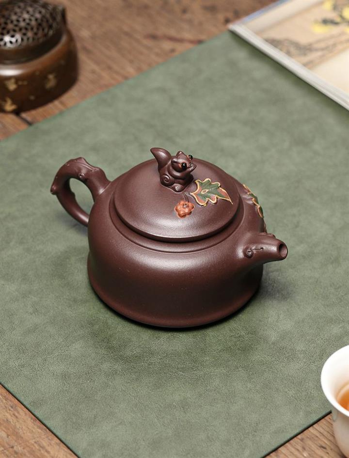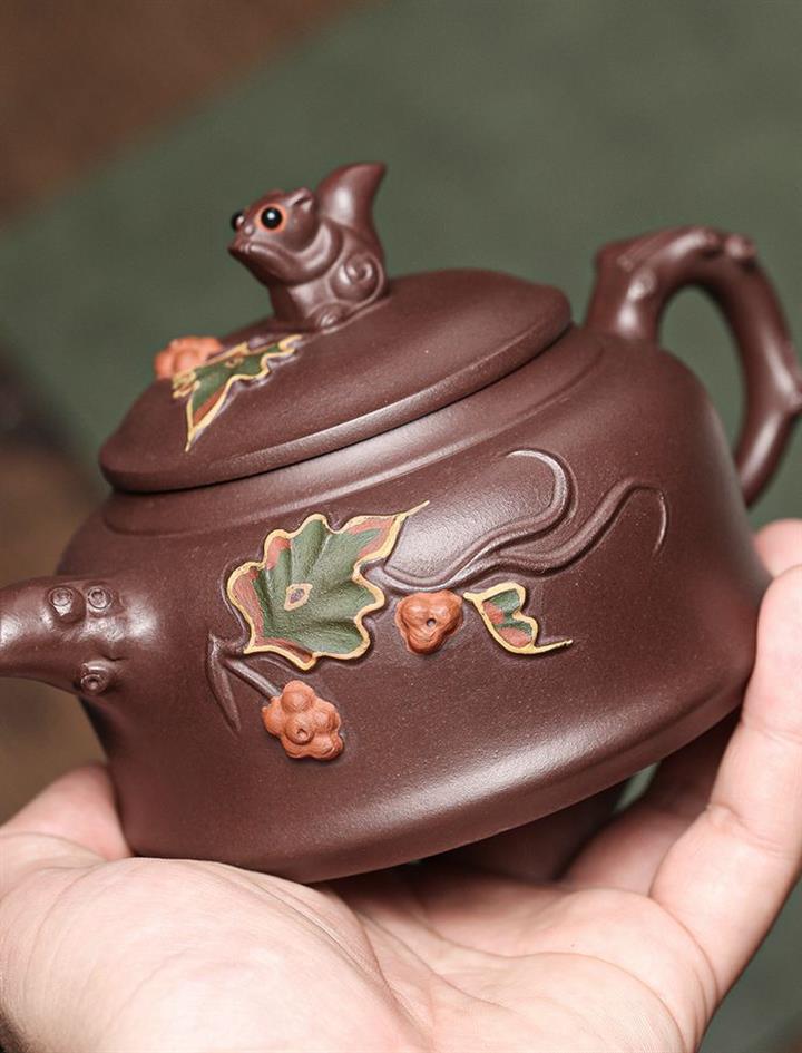 【簡介】松鼠葡萄的組合,更加祥瑞、吉祥。壺身呈圓形,圓潤壺蓋,葡萄枝作壺嘴和壺身,把一側胥出葡萄葉,紋理清晰,細節處理恰到好處。以松鼠作鈕,周圍塑貼葡萄葉和葡萄。松鼠撿起葡萄吃,靈動可愛。