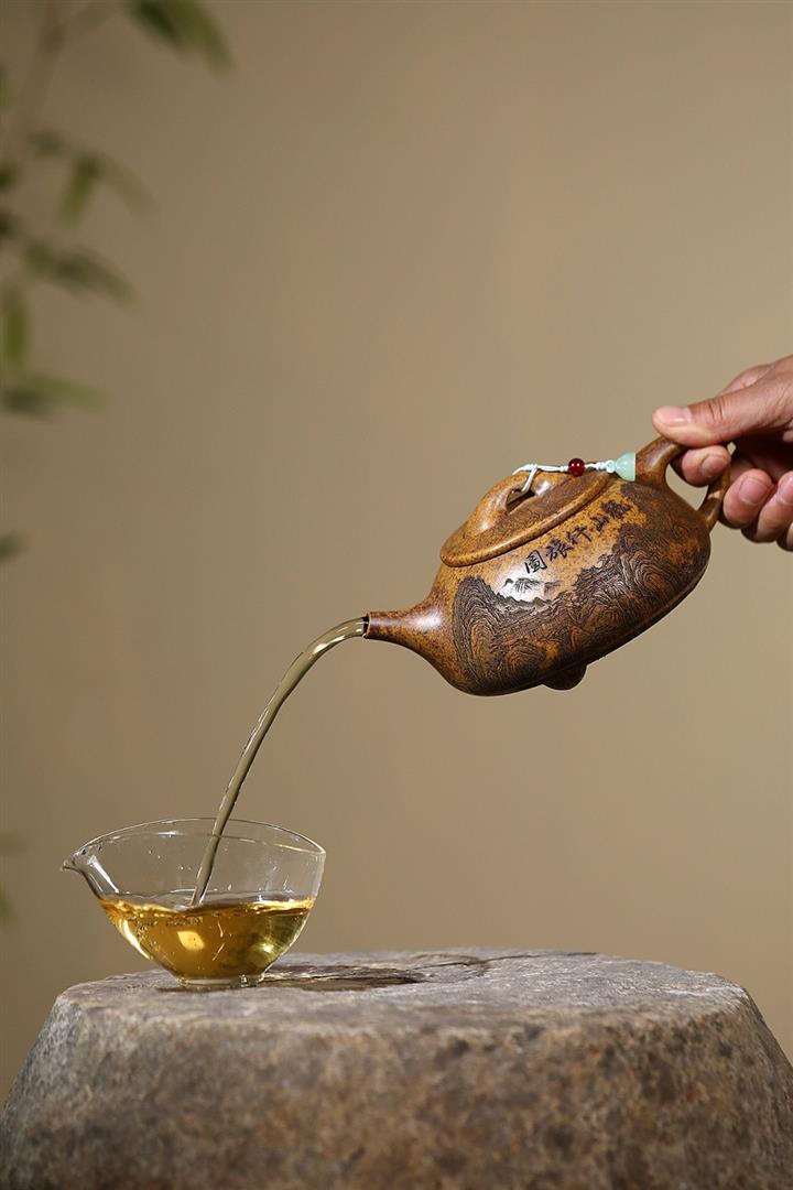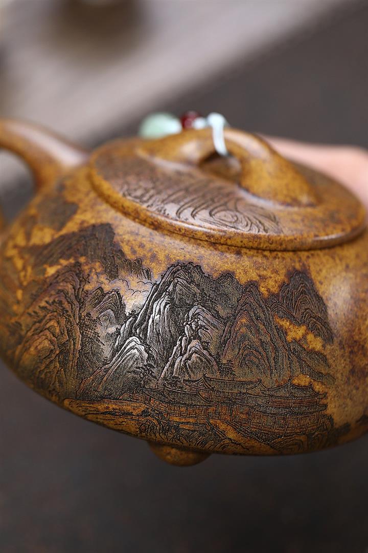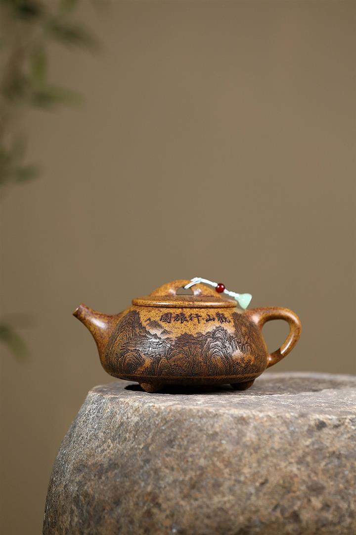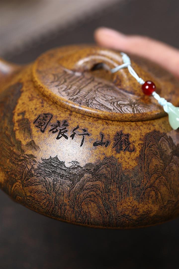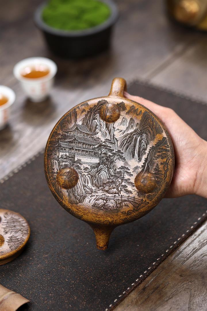 原礦龍骨金砂柴燒手工刻梅周盤茶壺POT6642