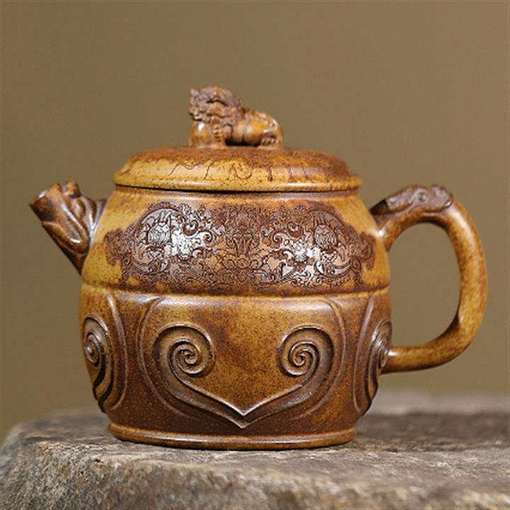 原礦老紫泥手工金獅繡球高石瓢壺POT6651