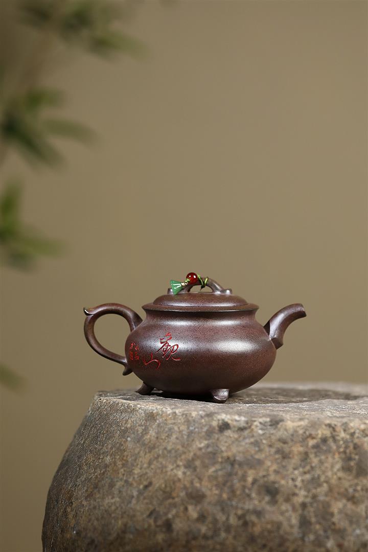 原礦老紫泥手工金獅繡球高石瓢壺POT6651