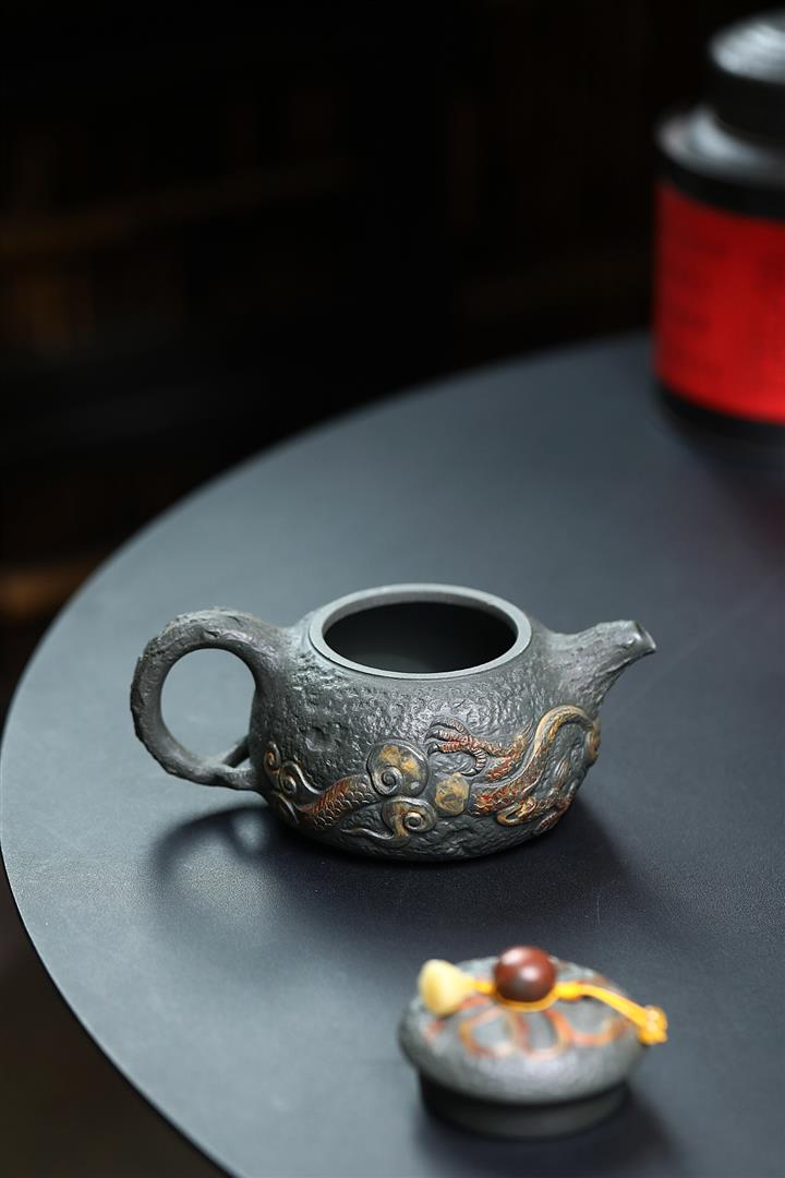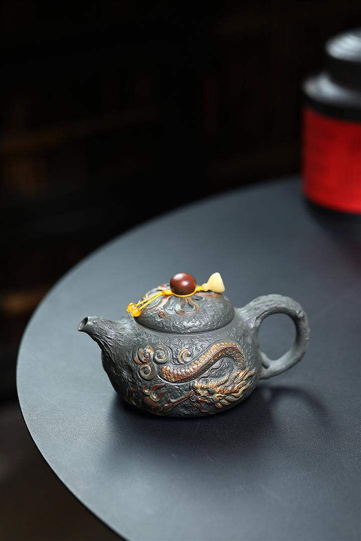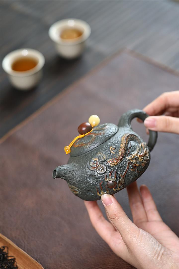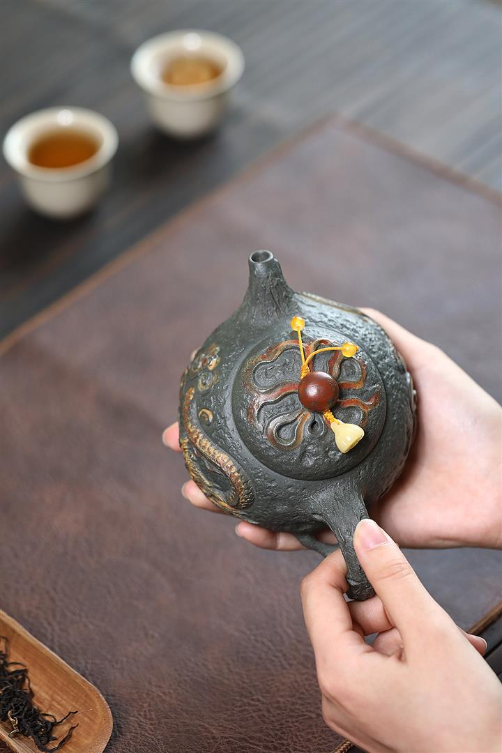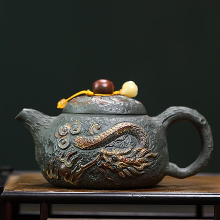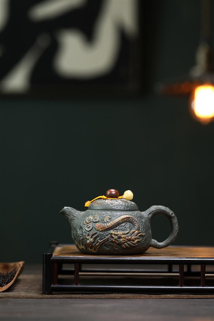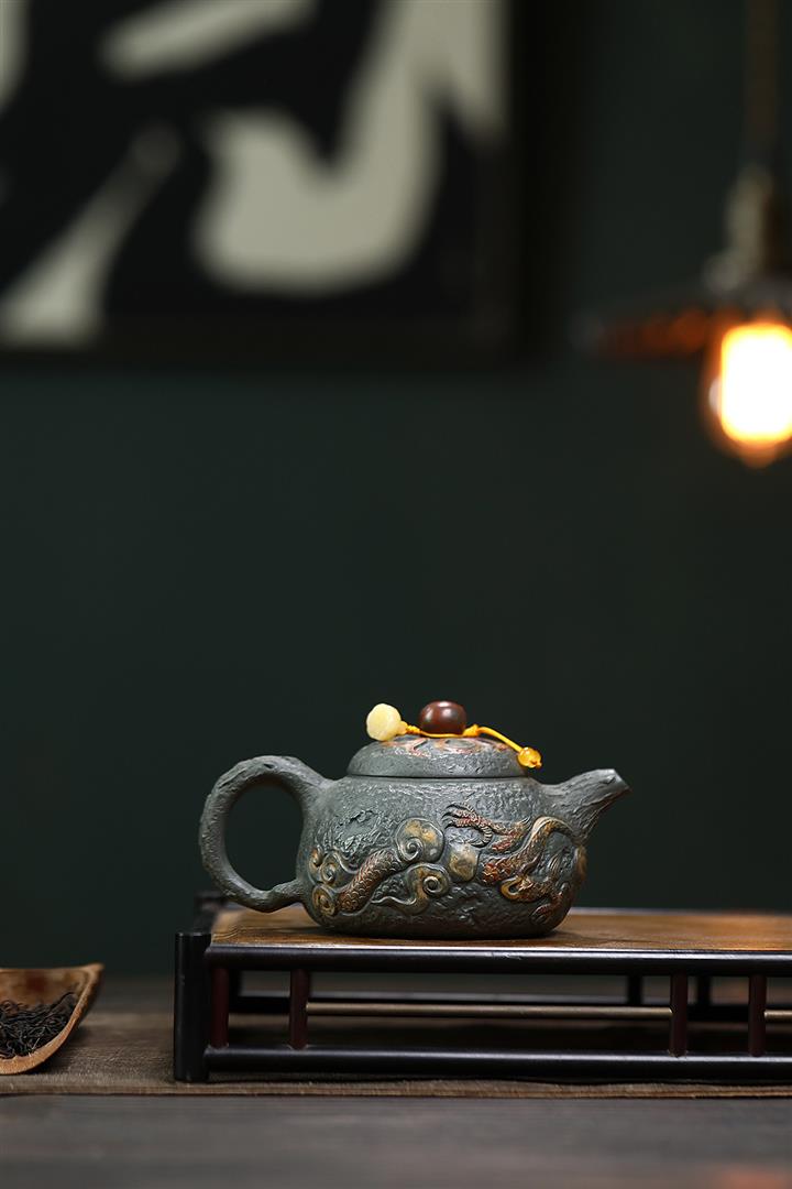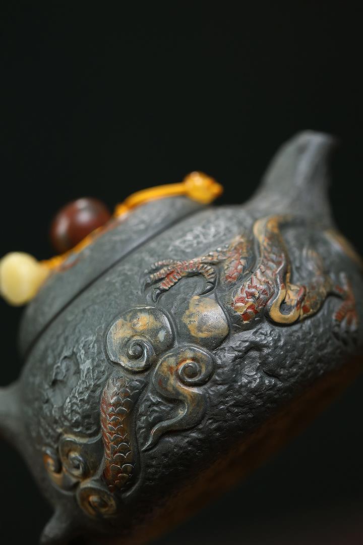 原礦墨綠泥手工蛟龍戲珠供春壺POT6674