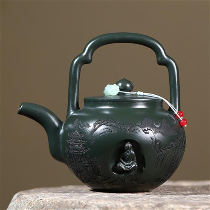 原礦墨綠泥手工滿刻提梁壺POT6720