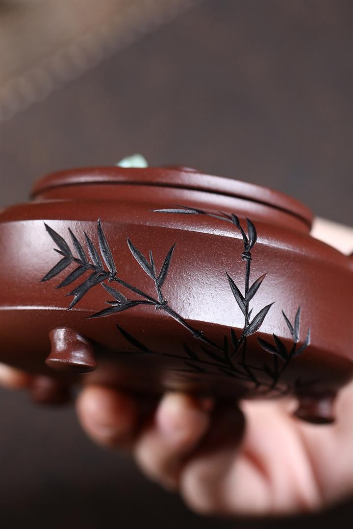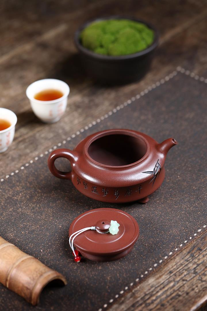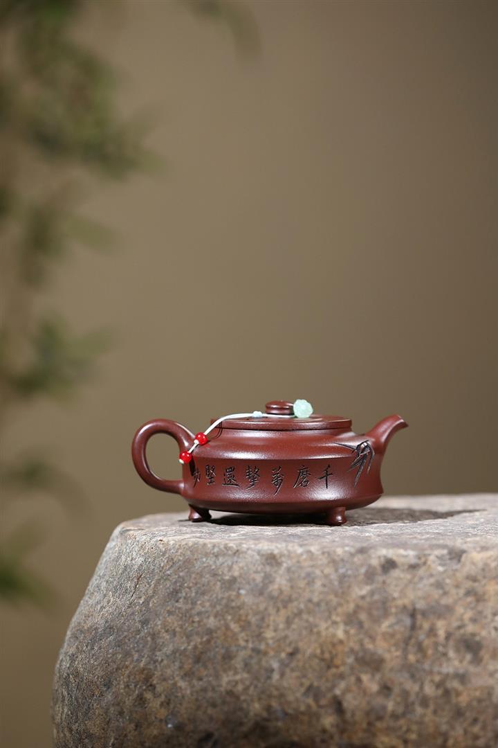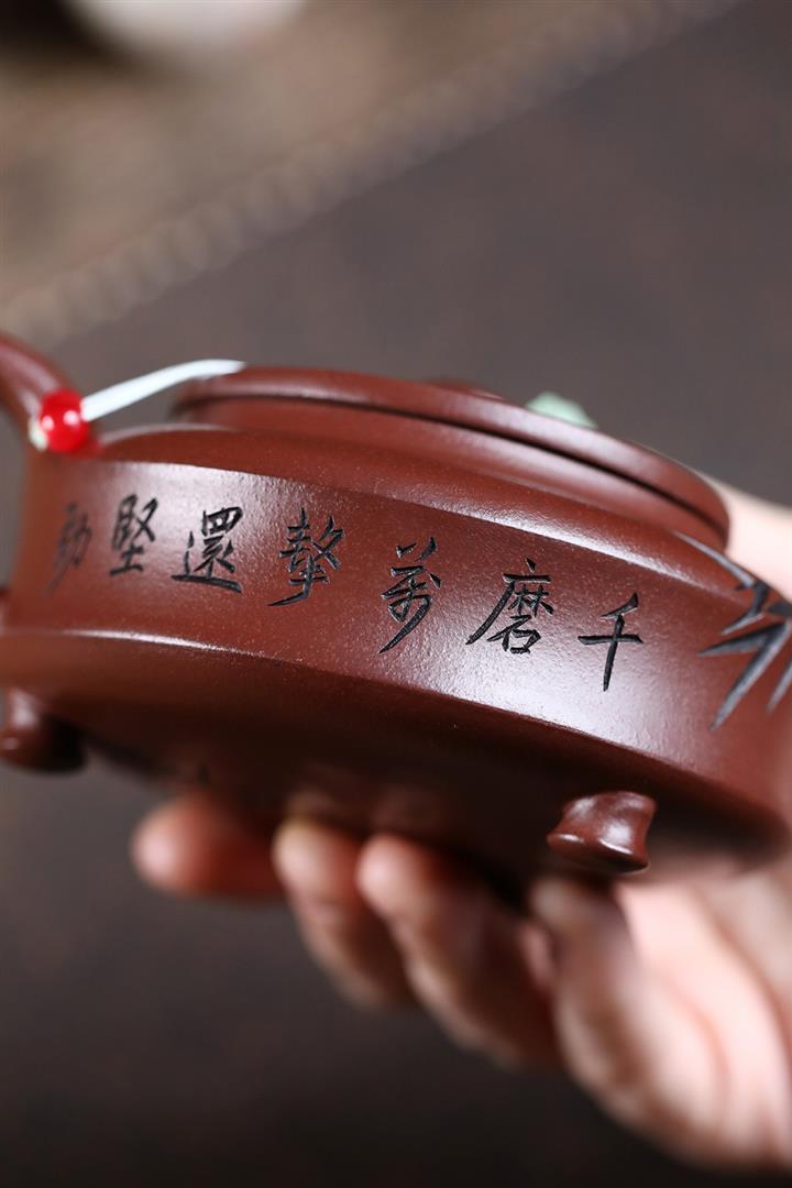 原礦紫泥手工刻字畫馬上封侯四方壺POT6737