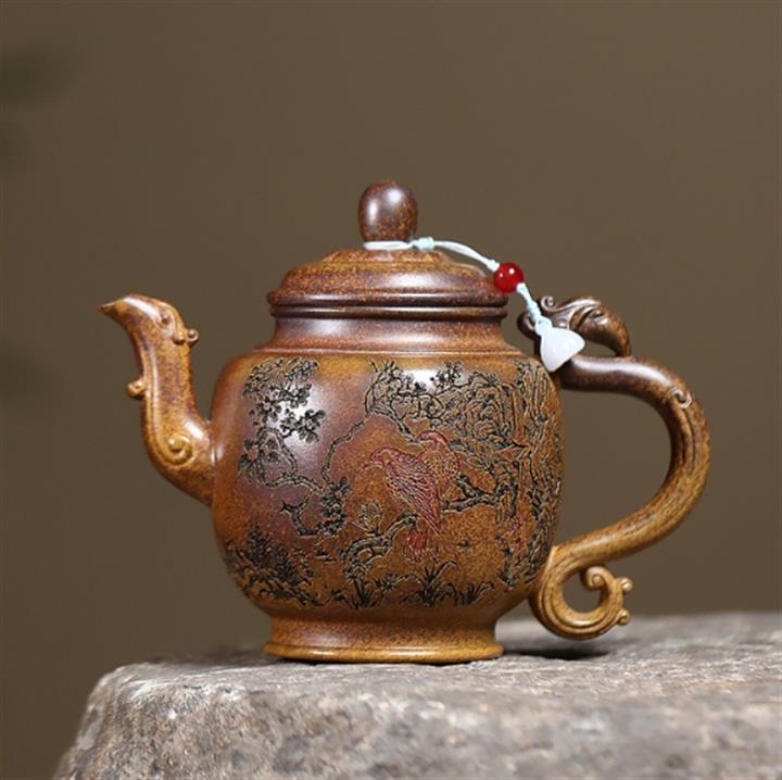 原礦黑金砂手工蛇紋鎏金刻繪龍燈茶壺POT6774