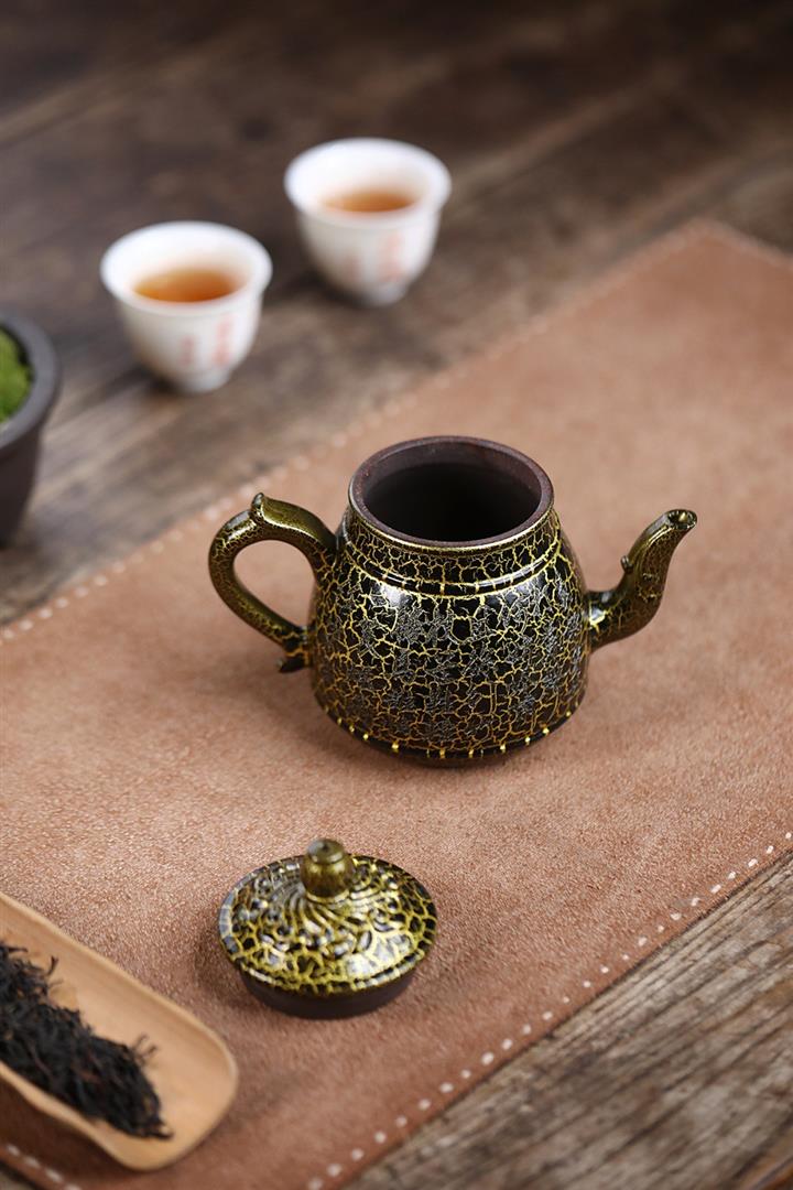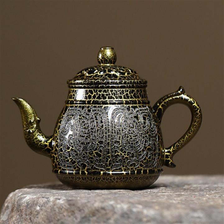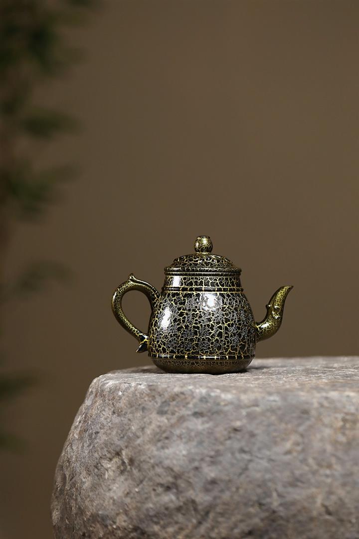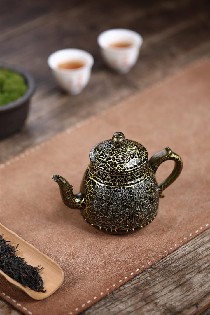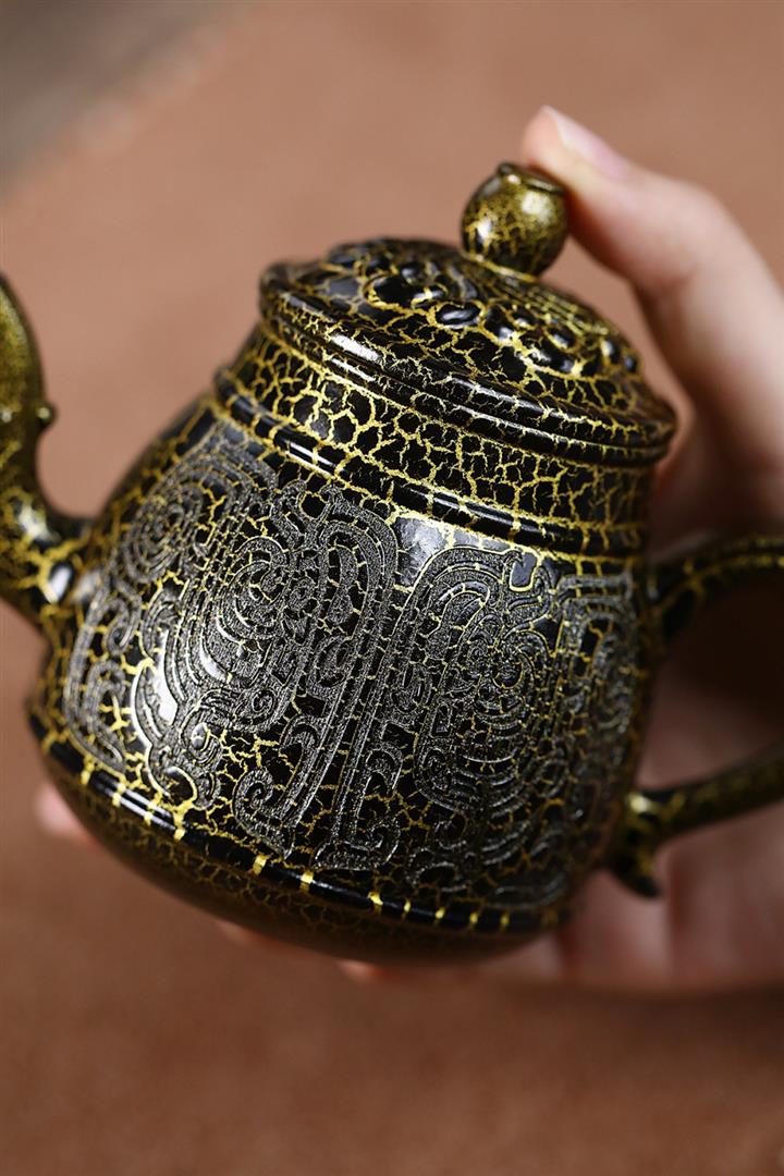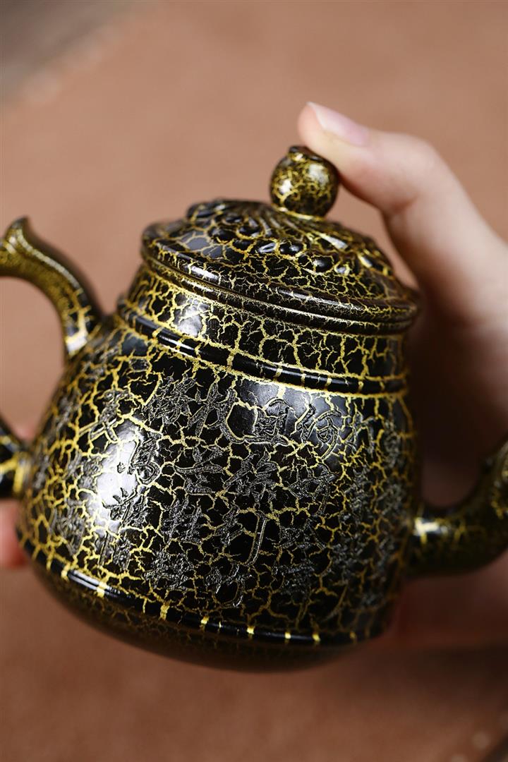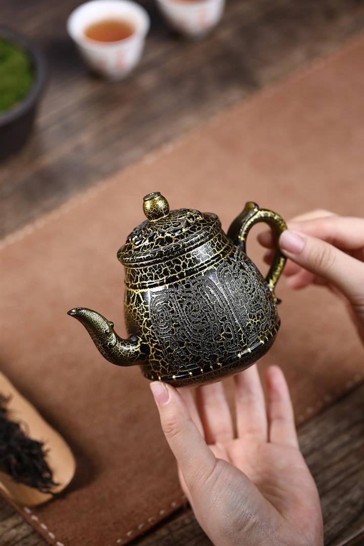 原礦黑金砂手工蛇紋鎏金刻繪龍燈茶壺POT6774