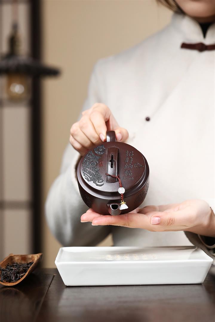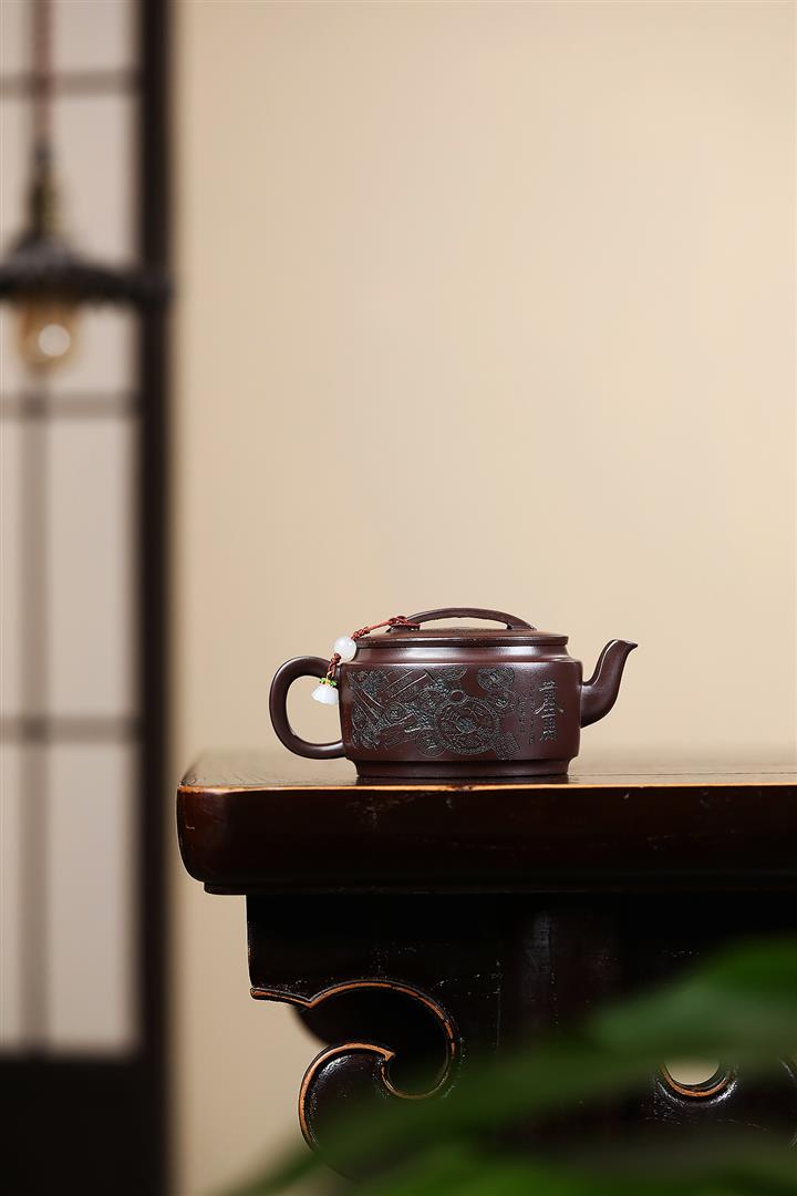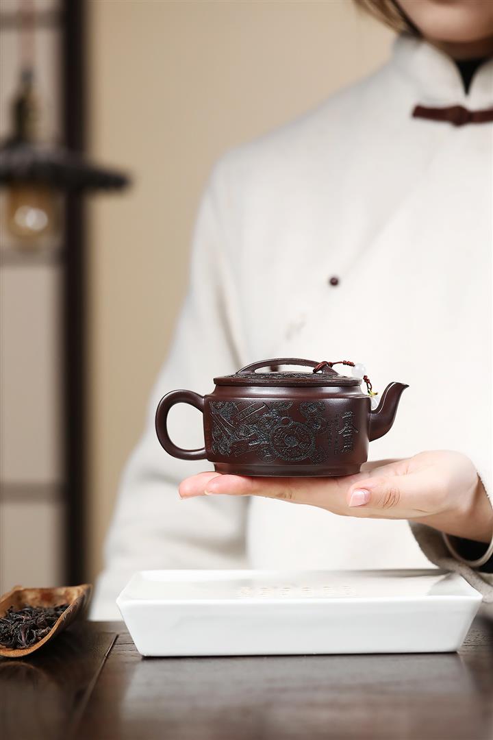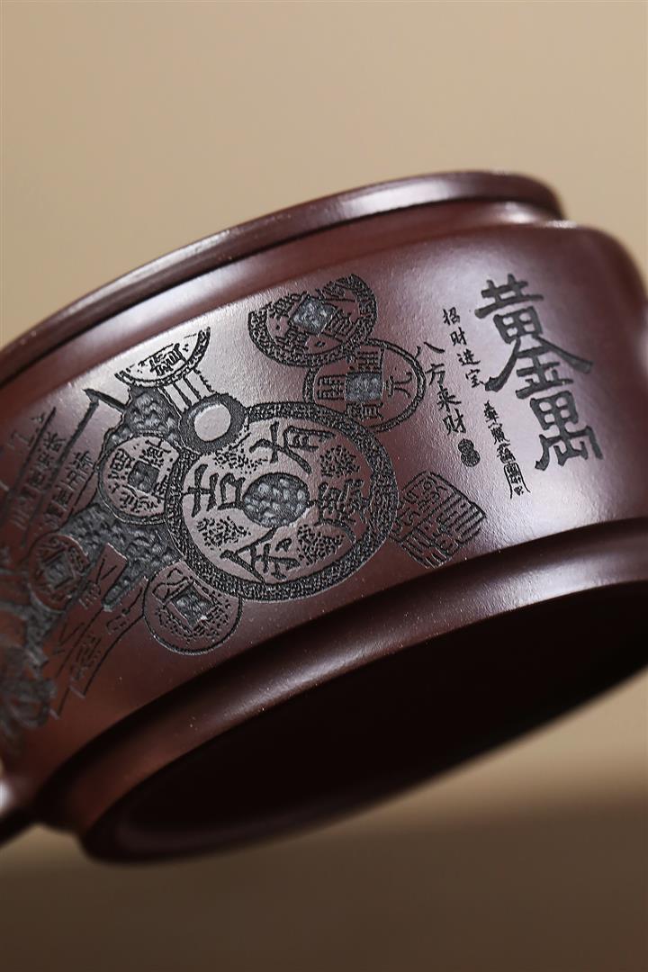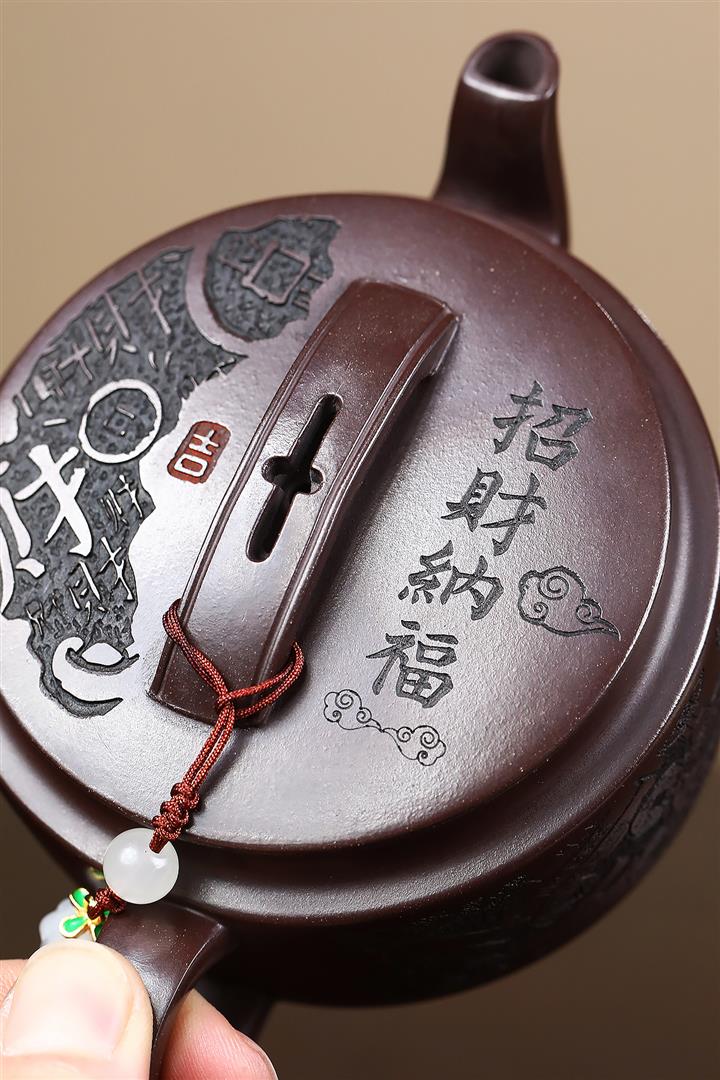 原礦老紫泥手工刻字招財進寶漢瓦茶壺POT6787