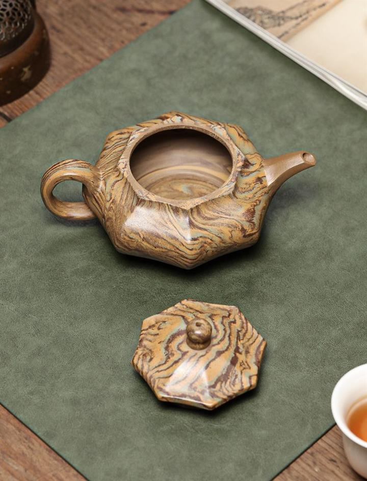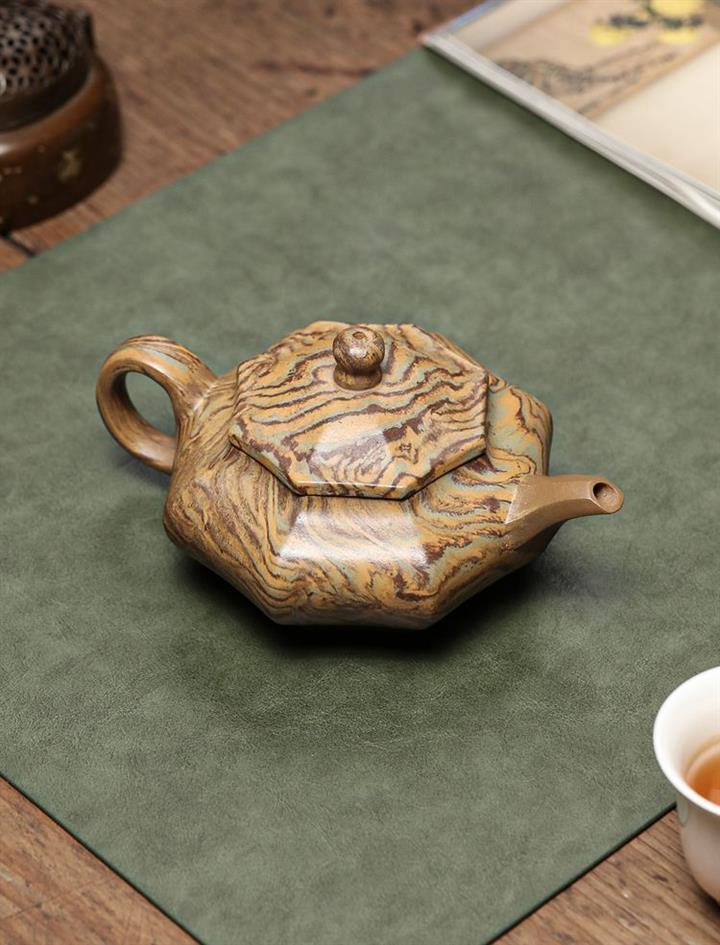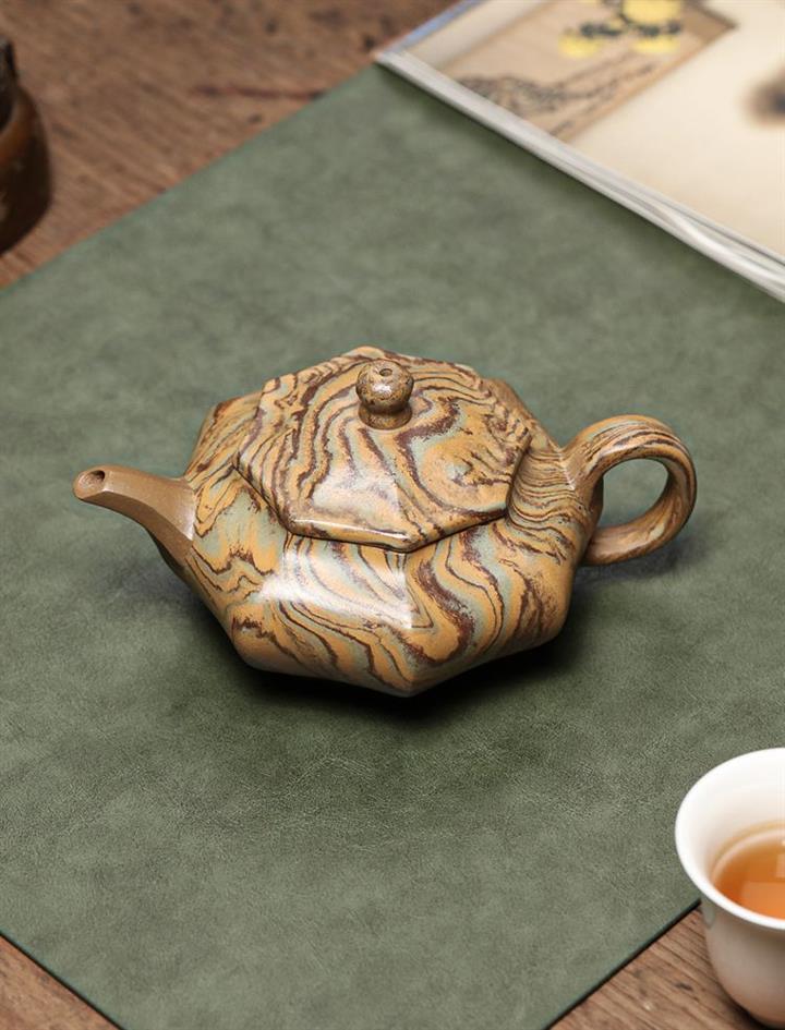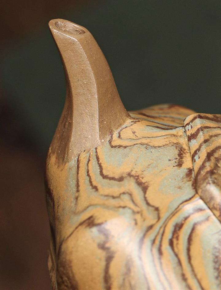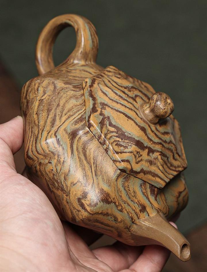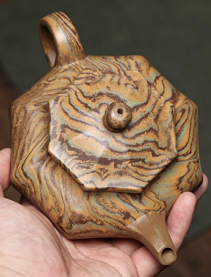 【介紹】此壺在中又加上八方造型,嘴微彎,壺身線條流暢,傳統韻味十足。壺身扁韻有致,下身的弧度與平肩形成鮮明對比,顯得典雅絕俗。此壺在流與壺體銜接處做得有如天成,小巧而不失勁道。