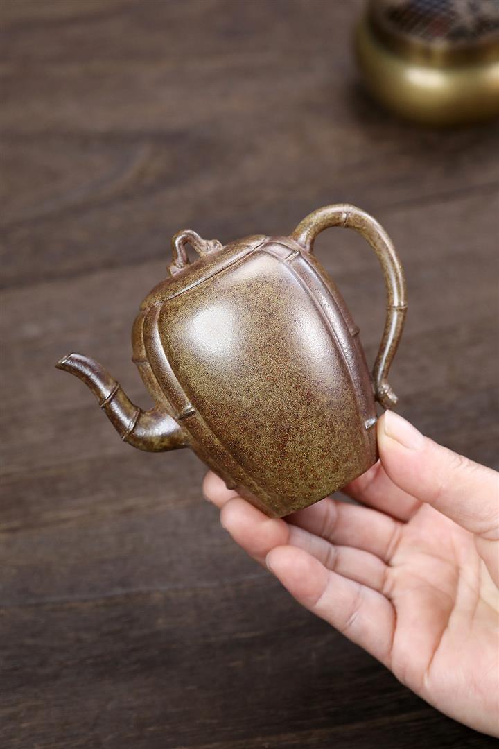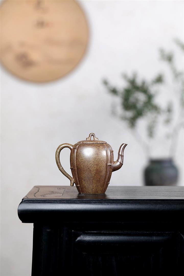 【泥料特點】砂土氣重,似淳實農民,日久使用,漸露鋒芒,養成變化甚大,溫潤莊重。線條優美自然,嘴把搭配協調,身桶配上細長的把搭配,更顯優生動……