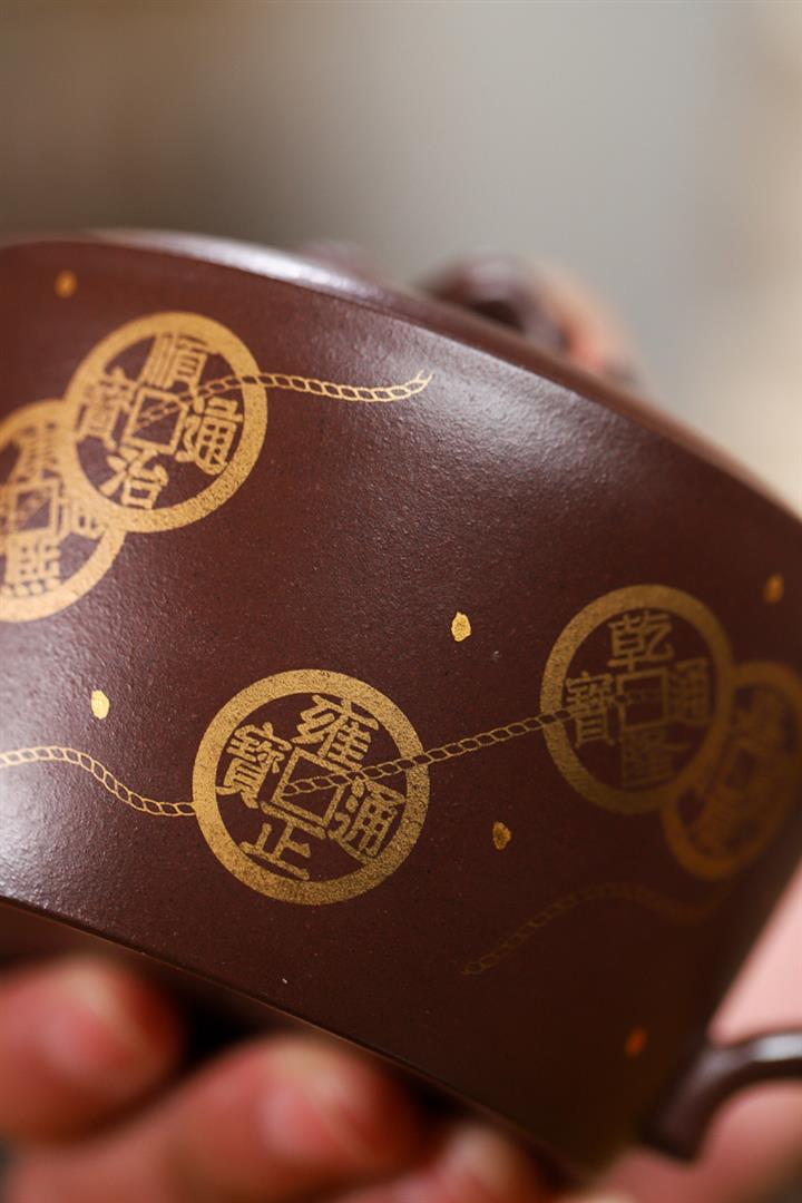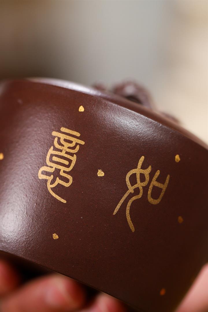 嵌蓋,與壺肩融於一個平面。壺肩層層圓環相繞。與之相呼應,壺底同樣有突出的圓環圍在壺身下方。壺身覆滿鑲金字。