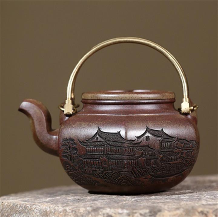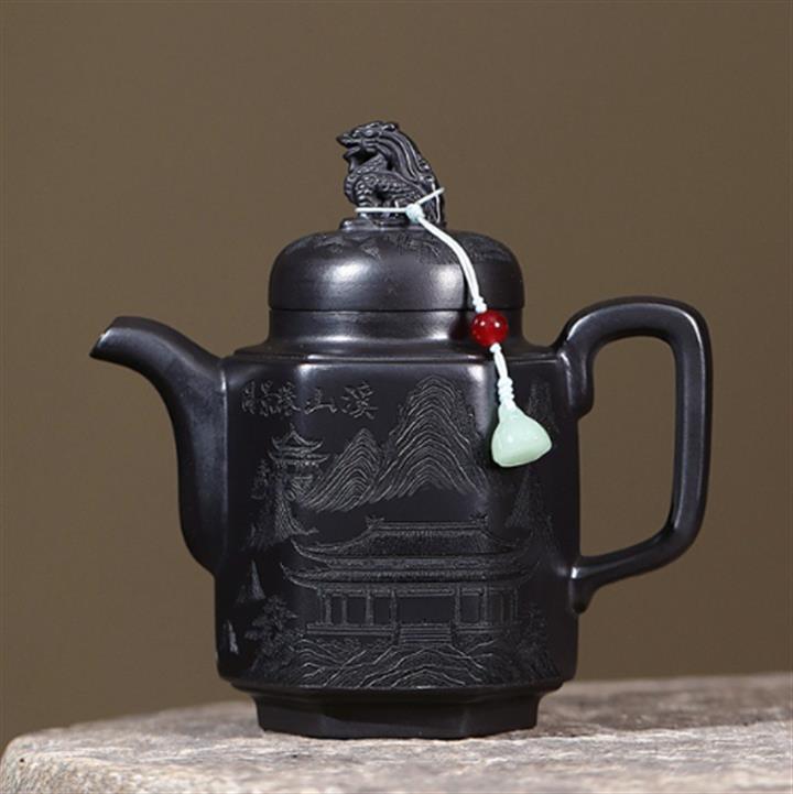 原礦石黃刻繪觀山汲直茶壺POT6981