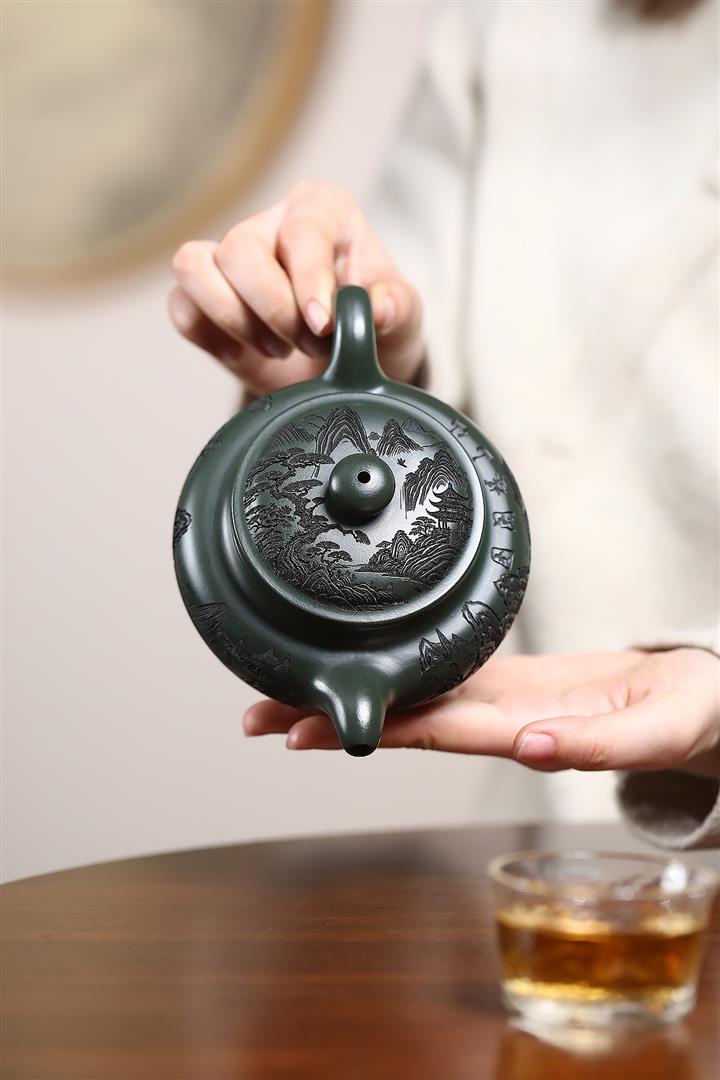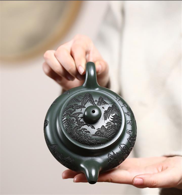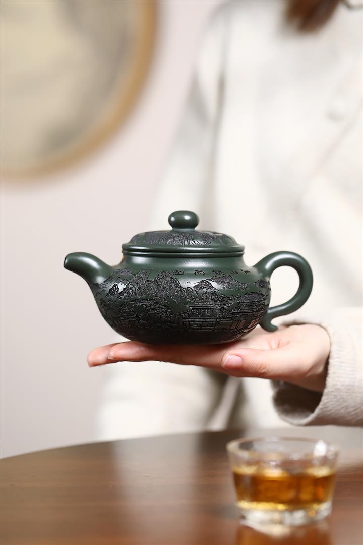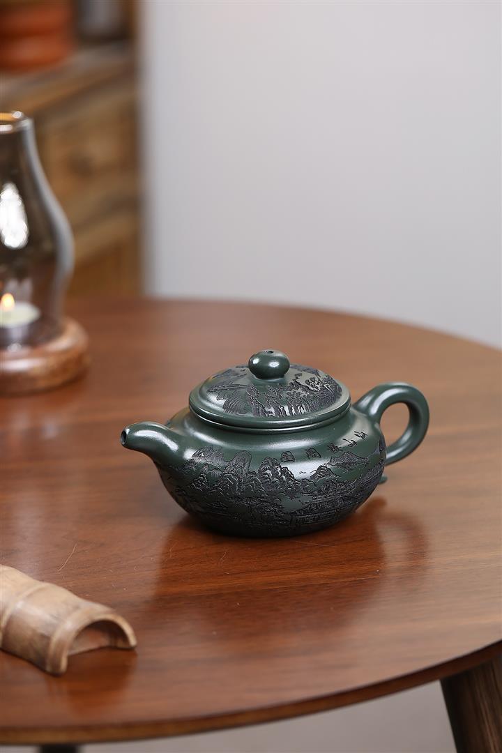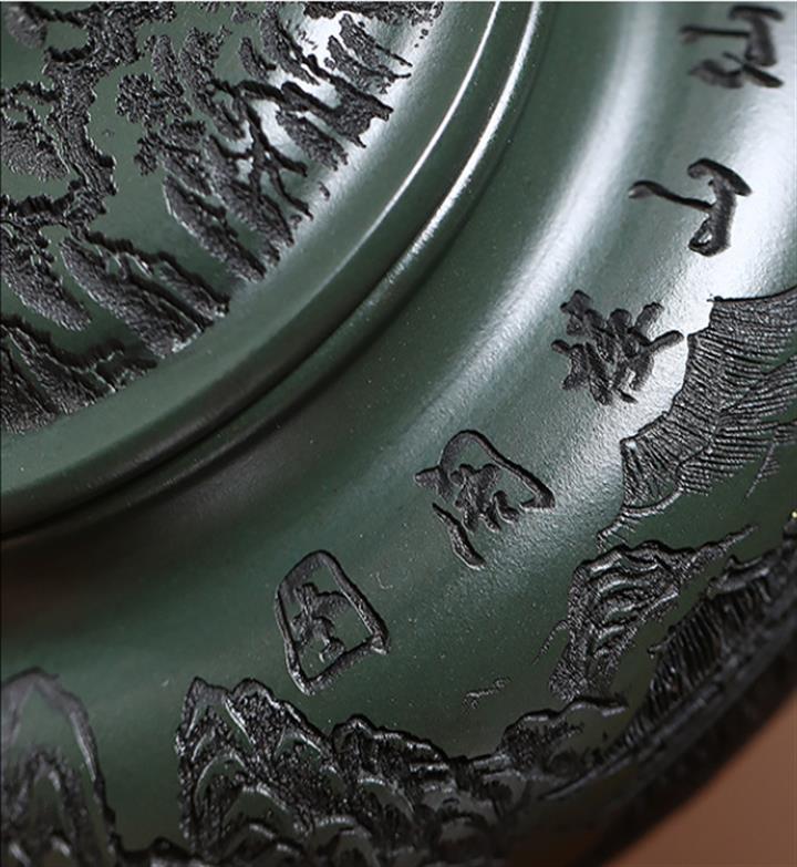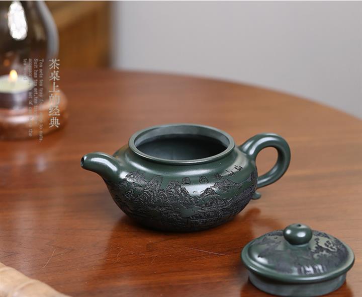 原礦墨綠泥手工刻畫山水仿古茶壺POT6930