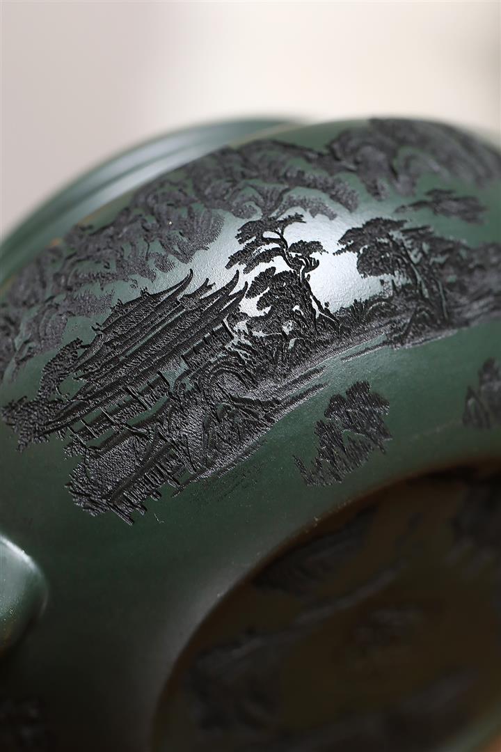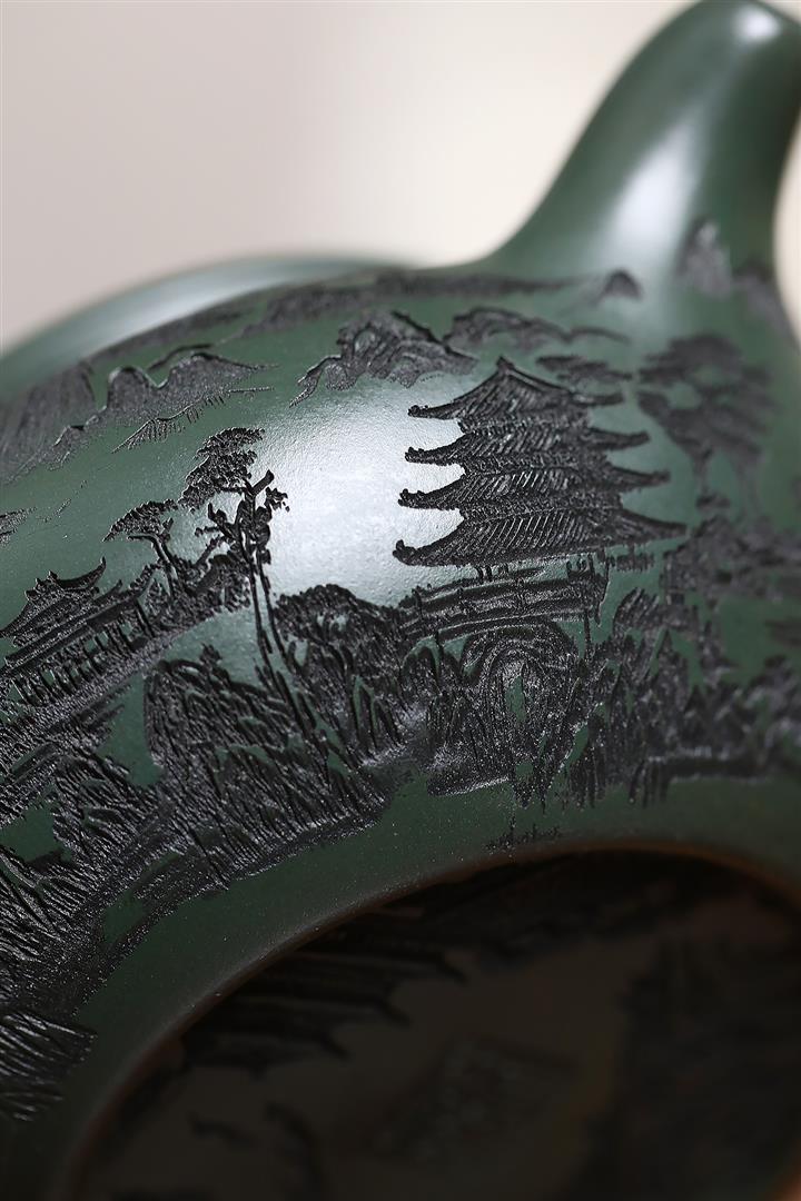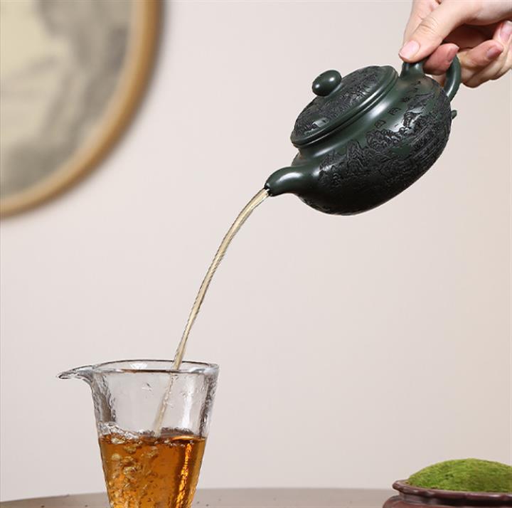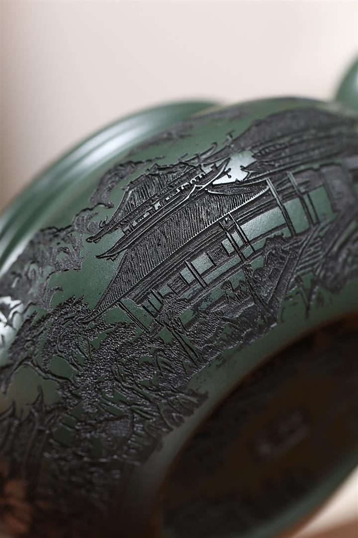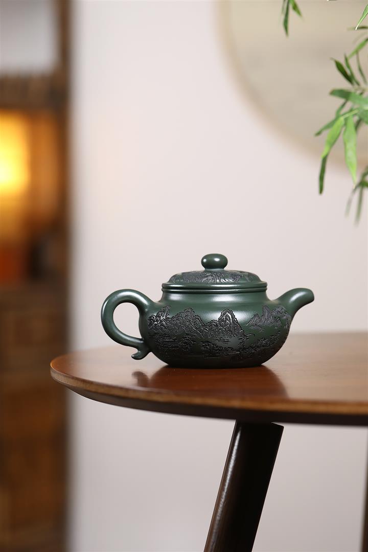 原礦墨綠泥手工刻畫山水仿古茶壺POT6930