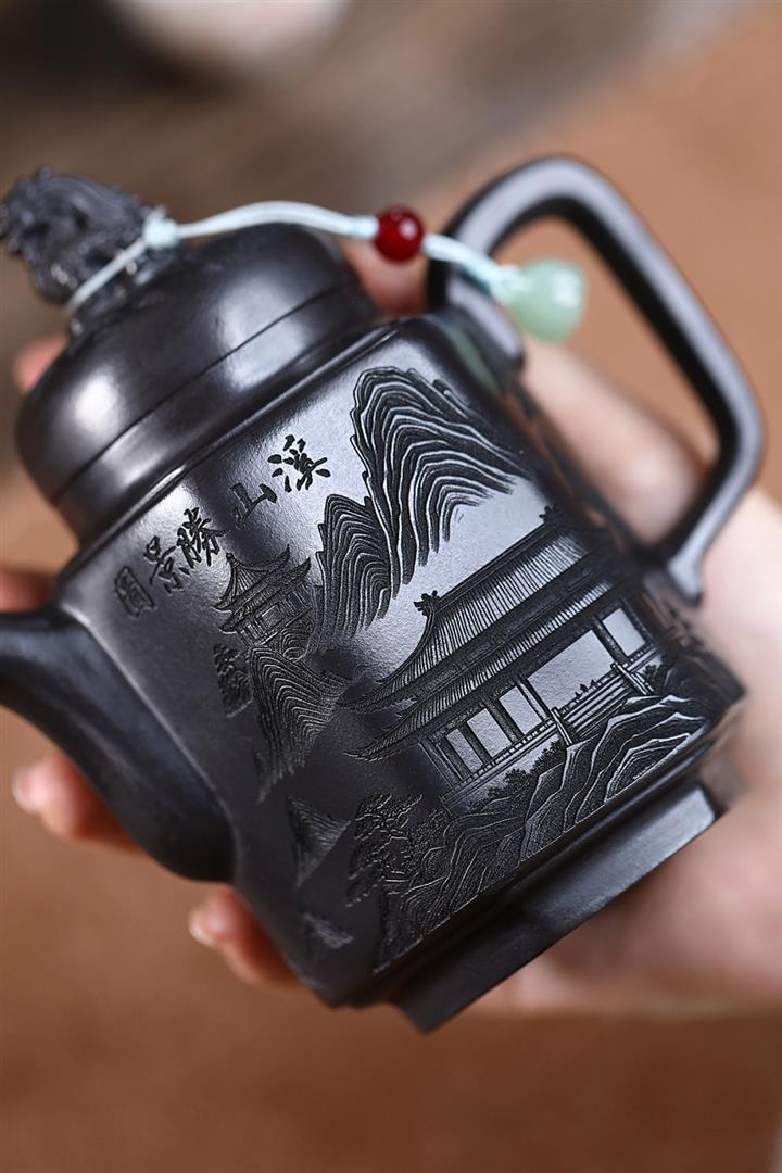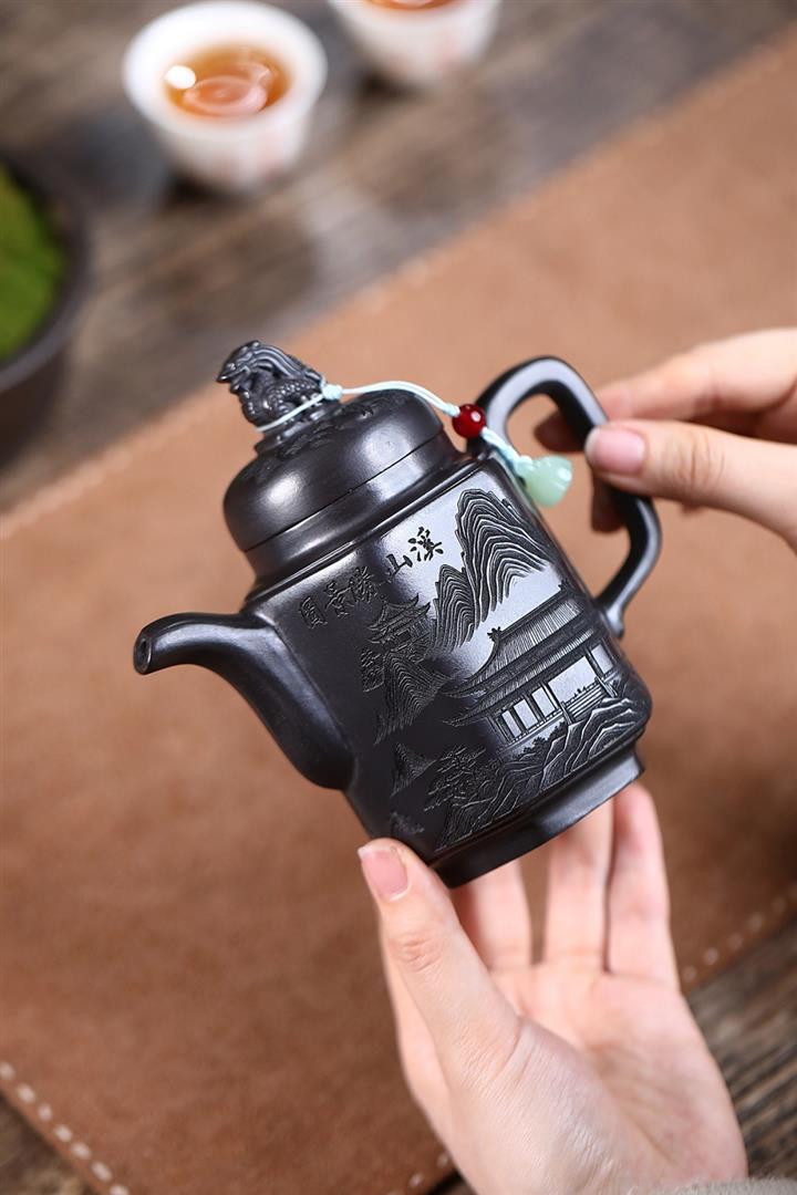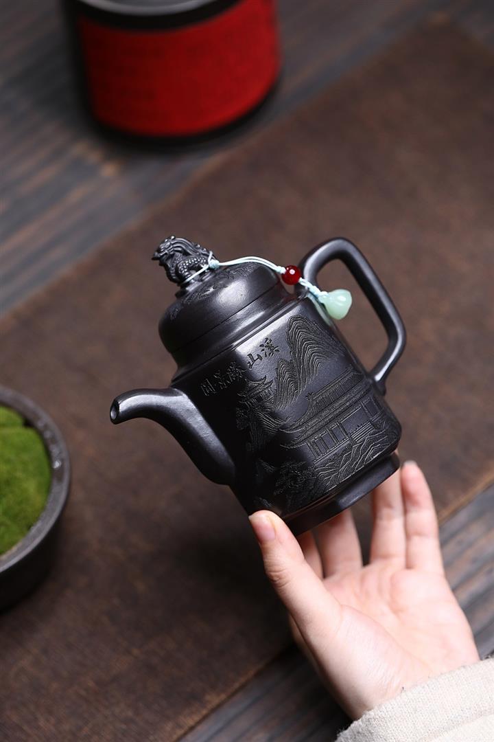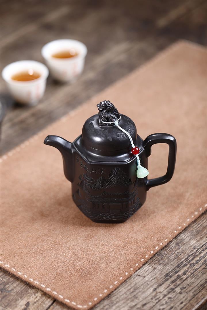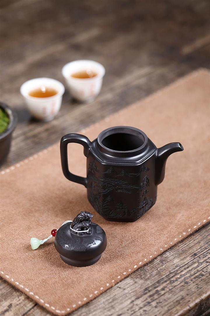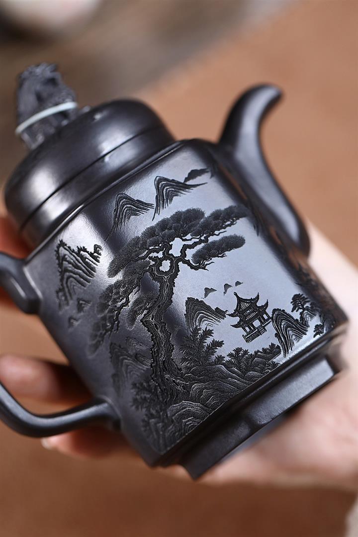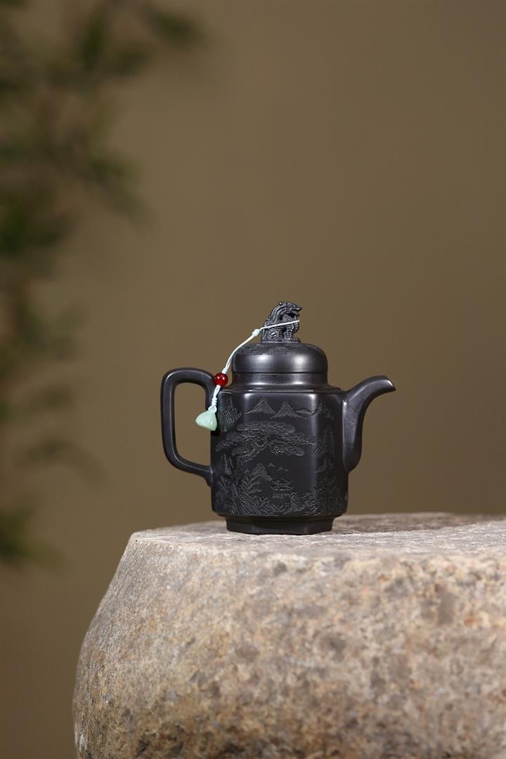 原礦石黃刻繪觀山汲直茶壺POT6981