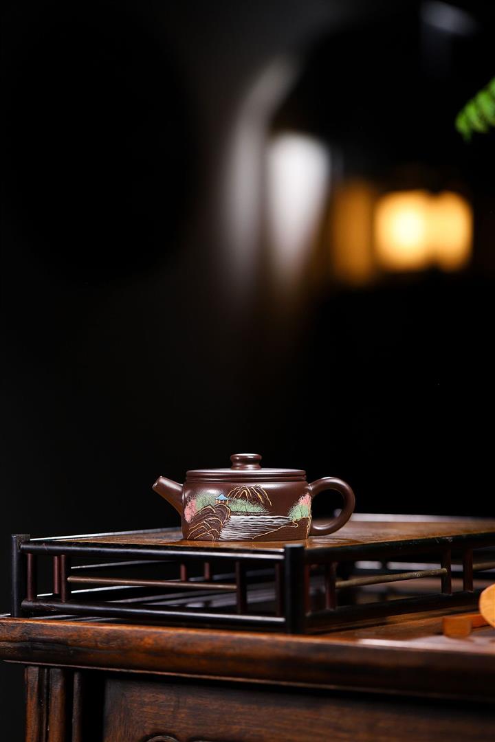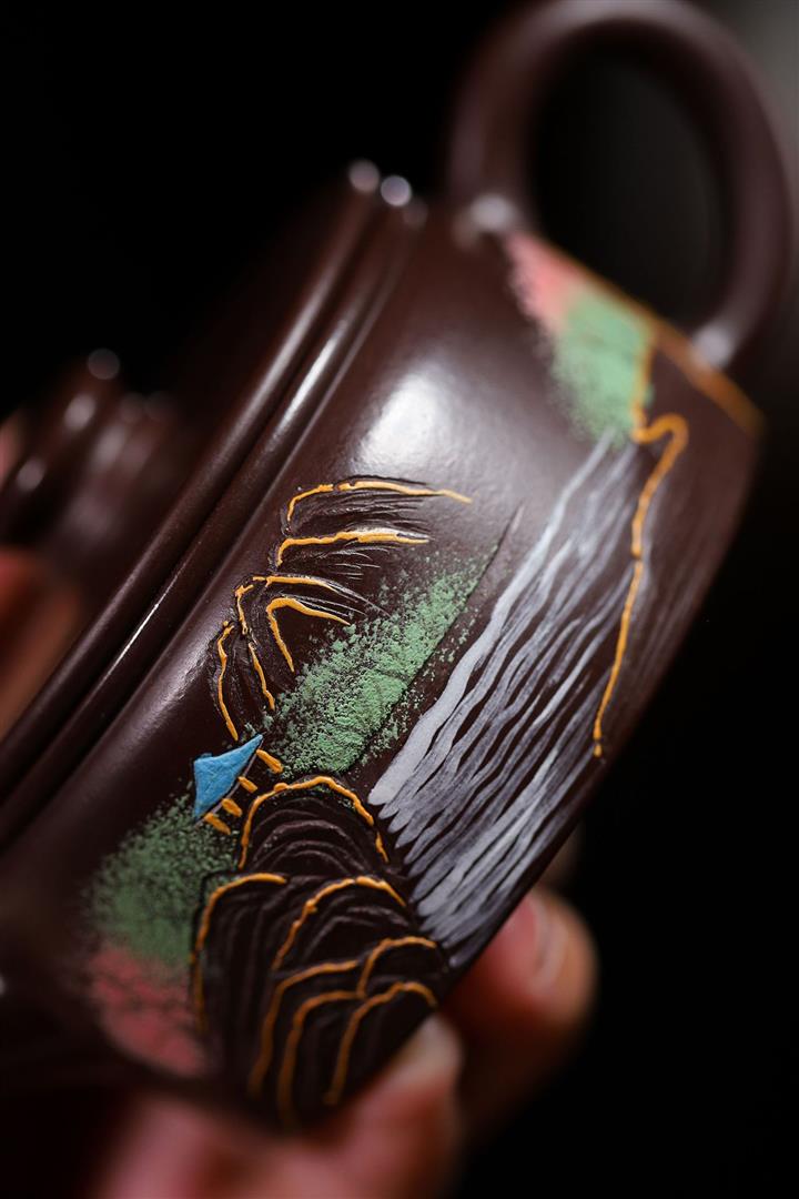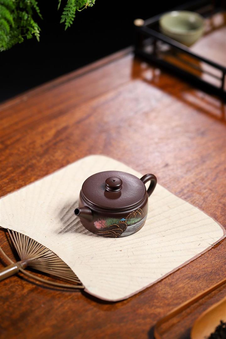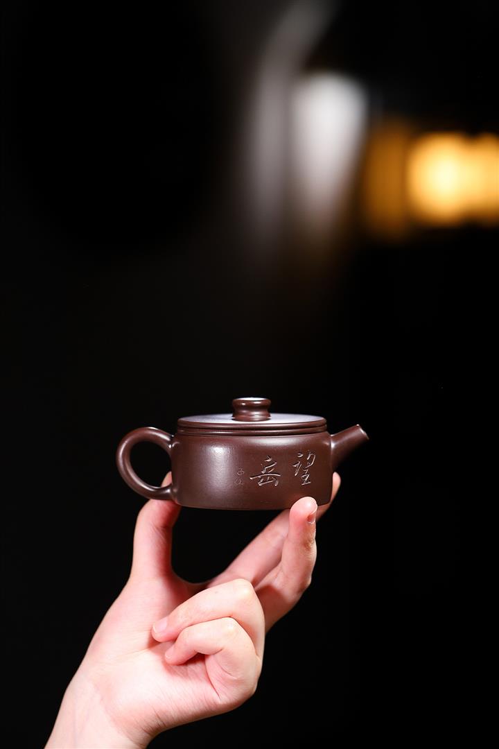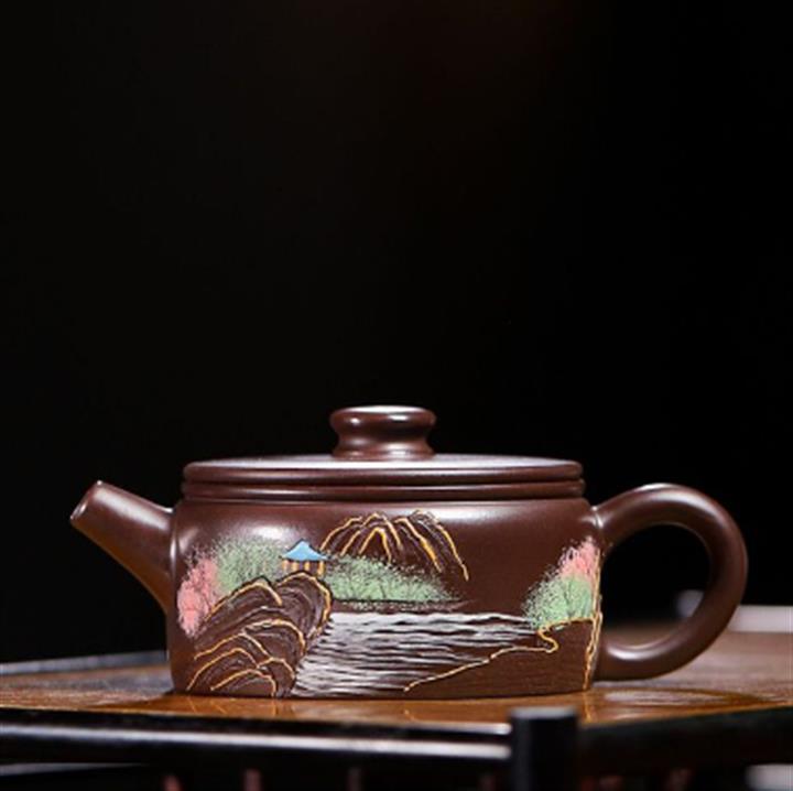 原礦墨綠泥手工滿刻觀山洋桶茶壺POT7107