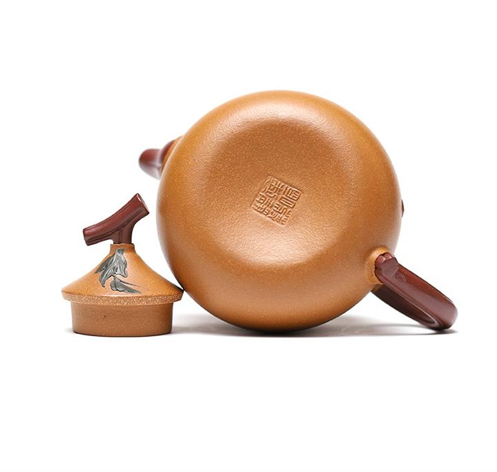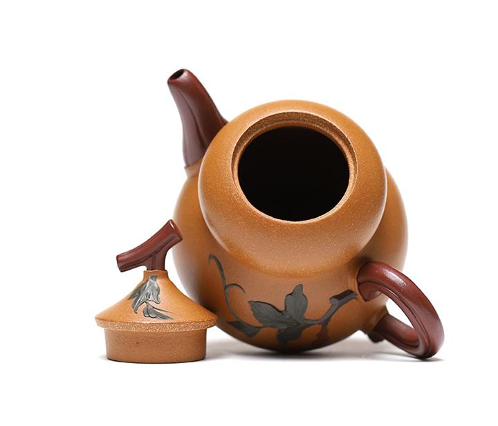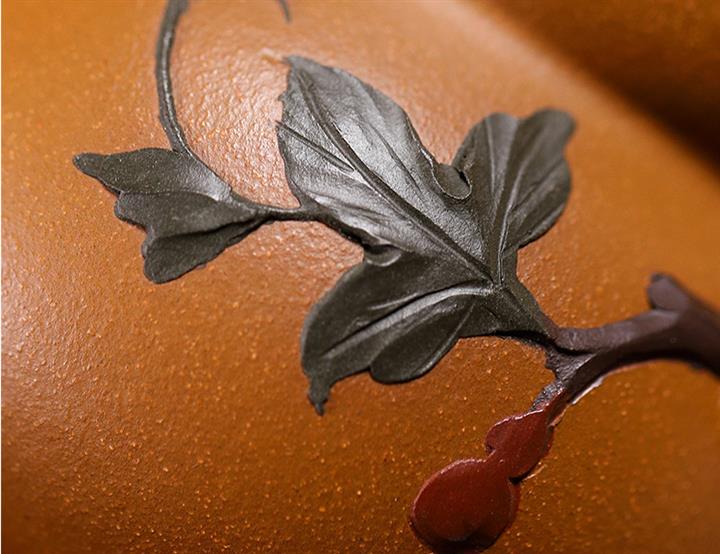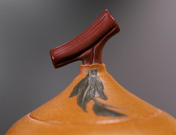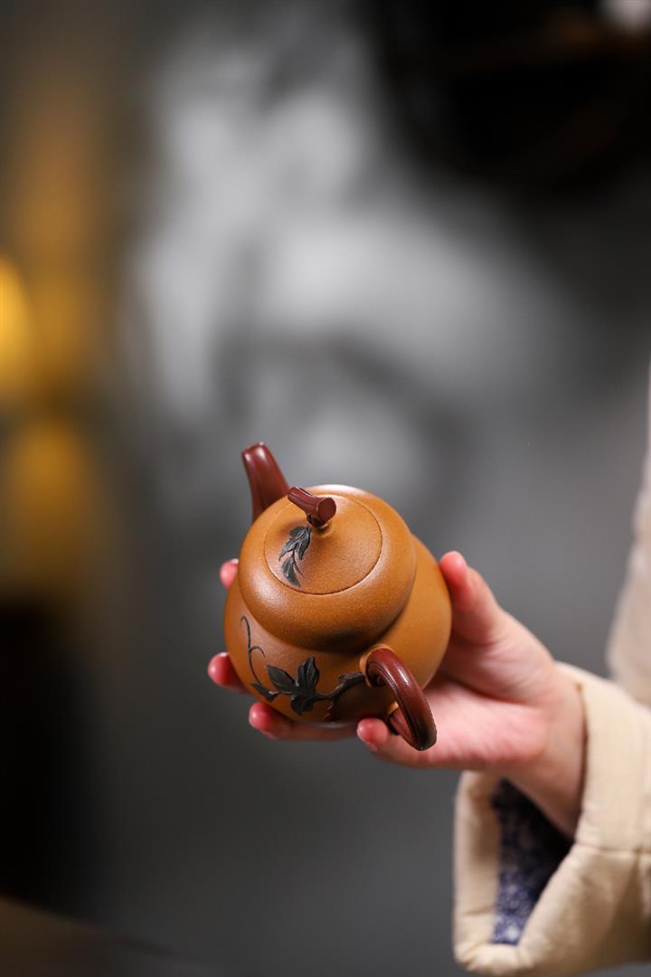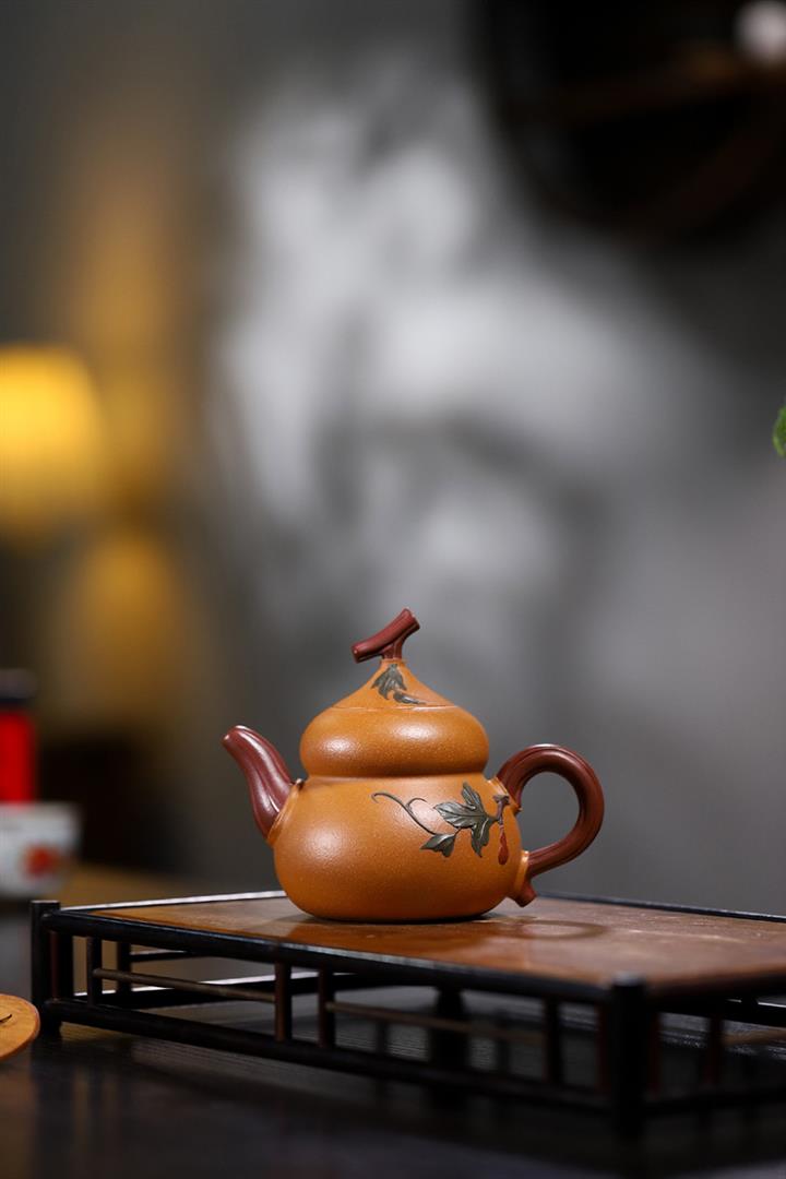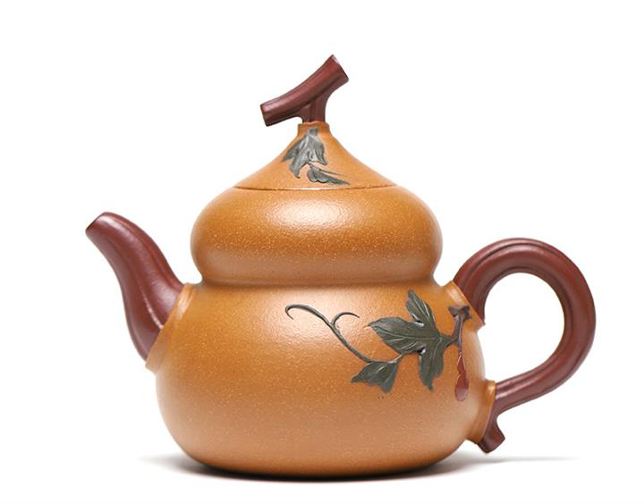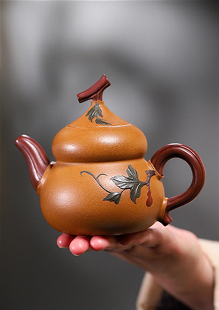 【簡介】此壺作葫蘆狀,上小下大,口內斂,略束腰,下腹微鼓。點睛之筆在壺鈕,瓜蒂狀凹陷,與壺蓋融為壹體,是仿的自然界中的葫蘆藤蔓,遠觀楚楚動人,提捏優雅大方。