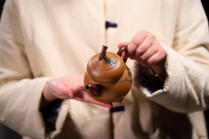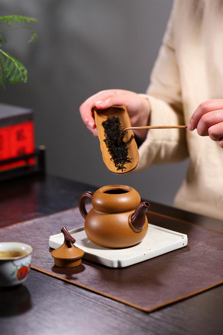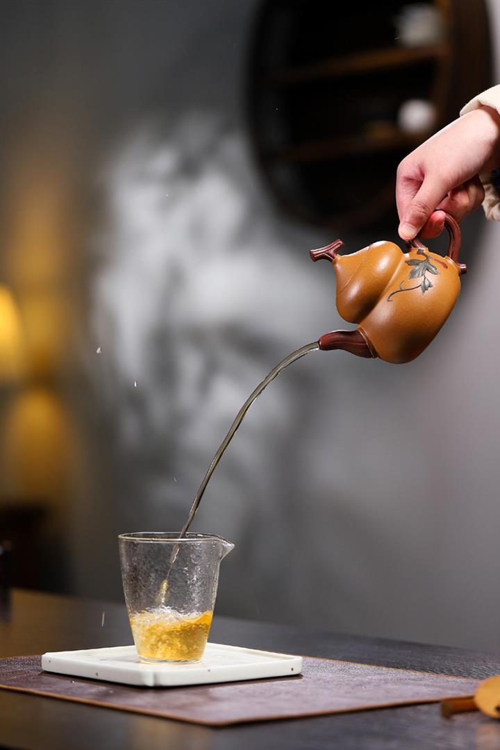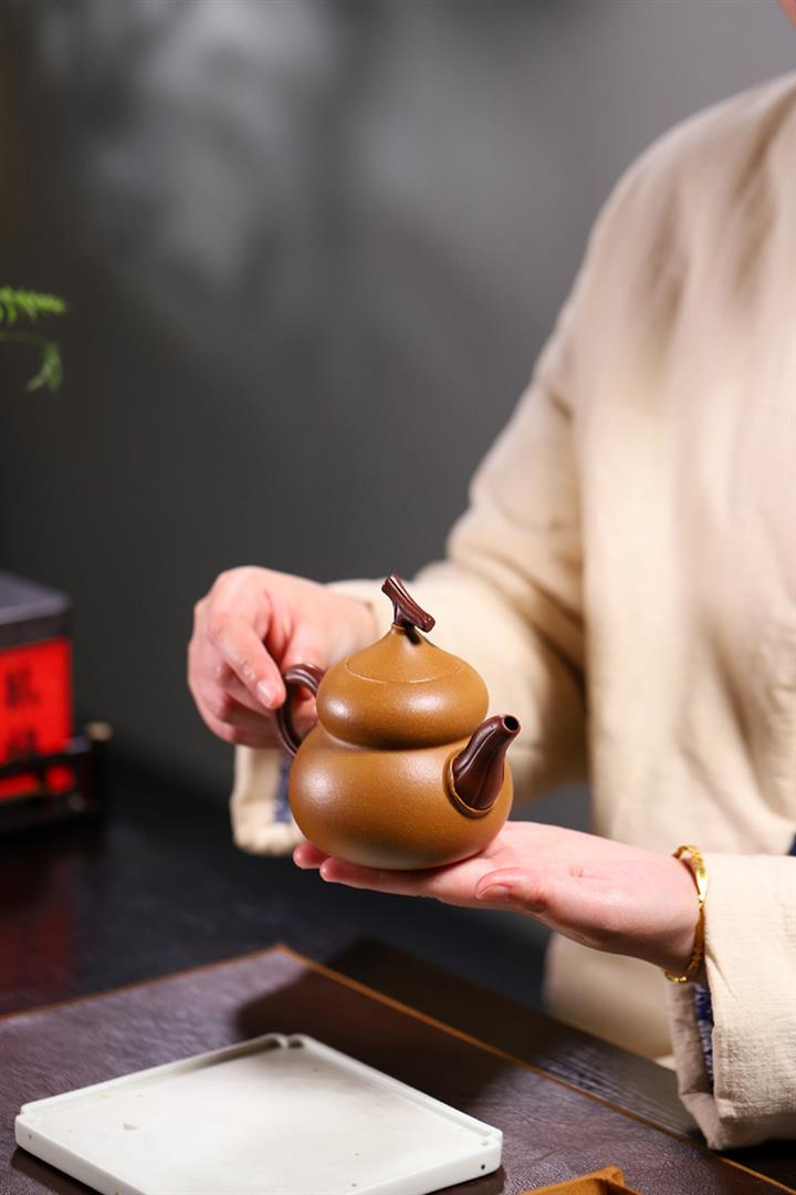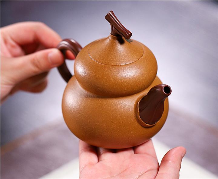 嘴出水爽利瀟灑,執把成環弧狀,呈倒耳線條飽滿,拿捏方便。葫蘆作為傳統吉祥文化的代表,於紫砂中展現更無窮的魅力,壹把寓意美好又富有文人氣韻的葫蘆壺,值得壹賞。
