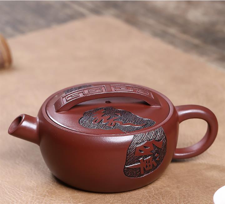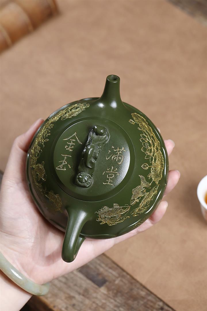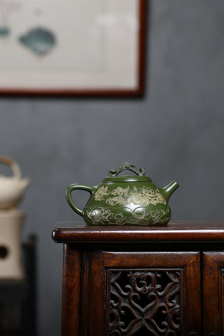 原礦紫泥刻繪金鱗魚罩茶壺POT7027