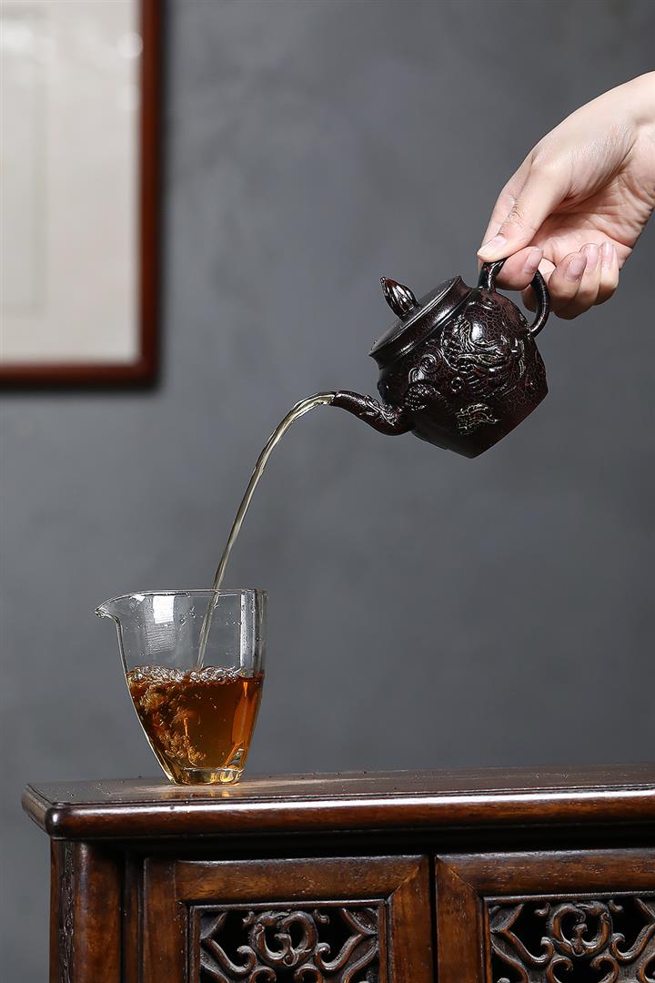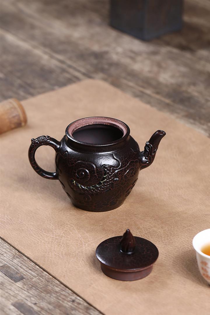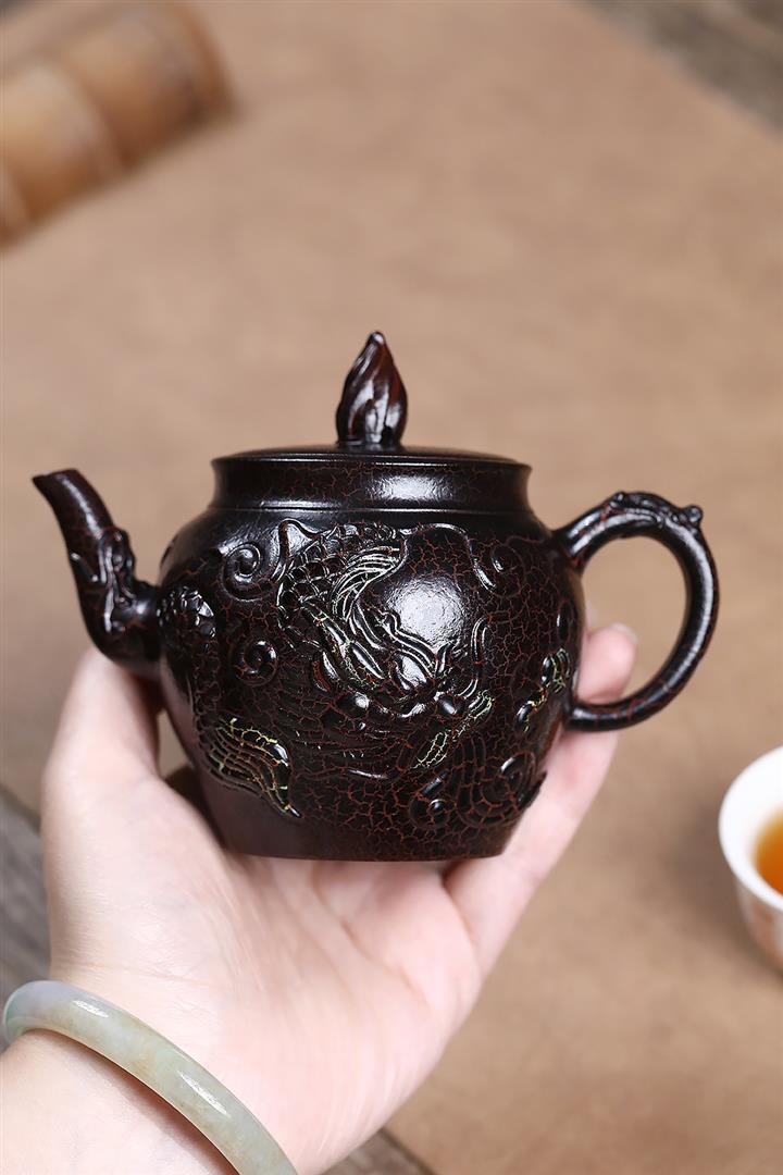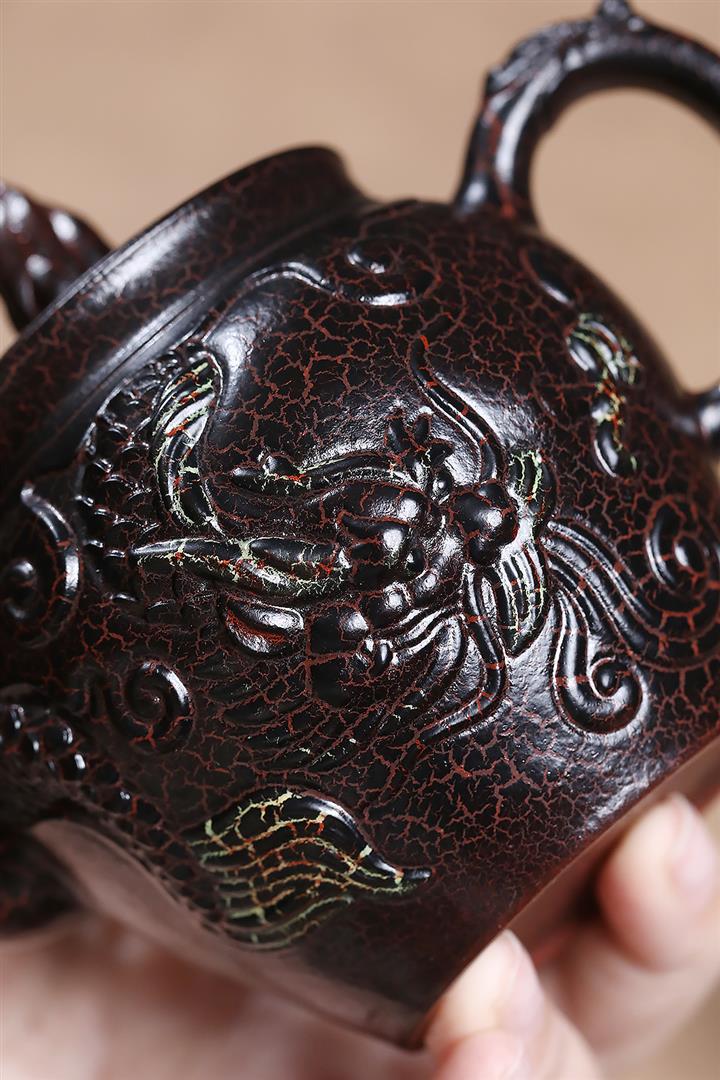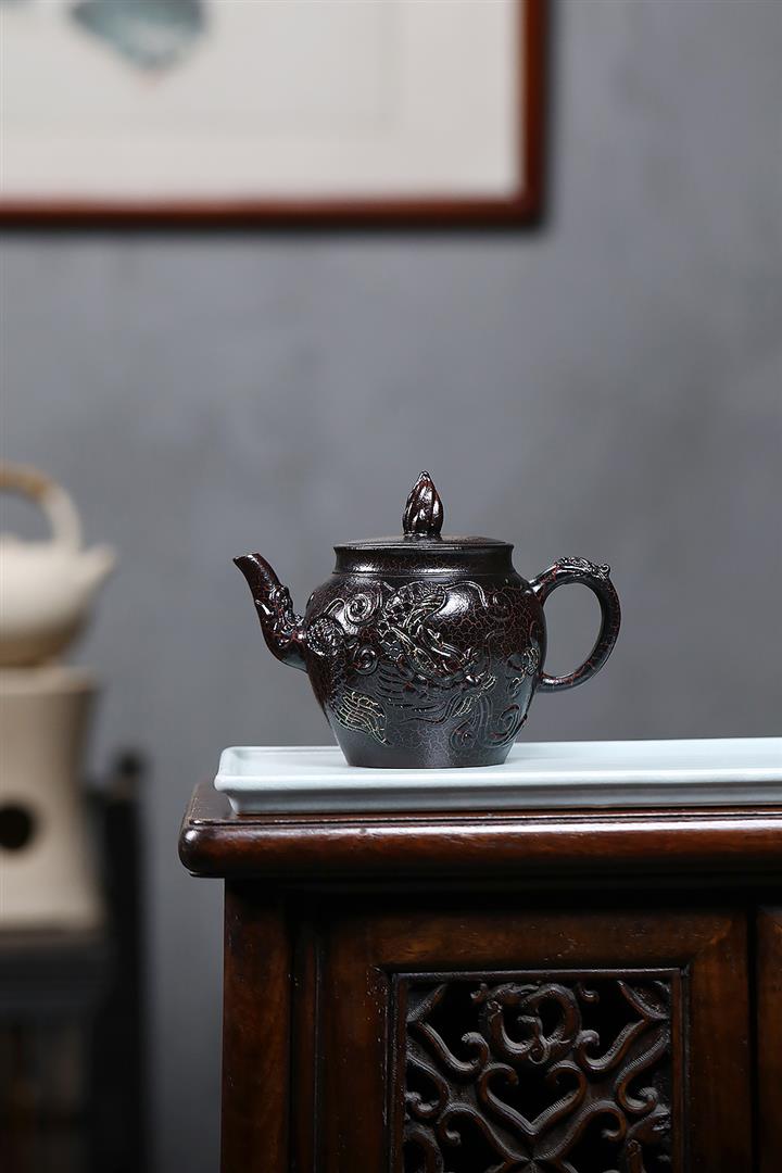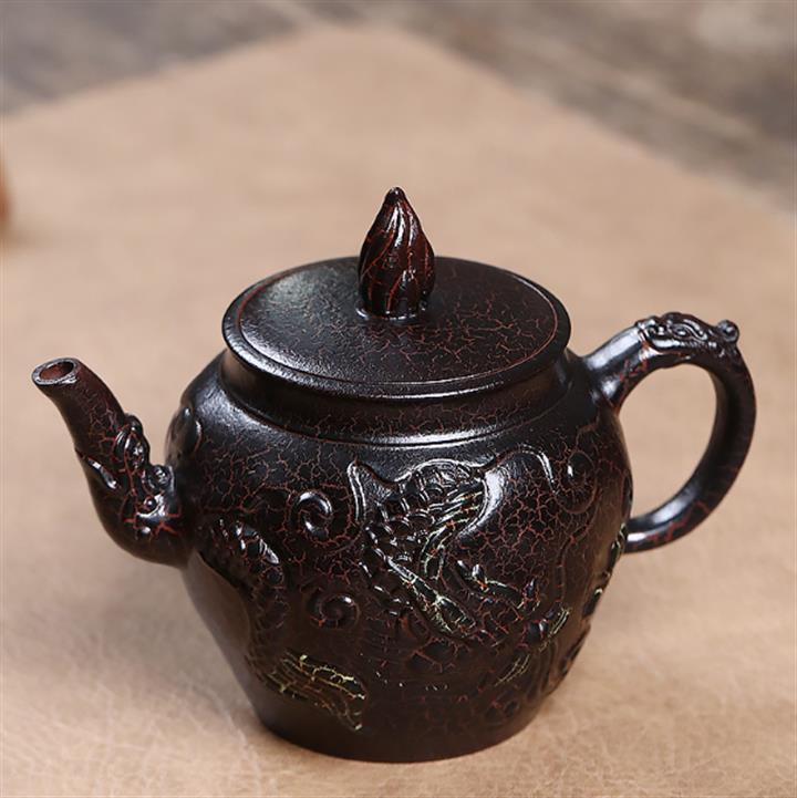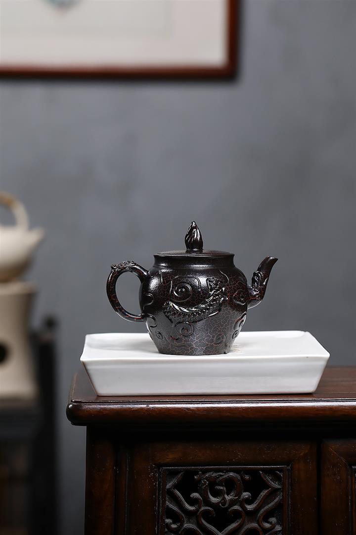 原礦紫泥刻繪金鱗魚罩茶壺POT7027